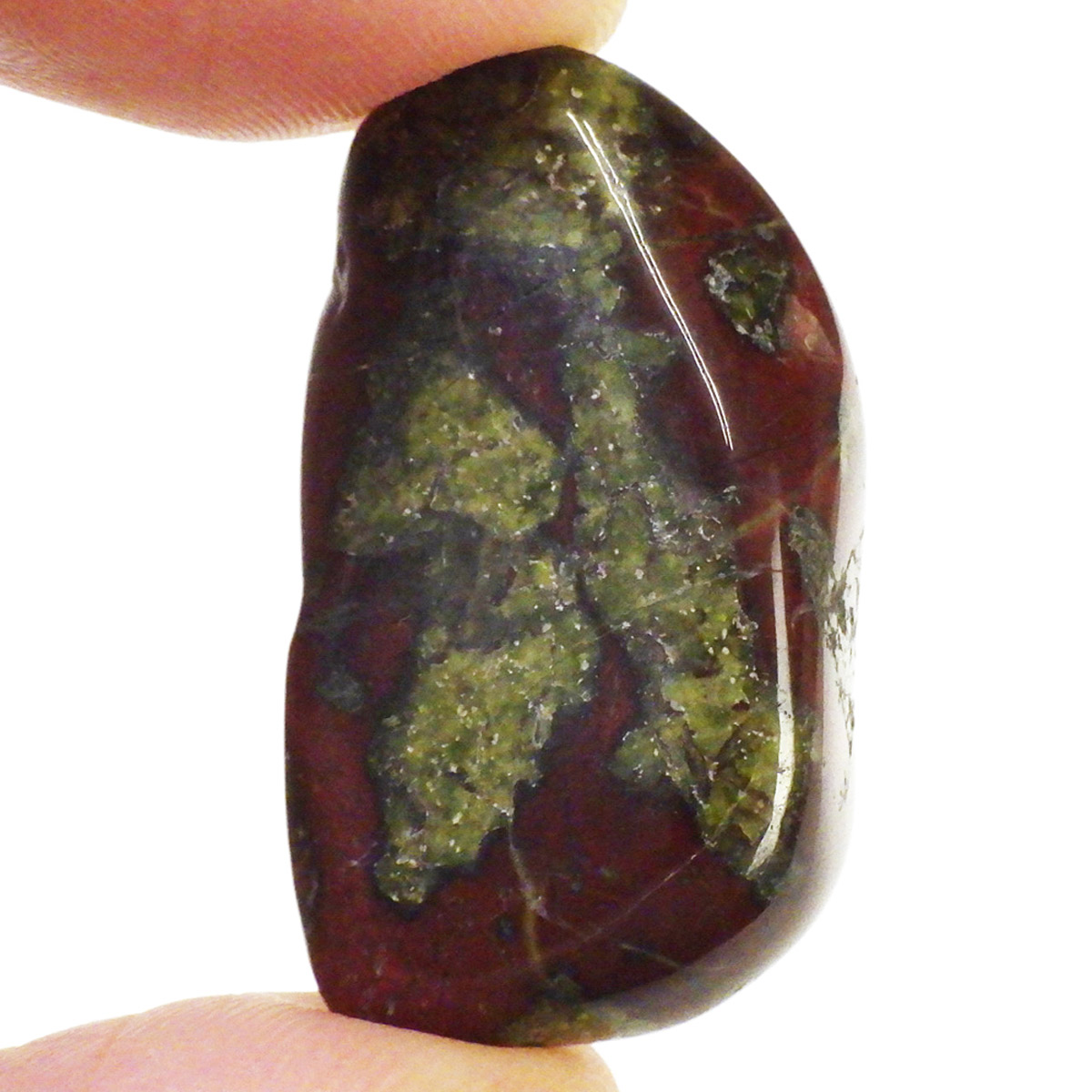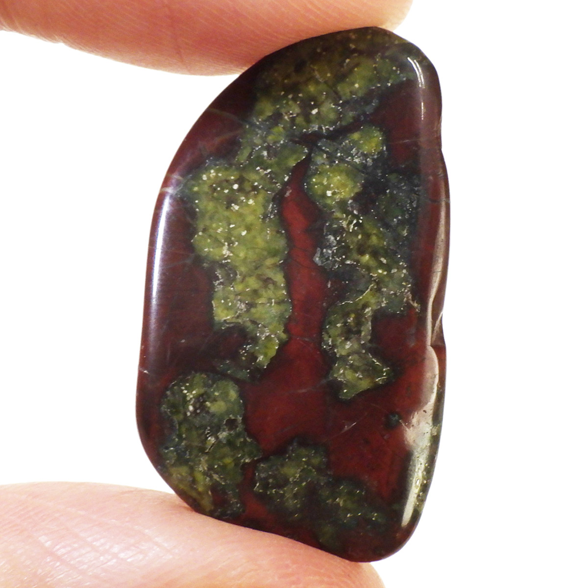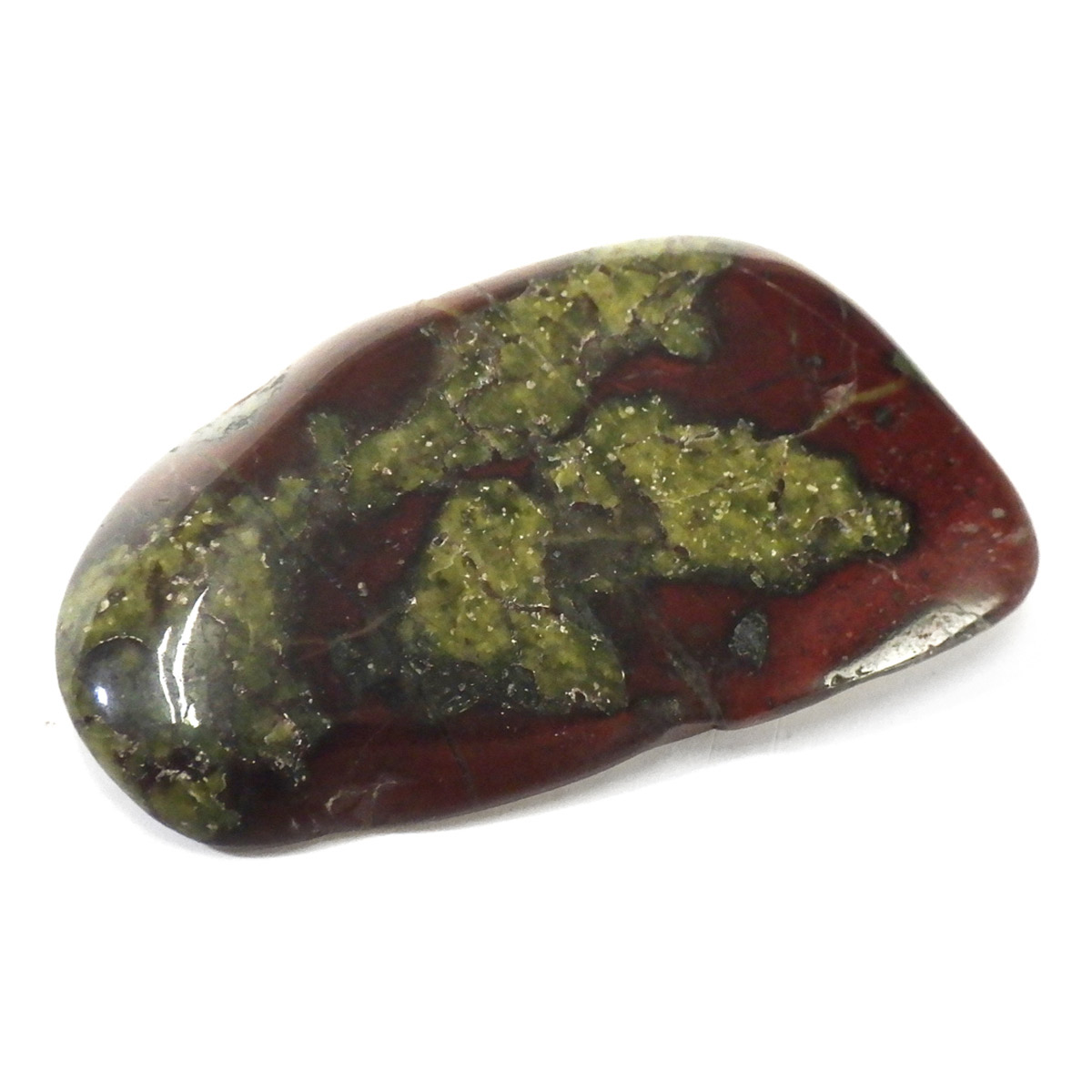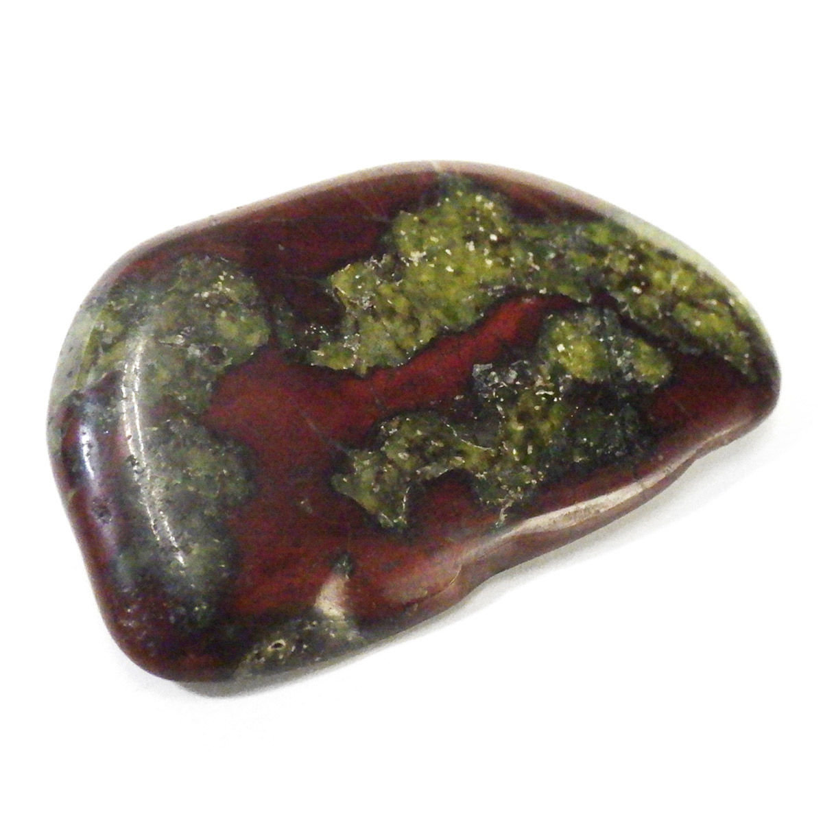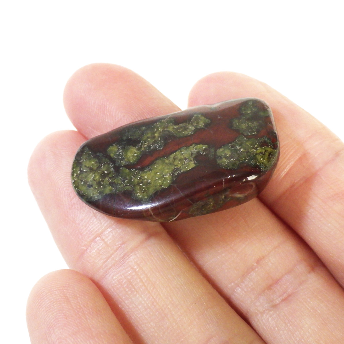 現在では南アフリカまたはオーストラリアで産出される石のようです。ドラゴンストーンまたはドラゴンブラッドジャスパーと呼ばれます。これは、ドラゴンの皮膚を思わせる緑色に、ドラゴンの血をイメージさせる赤い点や筋が入っていることから名付けられています。日本ではあまり文献がないのですが基本はジャスパーだと思われます。こちらは磨いたタンブルですが、原石の状態ですとドラゴン模様の緑の石に本当にドラゴンの血が付いたのではと思わせられます。見た目は綺麗というよりは力強くかっこいい石です。