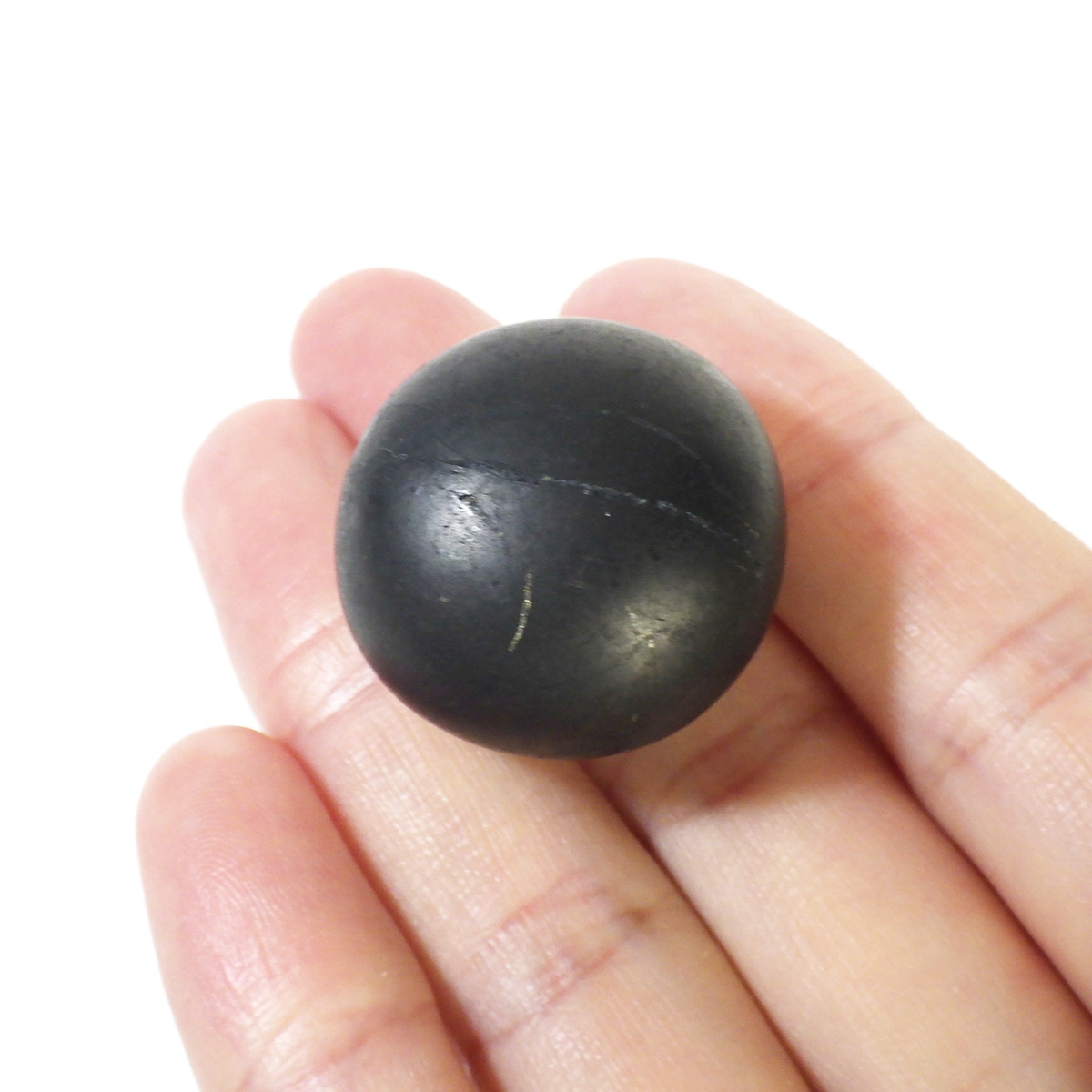 ロシア・カレリア産のシュンガイト、タンブルです。マットな質感で悪いものを吸収してくれそうな感じがあります。所々に金色のキラキラしたパイライトが見られます。このパイライトにより、真っ黒なシュンガイトに、ちょっとした表情が見えます。マットな艶感にコロンとした姿が愛らしいです。