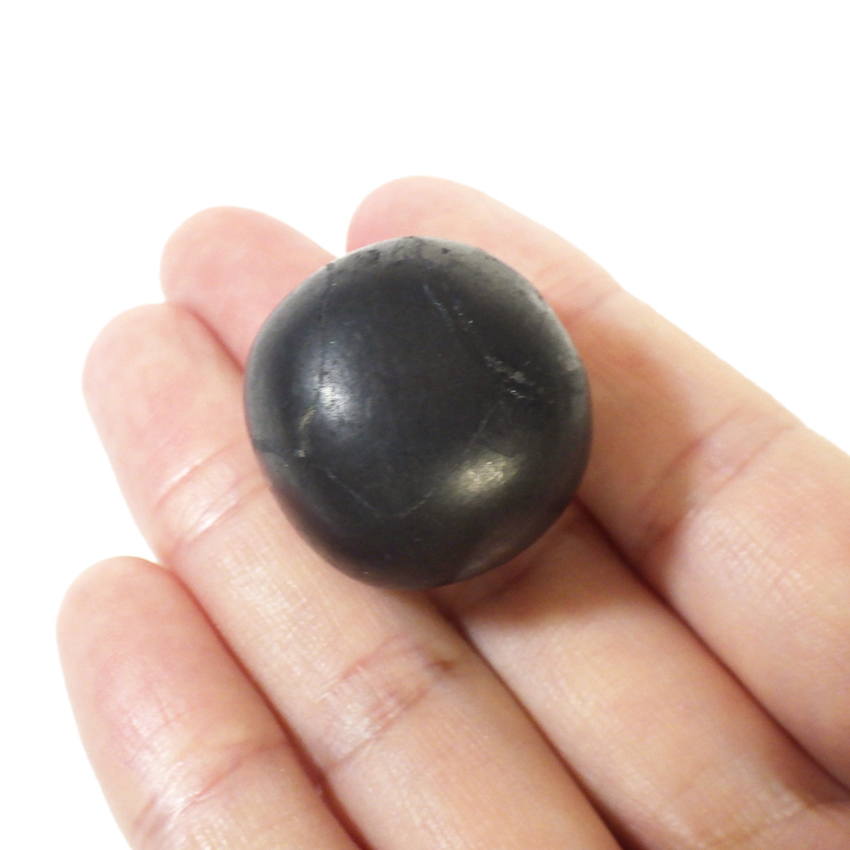 ロシア・カレリア産のシュンガイト、タンブルです。マットな質感で悪いものを吸収してくれそうな感じがあります。所々に金色のキラキラしたパイライトが見られます。このパイライトにより、真っ黒なシュンガイトに、ちょっとした表情が見えます。マットな艶感にコロンとした姿が愛らしいです。