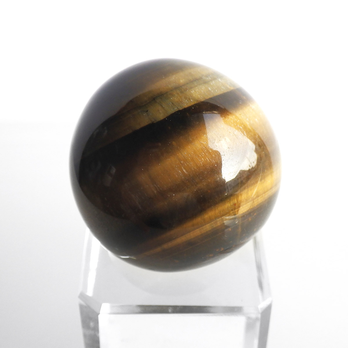 南アフリカ産のタイガーアイ球です。タイガーアイは、キャッツアイ効果で茶色から金色の縞模様が浮かび、輝きが虎の目を連想させる事からタイガーアイと呼ばれるようになりました。 一般的に金運といえばタイガーアイで、水晶やアメジストなどと同等の認知度があり、非常に人気がある石です。