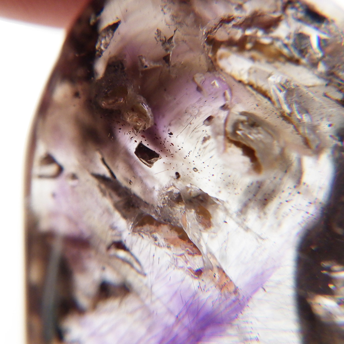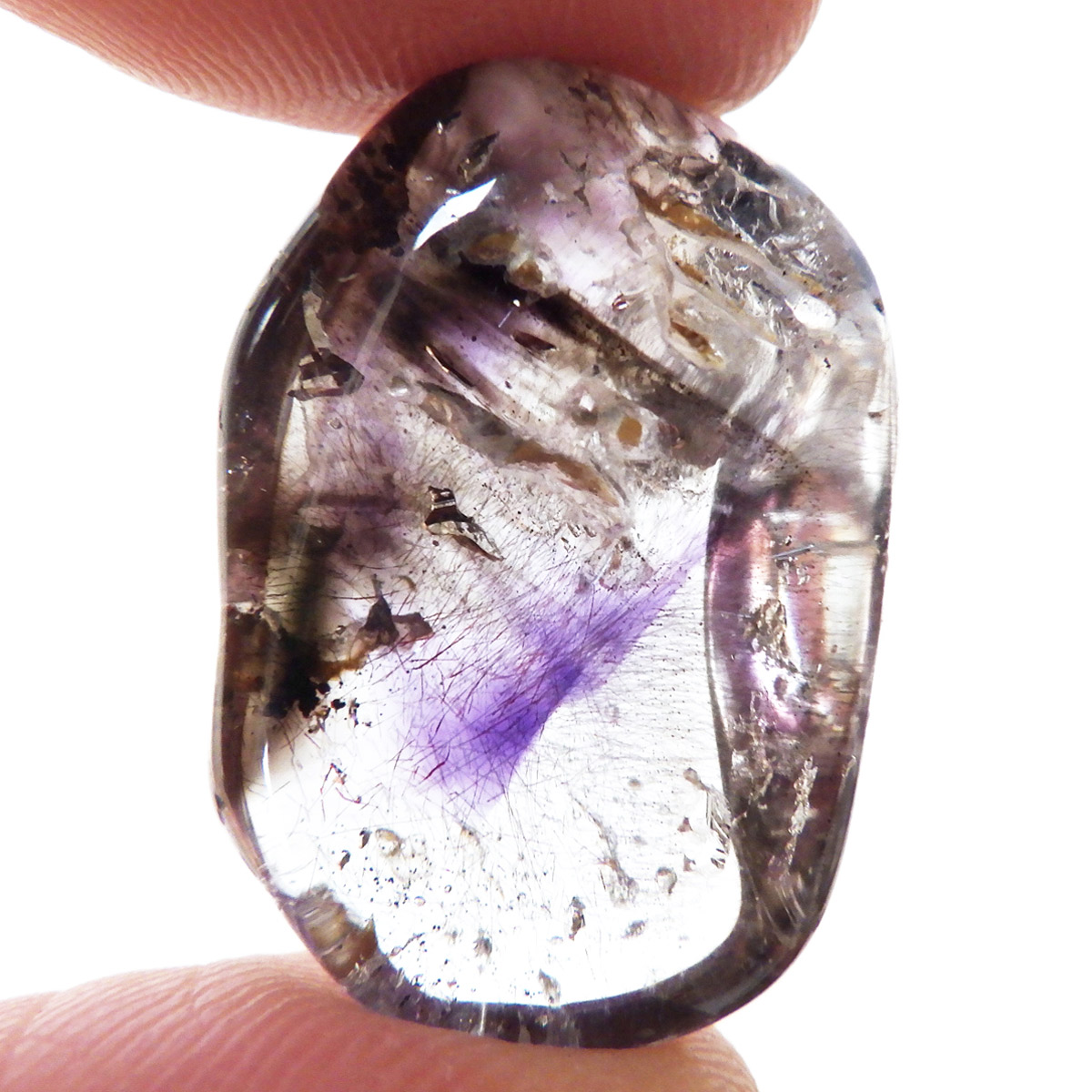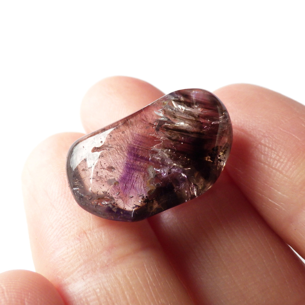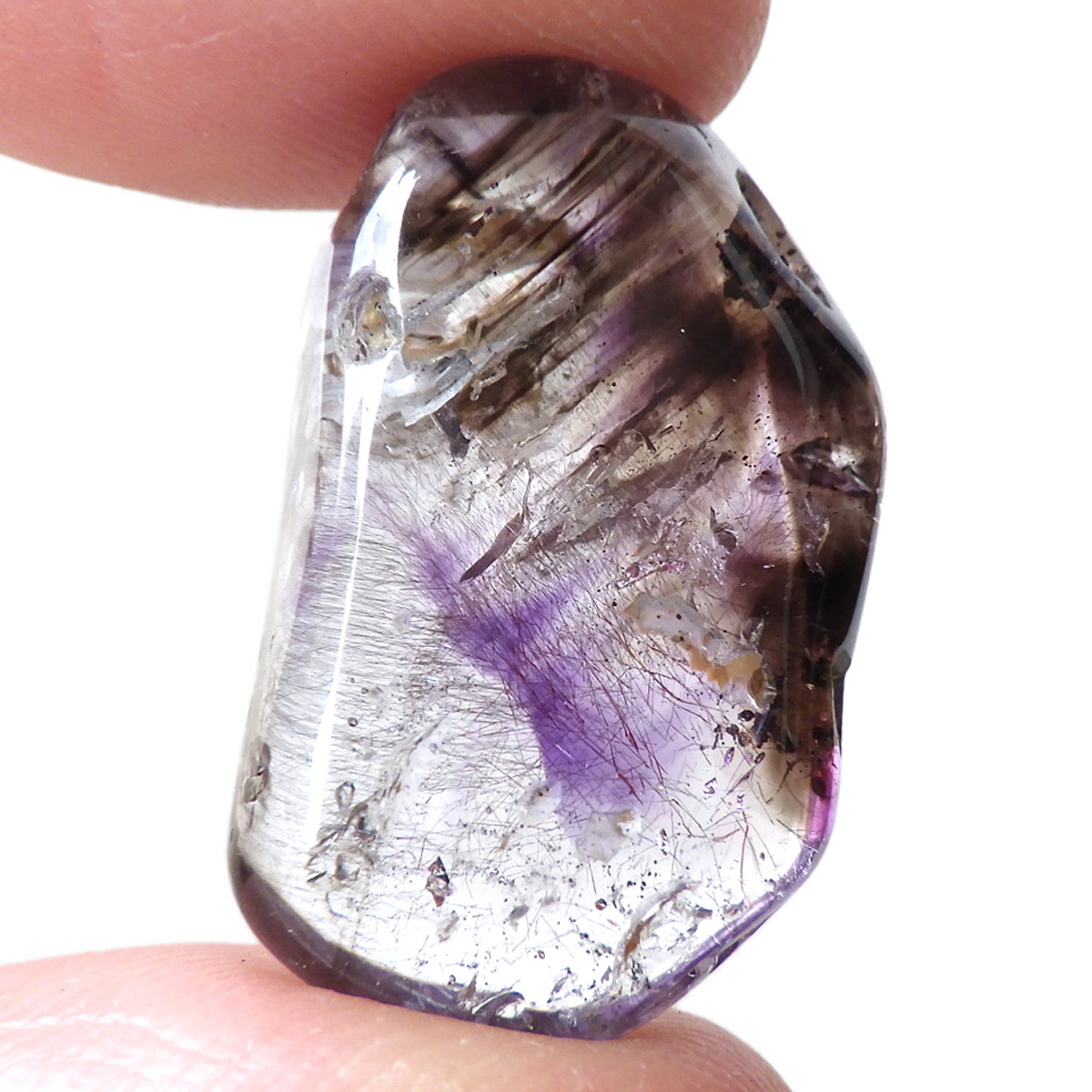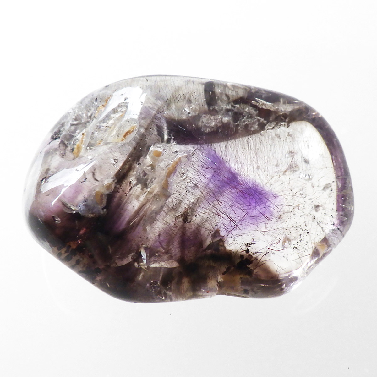 ナミビアのブランドバーグに産するアメジスト、通称ブランドバーグアメジスト、タンブルです。 透明なクォーツ内に煙のようにふわっと漂った美しいクリアなパープルのアメジストと黒いスモーキークォーツが見られます。透明度が高く、内包物がよく見えます。光によって輝く姿がこの産地特有のものでとてもきれいで癒されます。