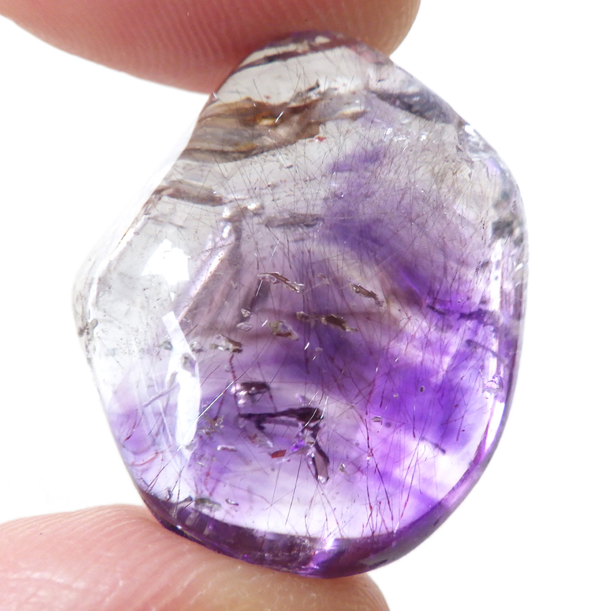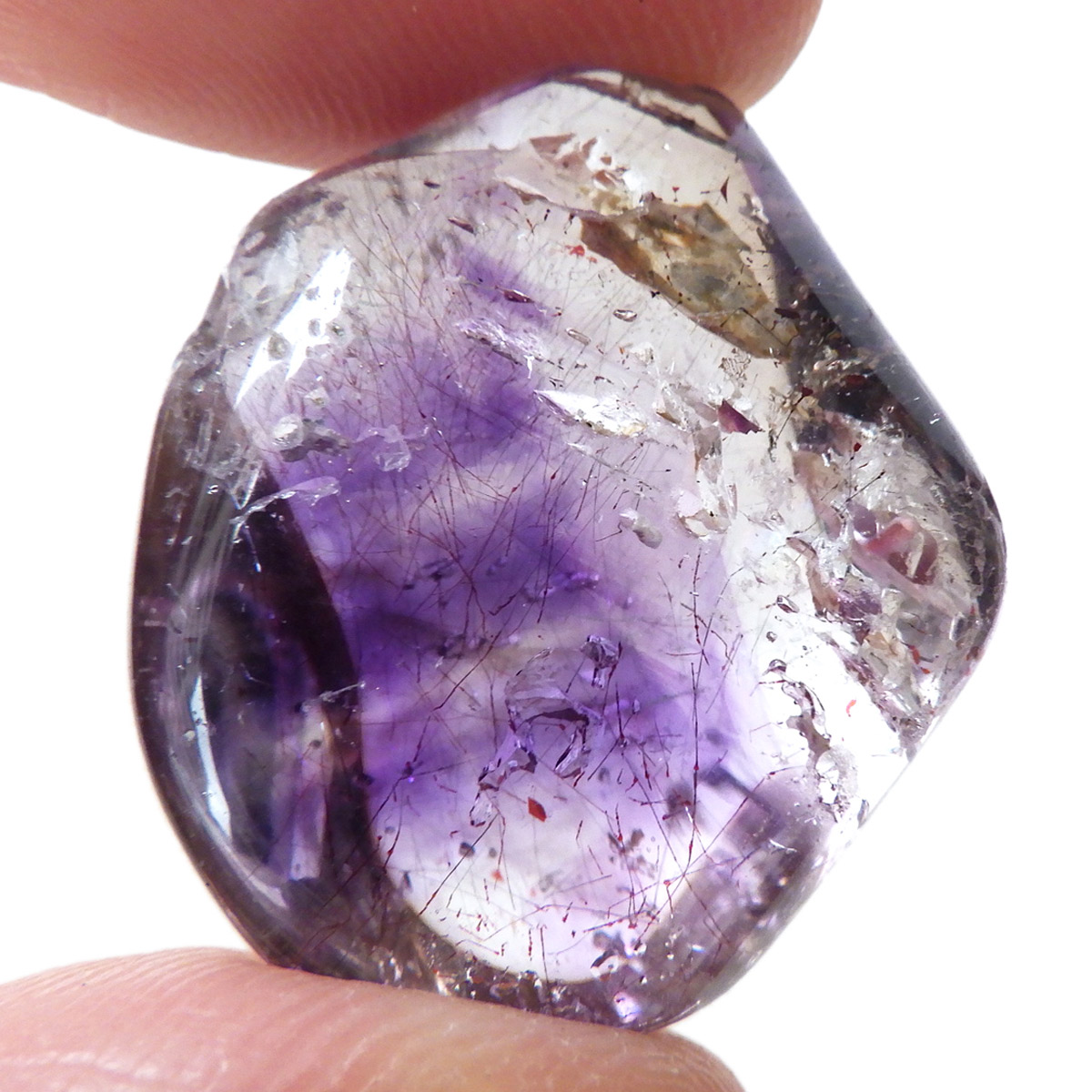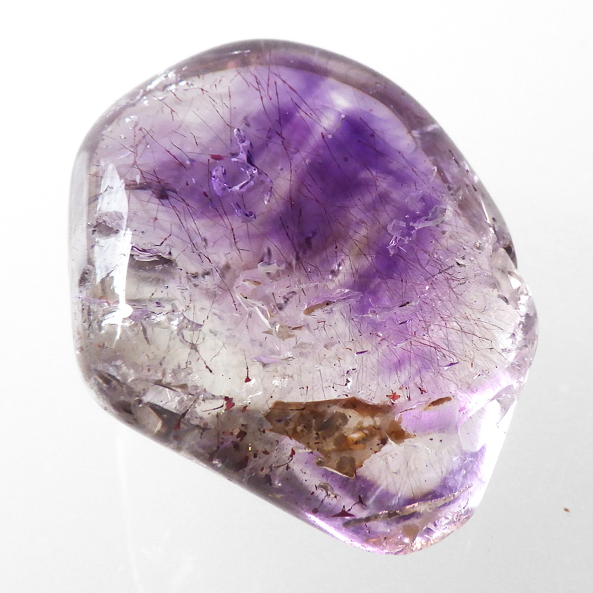 ナミビアのブランドバーグに産するアメジスト、通称ブランドバーグアメジスト、タンブルです。 透明なクォーツ内に煙のようにふわっと漂った美しいクリアなパープルのアメジストと黒いスモーキークォーツが見られます。透明度が高く、内包物がよく見えます。光によって輝く姿がこの産地特有のものでとてもきれいで癒されます。