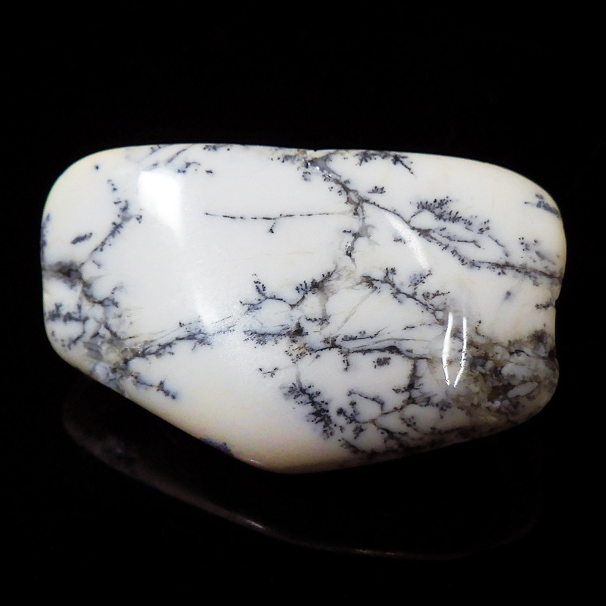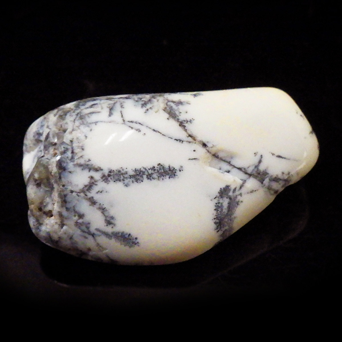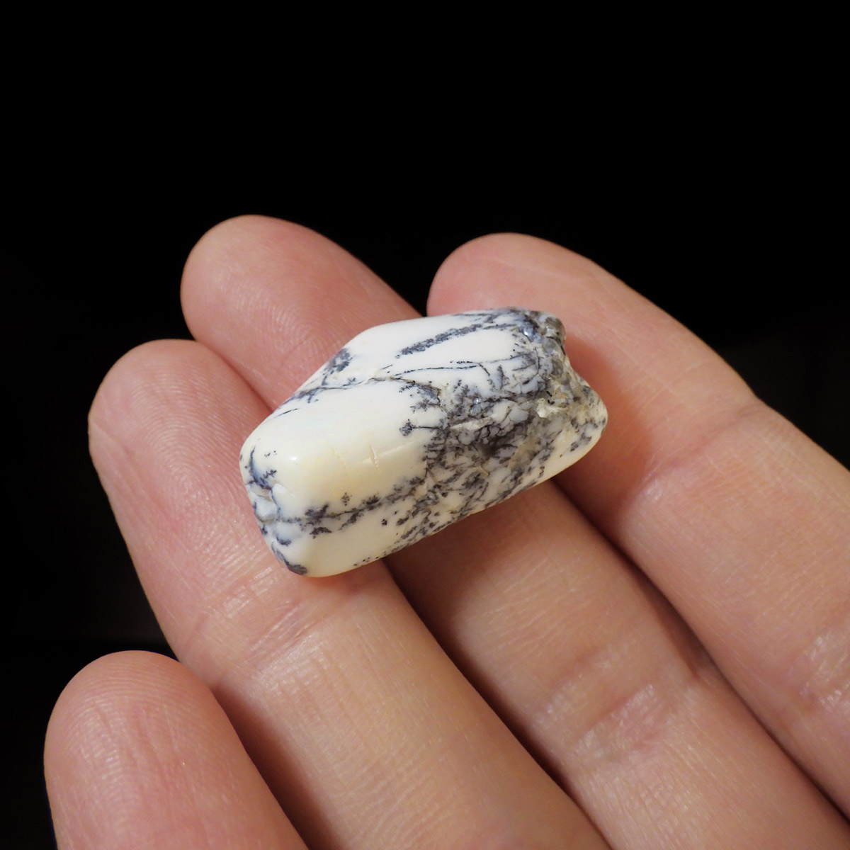 マダガスカル産のデンドリティックアゲート、タンブルです。デンドリティックアゲートはアゲートまたはクォーツ、オパール内に樹枝状のインクルージョンが見られるもののことです。まとめてデンドライトとも呼ばれます。酸化マンガンや酸化鉄が割れ目に侵入して模様ができたとされています。模様を付けたように見えますが、これが自然に生成されているので神秘的です。