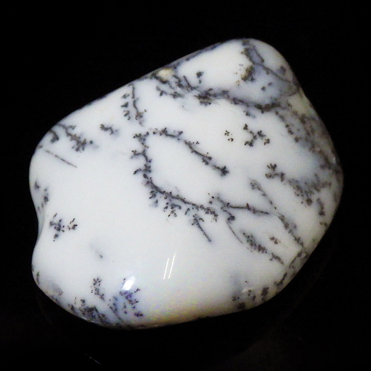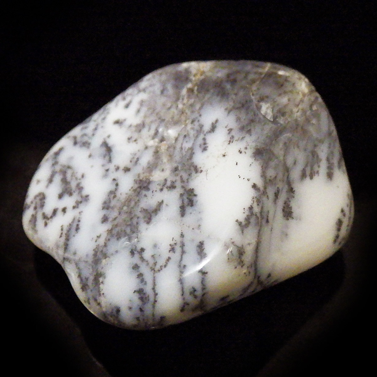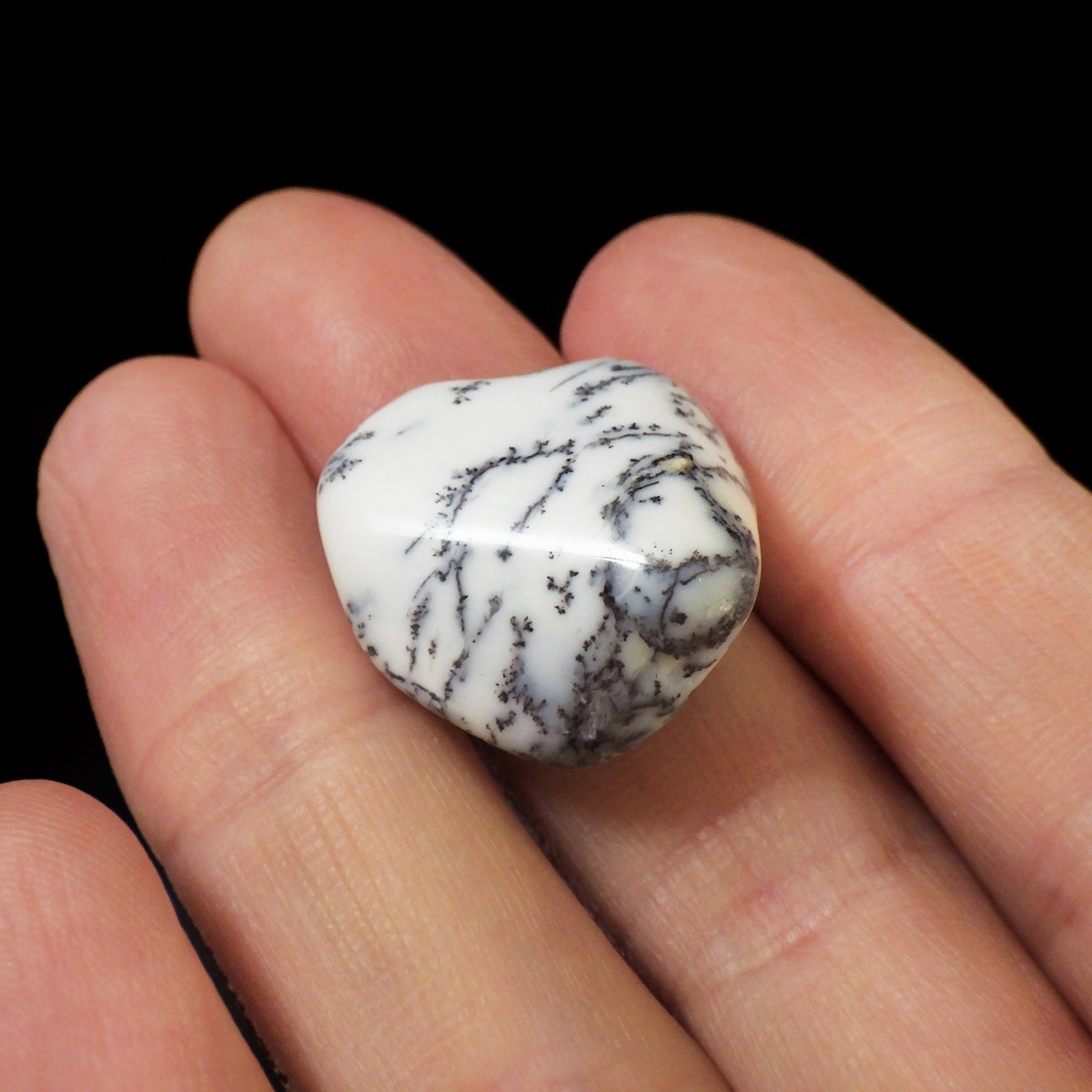 マダガスカル産のデンドリティックアゲート、タンブルです。デンドリティックアゲートはアゲートまたはクォーツ、オパール内に樹枝状のインクルージョンが見られるもののことです。まとめてデンドライトとも呼ばれます。酸化マンガンや酸化鉄が割れ目に侵入して模様ができたとされています。模様を付けたように見えますが、これが自然に生成されているので神秘的です。