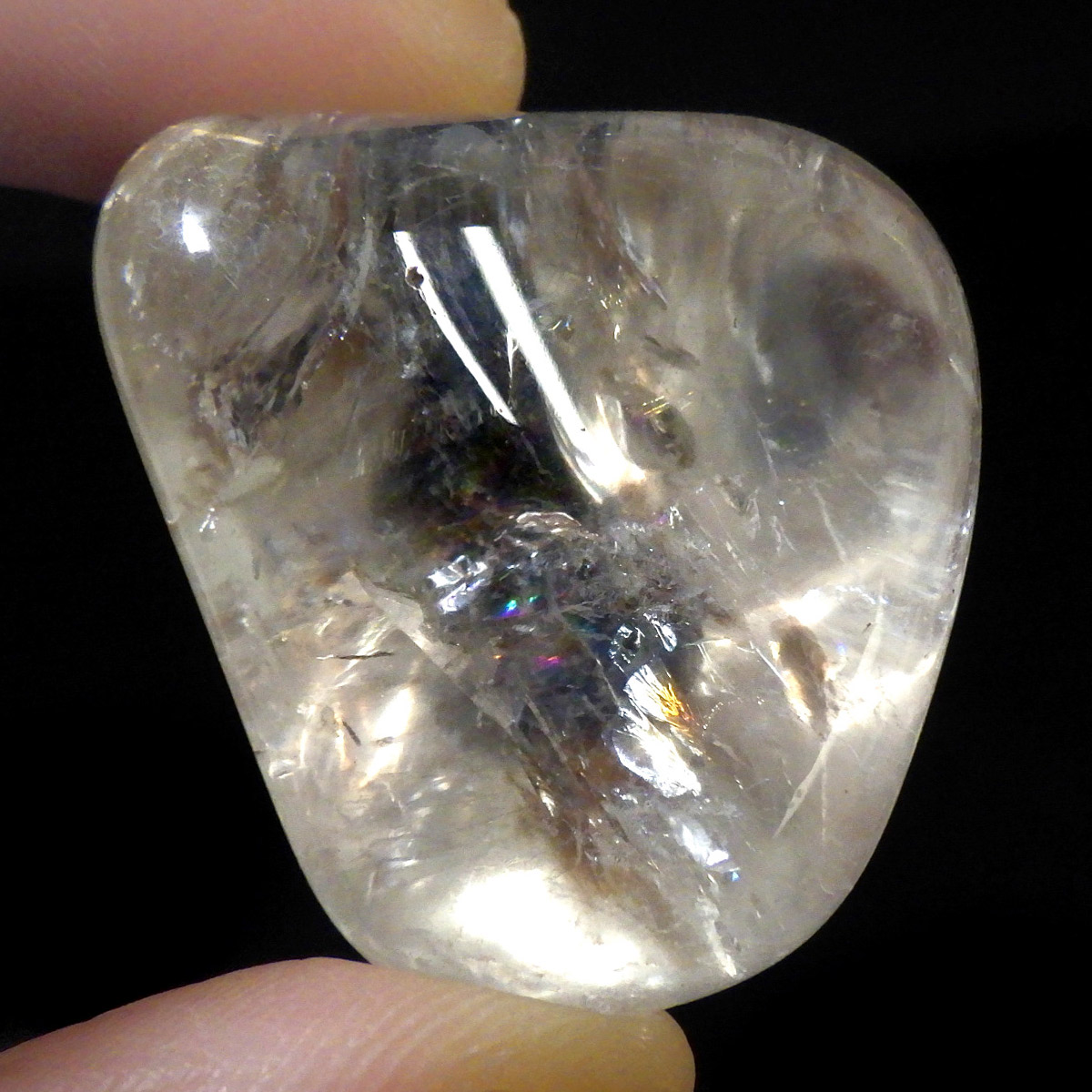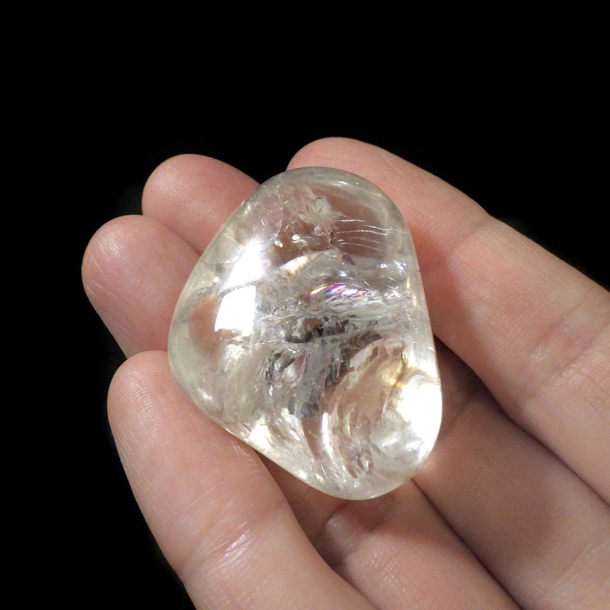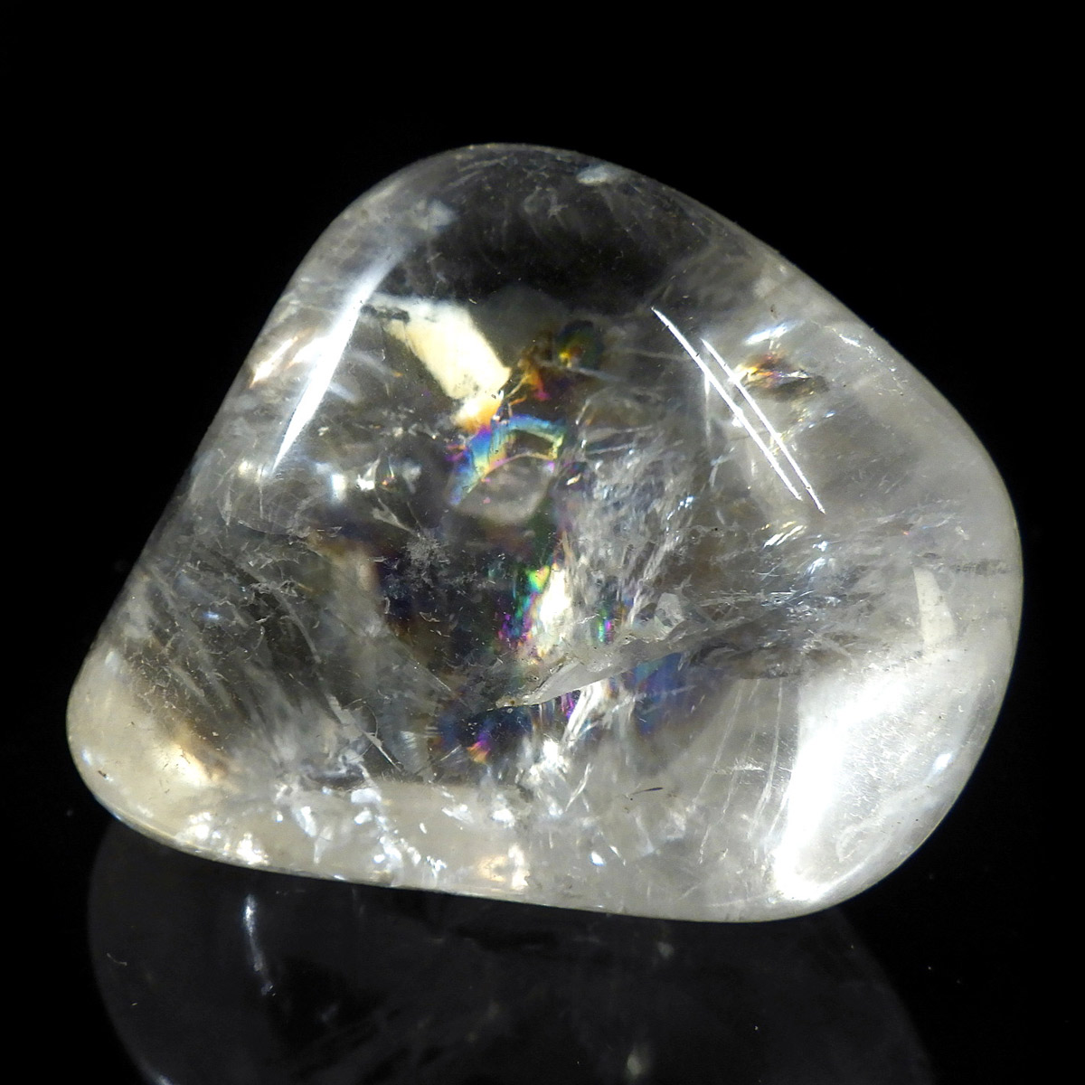 ブラジル産レインボークォーツ(アイリスクォーツ)、タンブルです。 和名は虹入り水晶です。 透明度が高く、大きさもあるタンブルで、しっかりとレインボーが入っています。