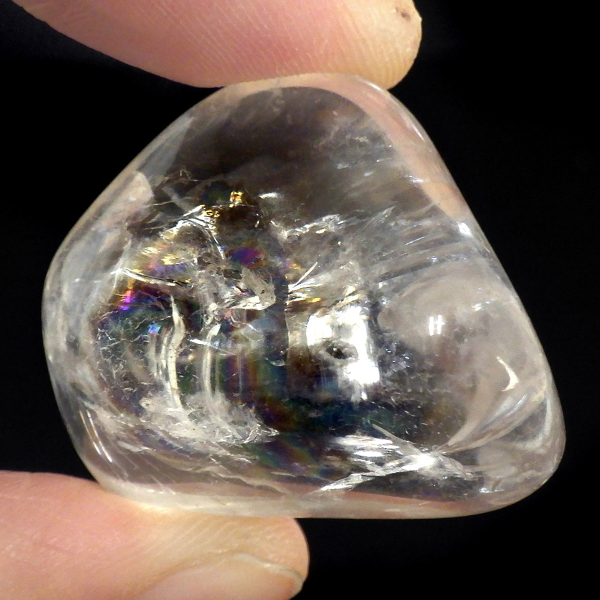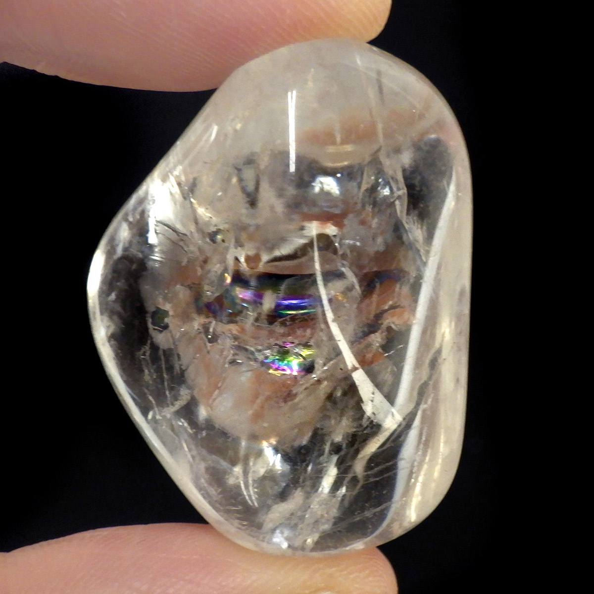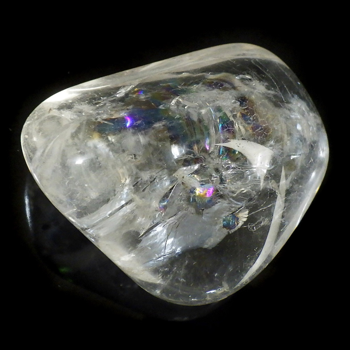 ブラジル産レインボークォーツ(アイリスクォーツ)、タンブルです。 和名は虹入り水晶です。 透明度が高く、大きさもあるタンブルで、しっかりとレインボーが入っています。
