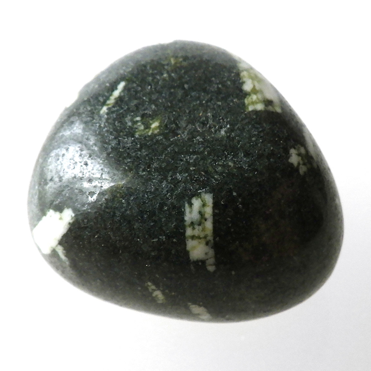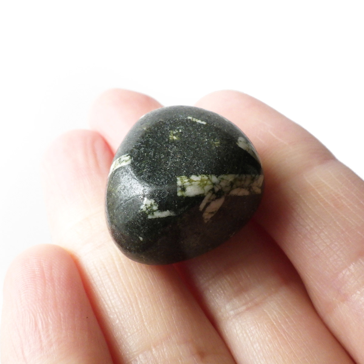 アメリカ産のチャイニーズライティングストーン、タンブルです。和名は漢字石。アメリカ人が石の模様を見て漢字に似ていると感じたから名付けられた石とされています。漢字石は黒い玄武岩と白い長石からなる火成岩とのことです。