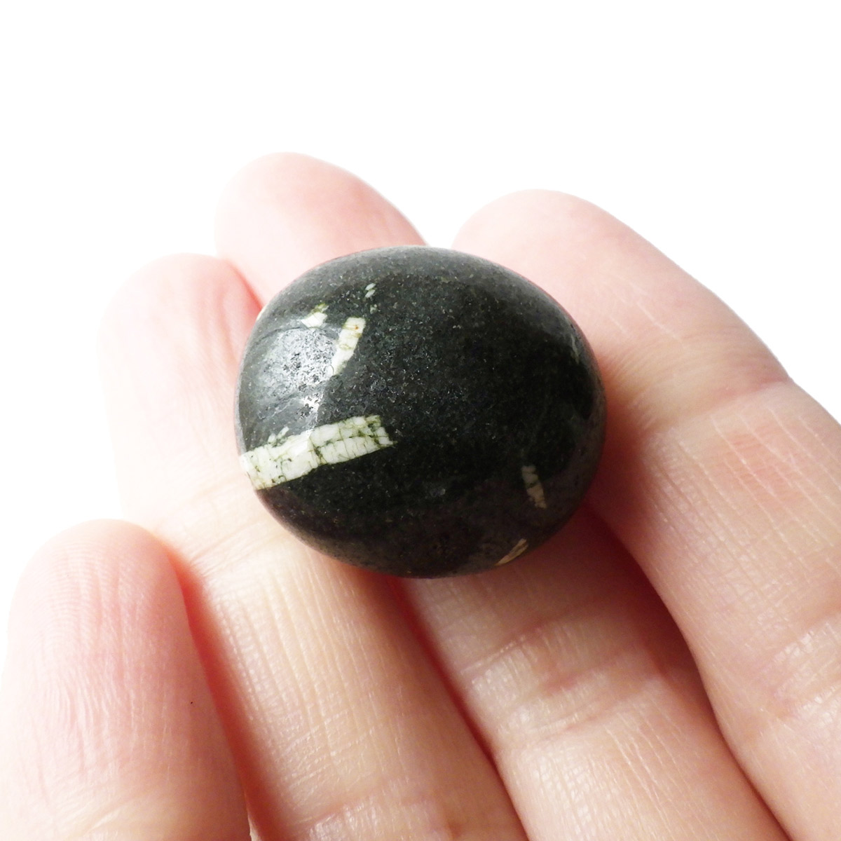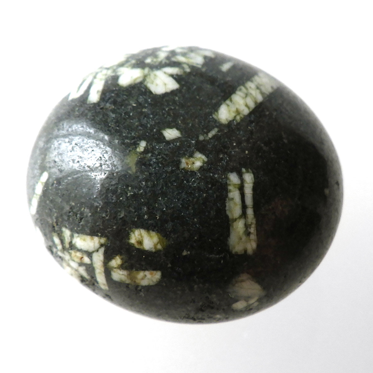 アメリカ産のチャイニーズライティングストーン、タンブルです。和名は漢字石。アメリカ人が石の模様を見て漢字に似ていると感じたから名付けられた石とされています。漢字石は黒い玄武岩と白い長石からなる火成岩とのことです。
