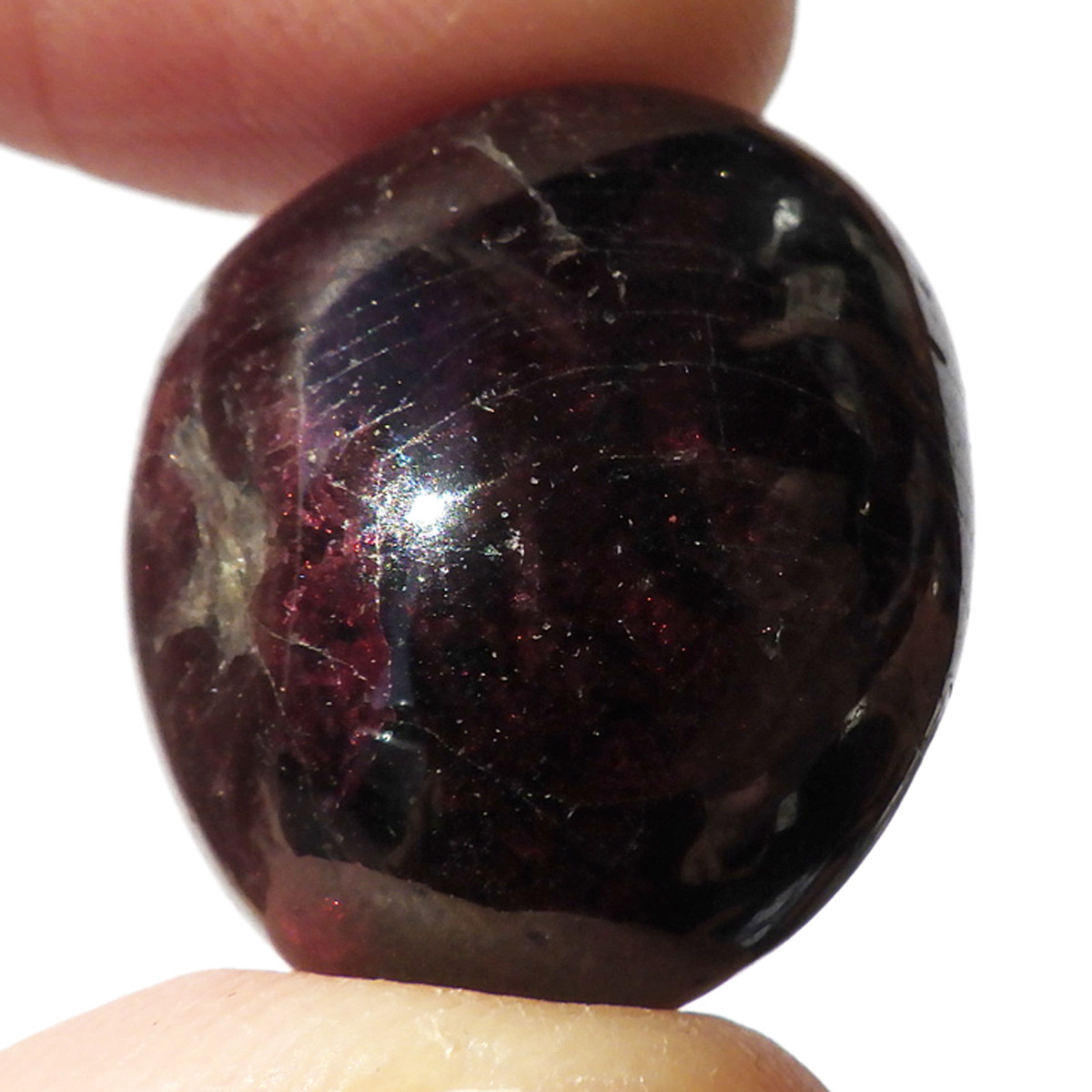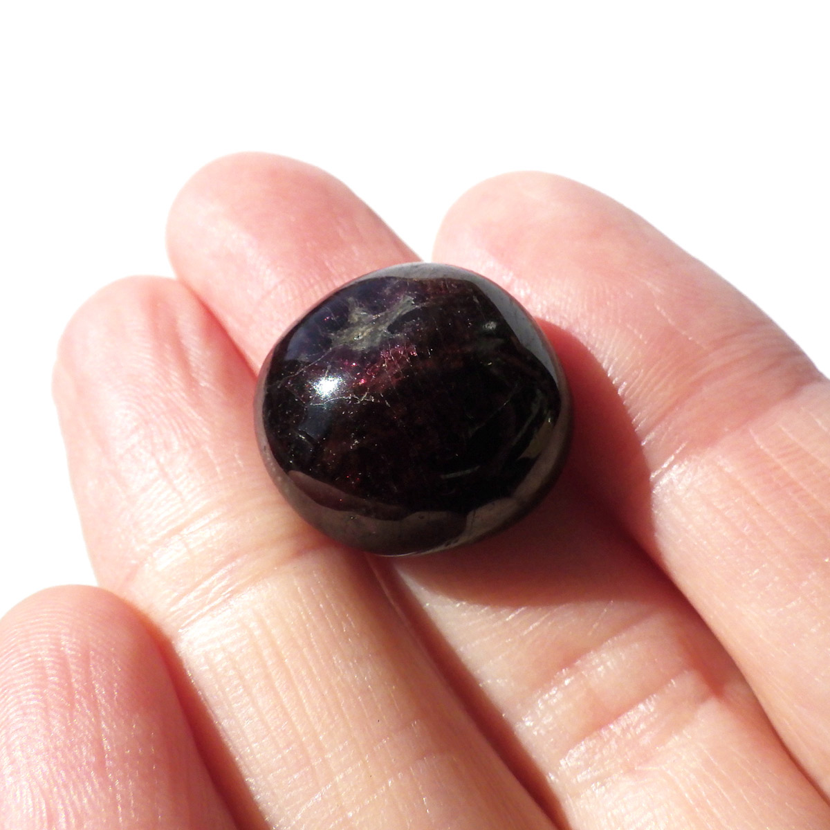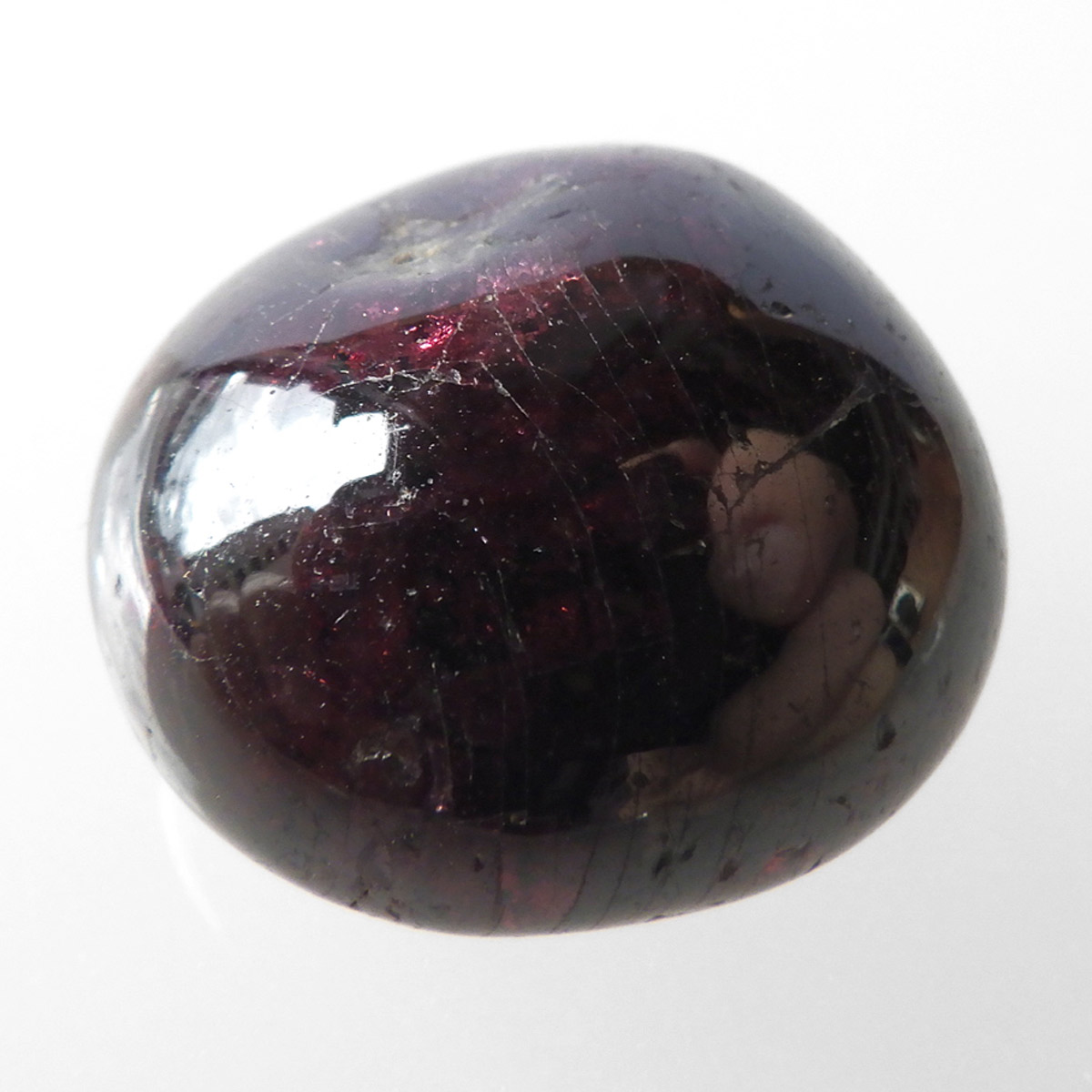 ブラジル産のガーネット、タンブルです。ガーネット族のアルマンディンという種類。一見すると黒っぽい石ですが、光に透かすととても美しい赤色を示します。内に秘めた情熱の赤といった印象でしょうか。ガーネットのアクティブなエネルギーは多くの場面で背中を押してくれる積極性の象徴とされています。