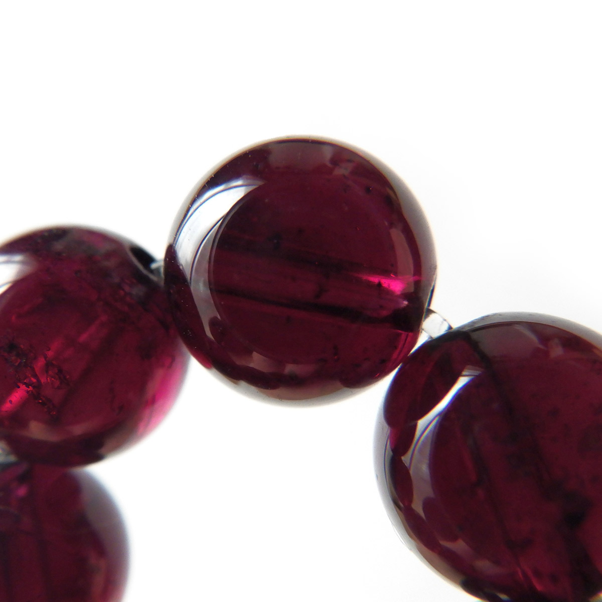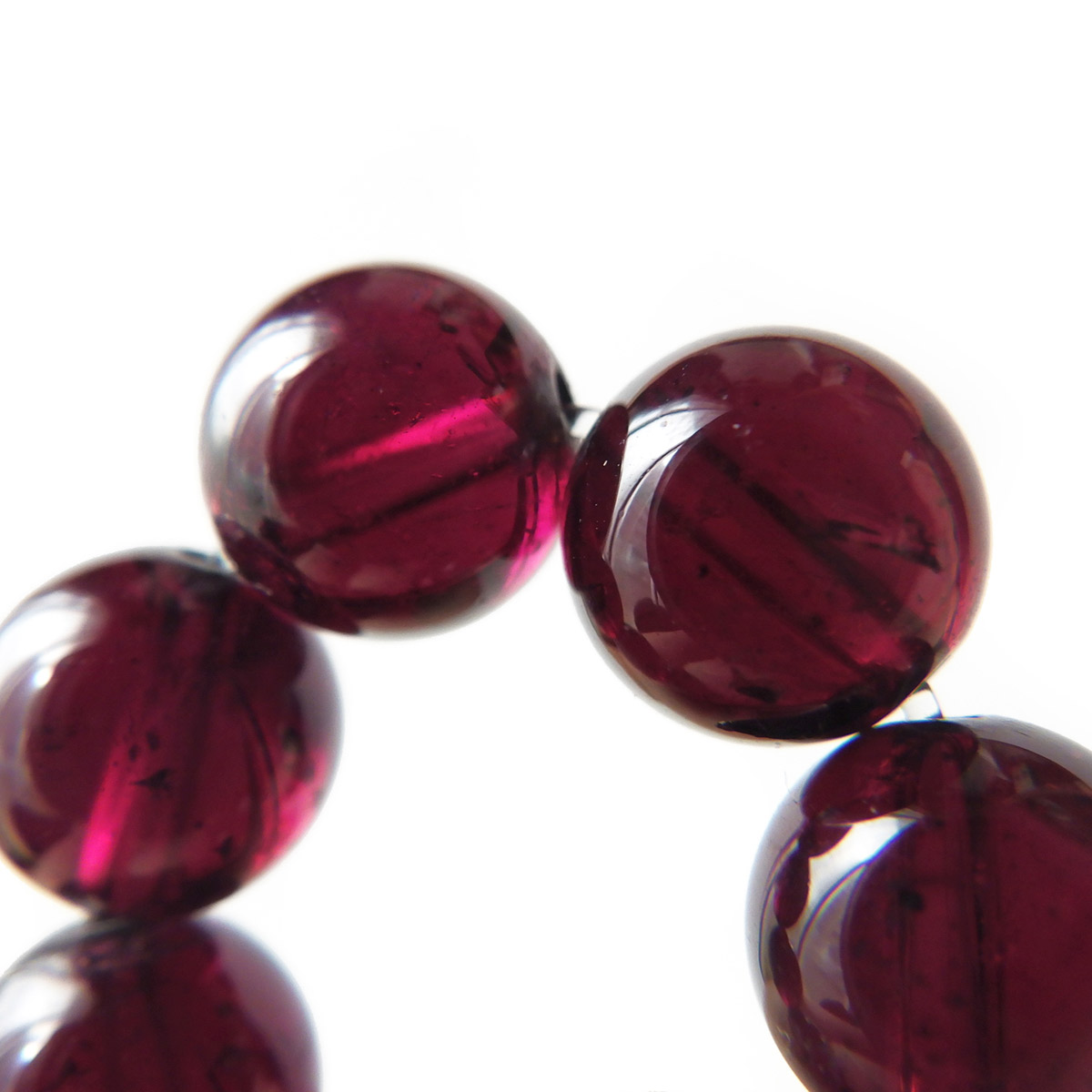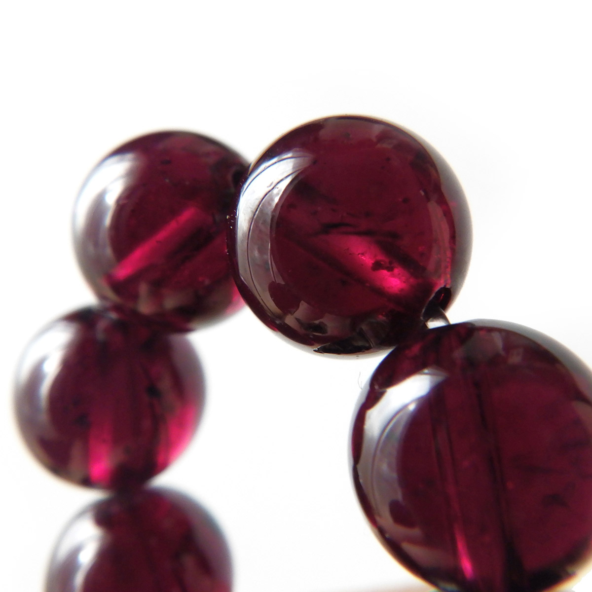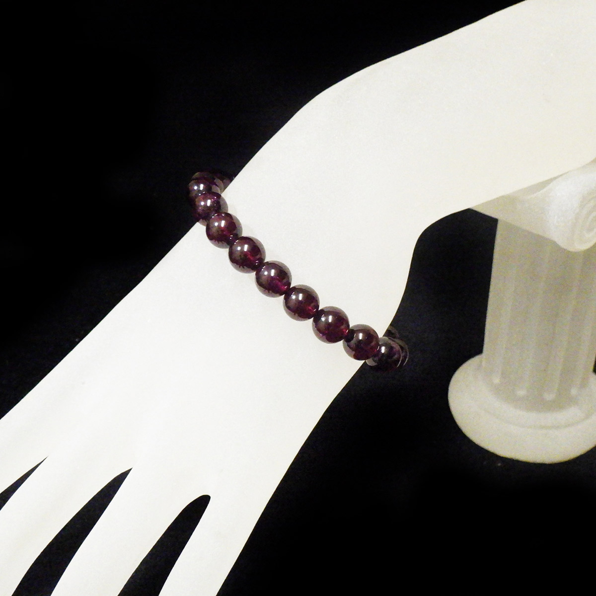 タンザニア産ロードライトガーネット、ブレスレットです。ロードライトガーネットは紫帯びた赤のワインレッド色が非常に美しいガーネットのことです。アルマンディン(鉄礬柘榴石)とパイロープ(苦礬柘榴石)の混合ガーネットであり、貴重で高価、そして数少ないパワーストーンであることから、人気がとても高いストーンです。光に透かすとよりきれいな色彩が現れます。