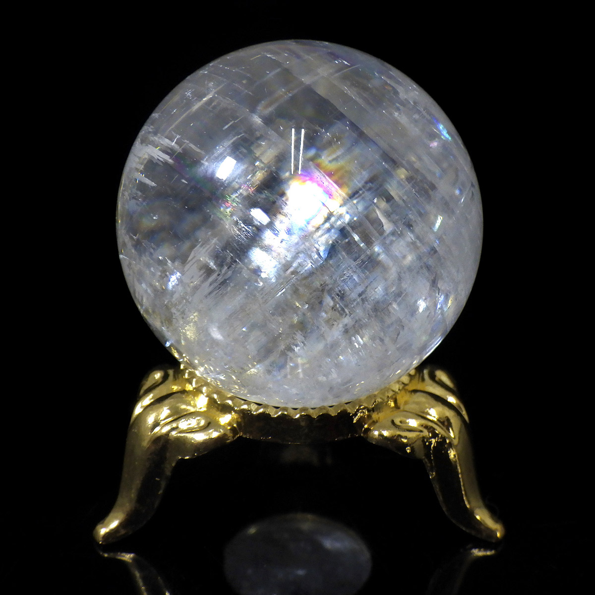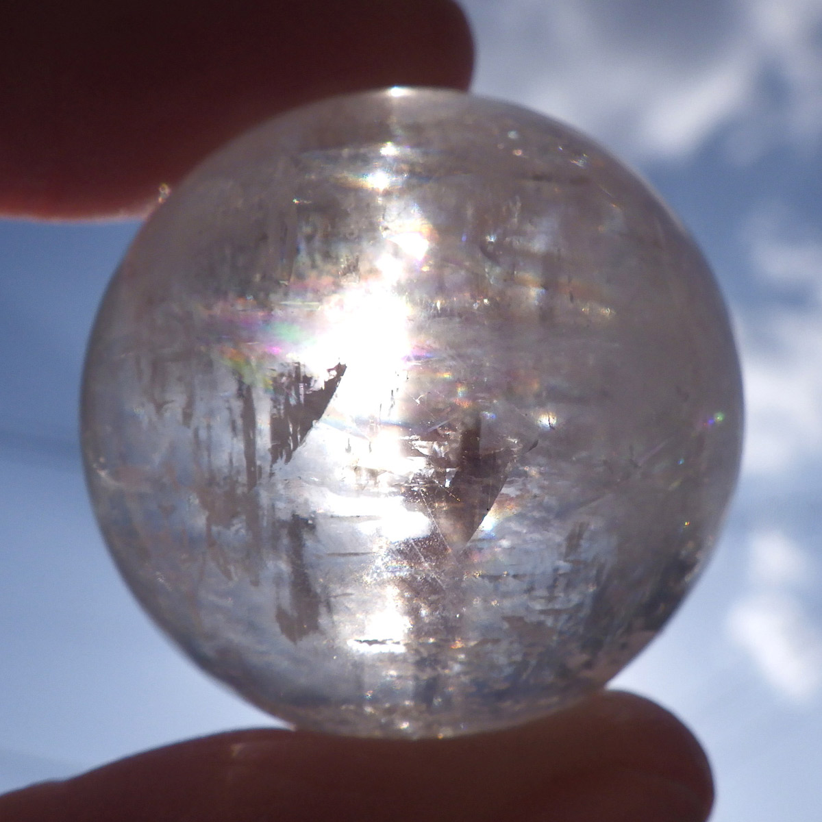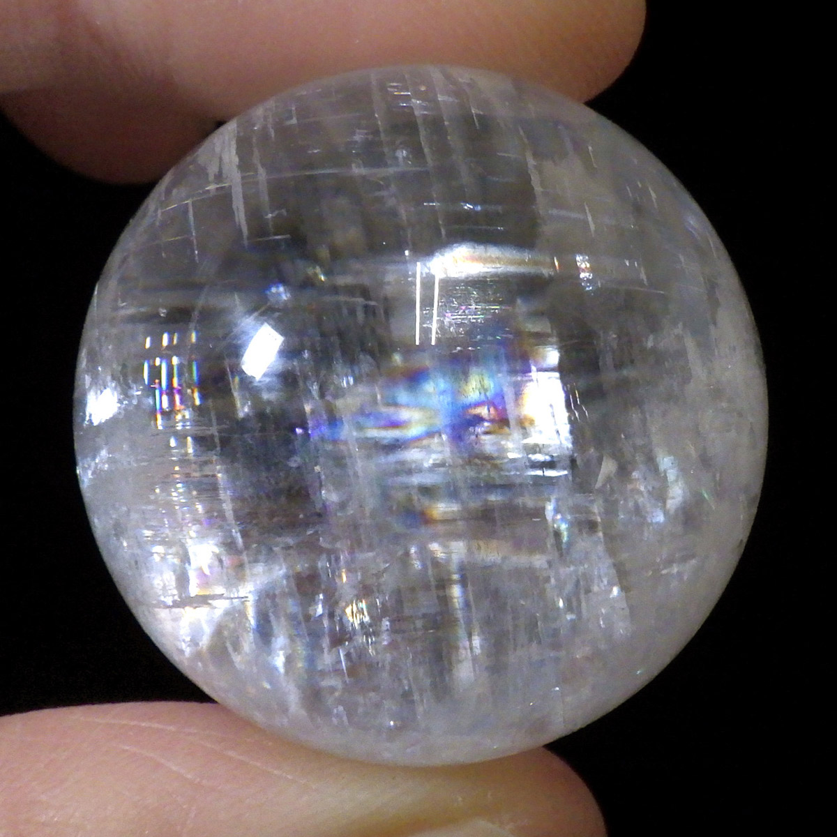 高い透明度を持ち、様々な角度からレインボーを見ることができます。複屈折という光学現象を持ち、文字の上に載せると二つにダブって見える「ダブリング(二重像現象)」のような現象を起こします。一定方向に向かって割れる劈開性によって平行四辺形の形になります。