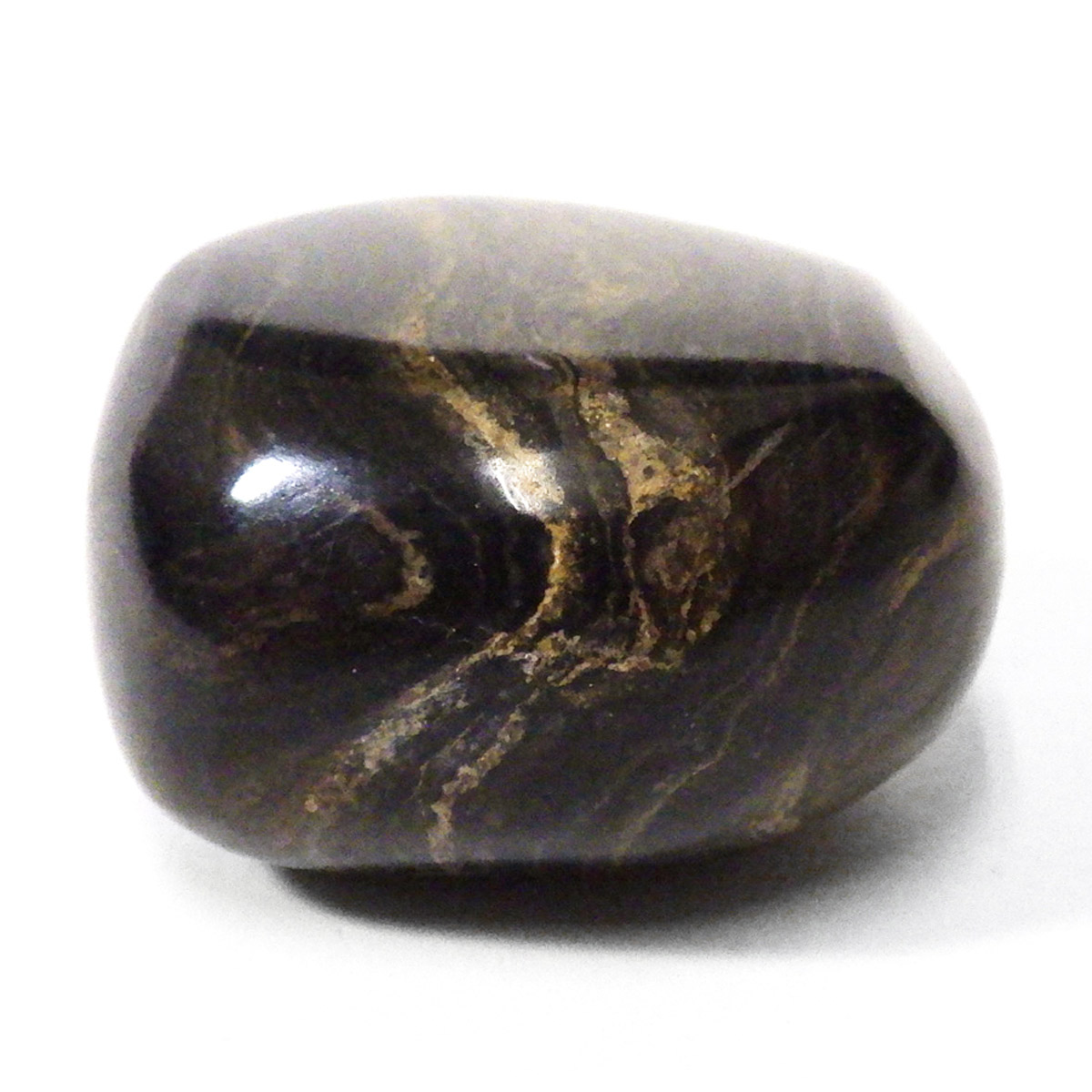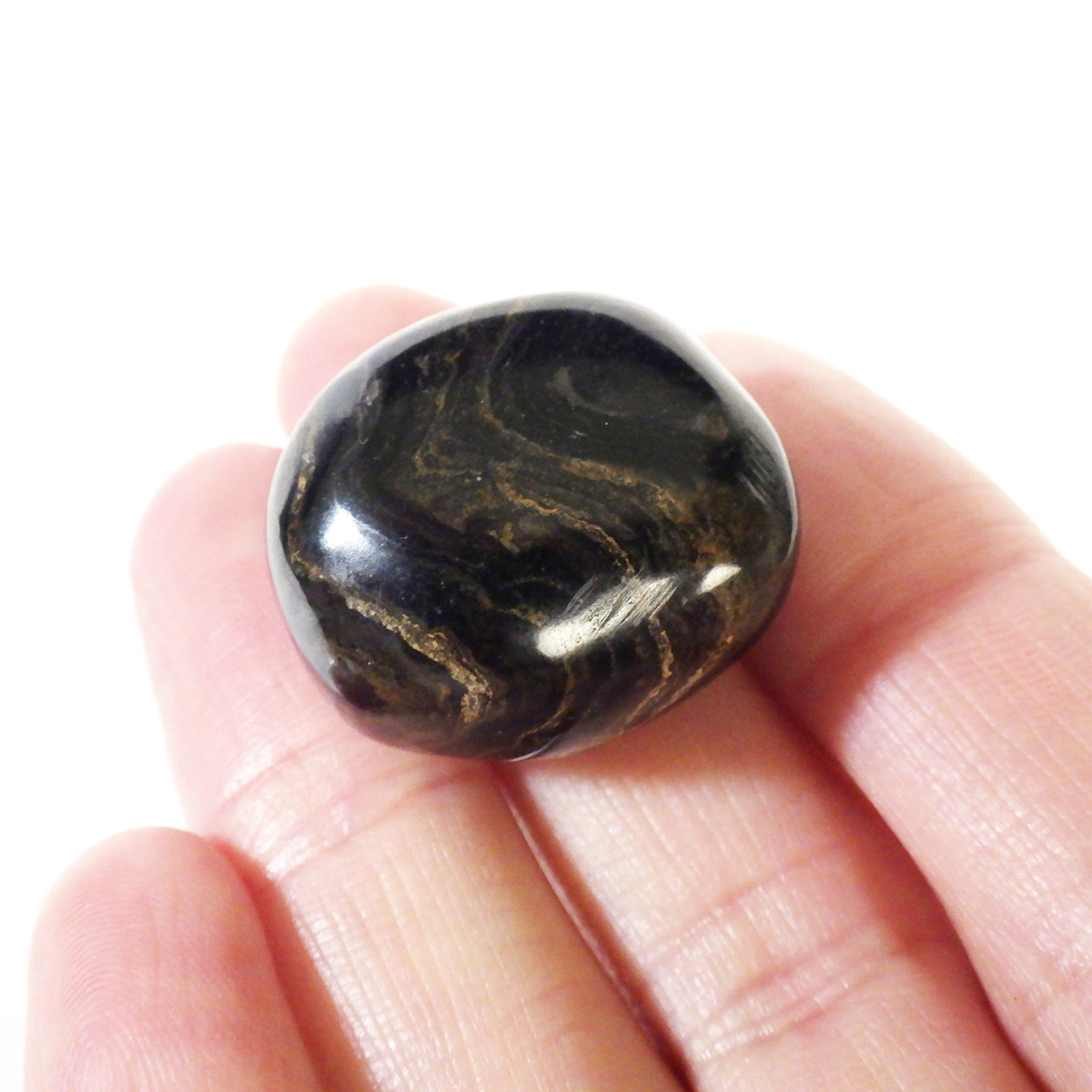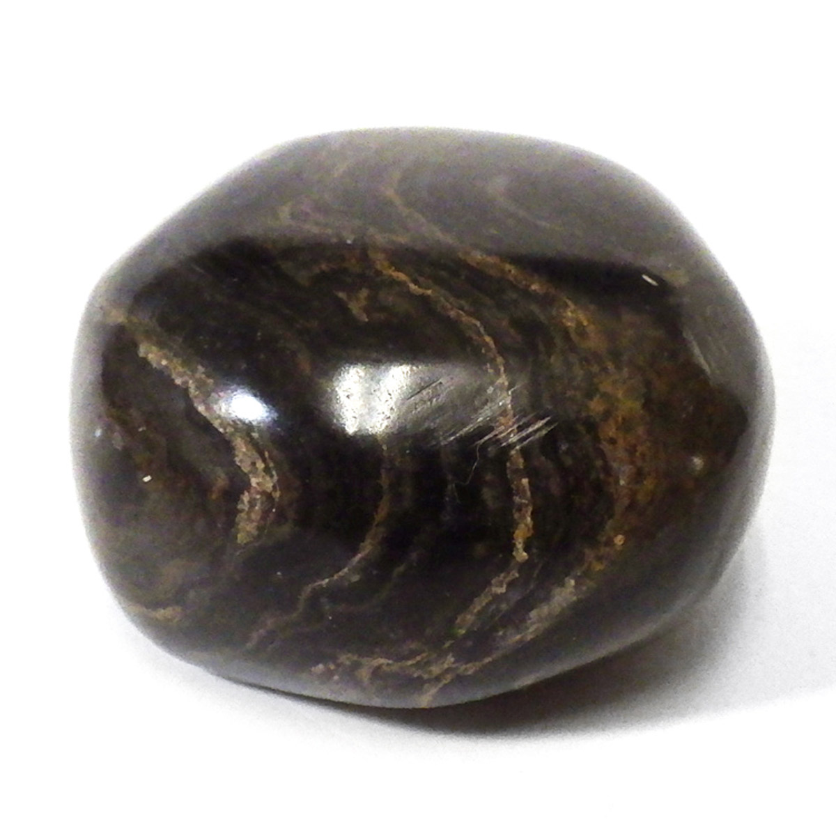 ペルー産、ストロマトライトのタンブルです。ストロマトライトは30億年前以上、シアノバクテリアなどの藍藻類の死骸と泥粒などによって作られる層状の構造をもつ岩石のことです。海水、淡水域どちらからも見つかり地球上に広く分布していたことが伺えます。長い年月をかけて堆積した岩石で縞模様の広さから当時の様子が伺えることなどから化石に分類されています。