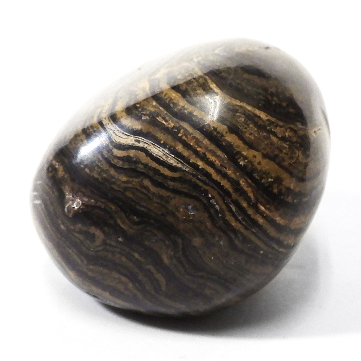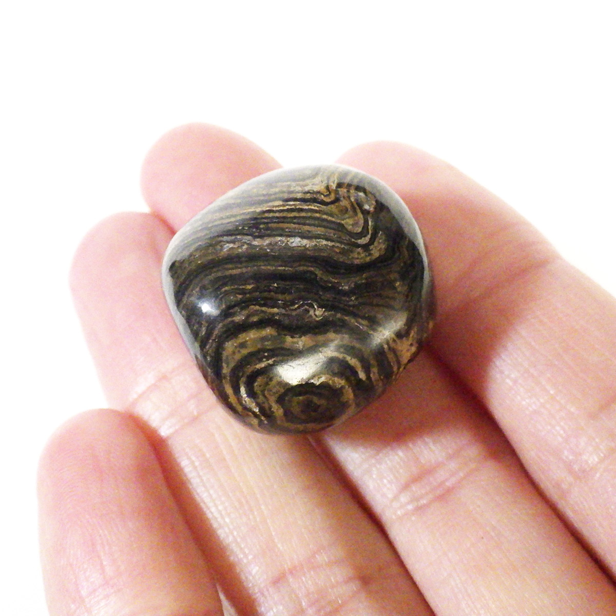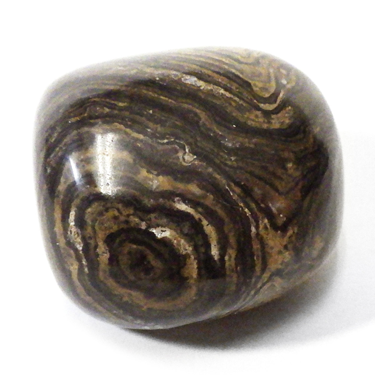 ペルー産、ストロマトライトのタンブルです。ストロマトライトは30億年前以上、シアノバクテリアなどの藍藻類の死骸と泥粒などによって作られる層状の構造をもつ岩石のことです。海水、淡水域どちらからも見つかり地球上に広く分布していたことが伺えます。長い年月をかけて堆積した岩石で縞模様の広さから当時の様子が伺えることなどから化石に分類されています。
