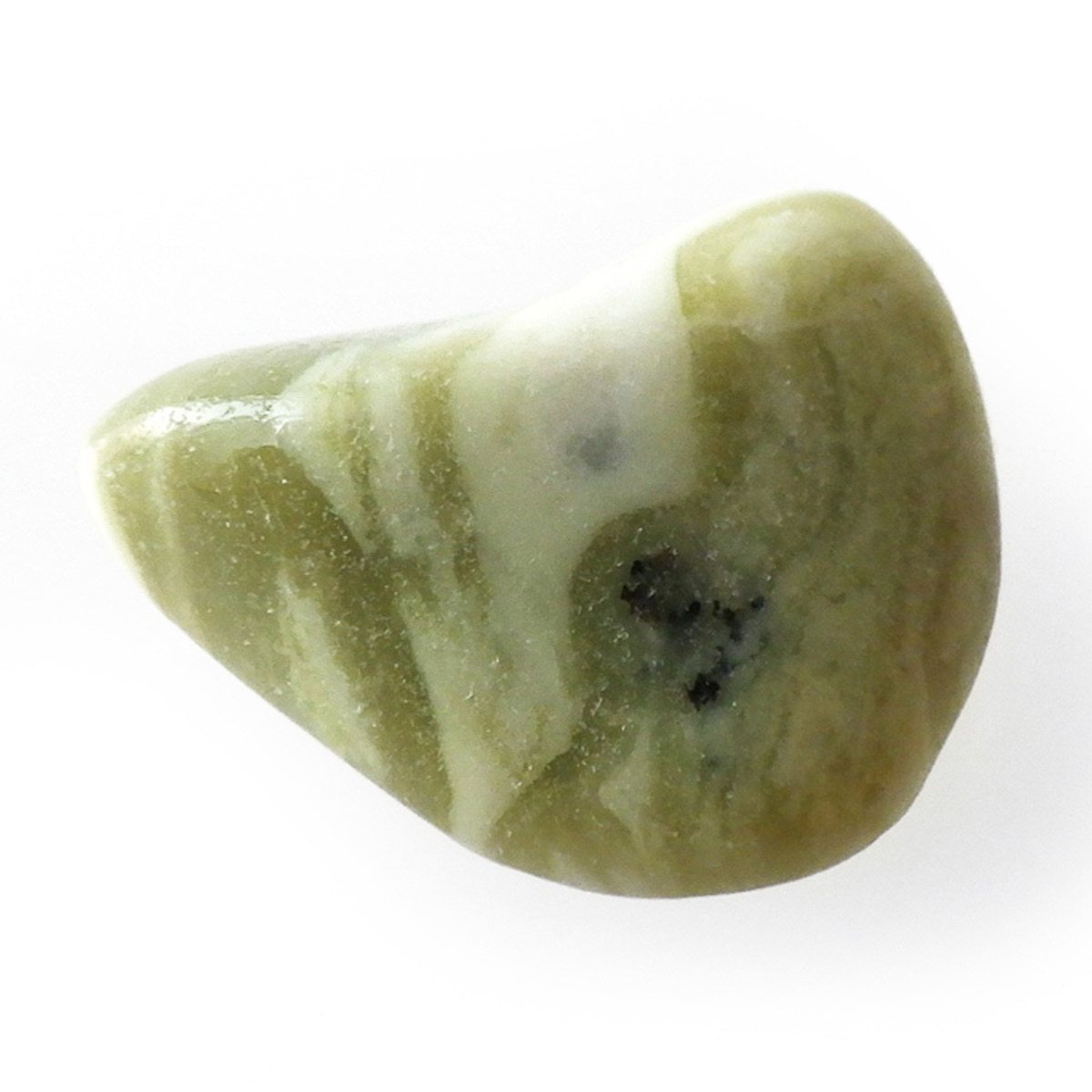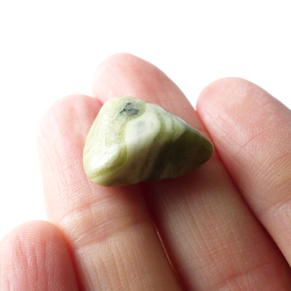 インド産のインフィナイト、タンブルです。インフィナイトはケイ酸マグネシウム鉱物で、クリソタイルとサーペンティンの組み合わせといわれています。通常、黄色、クリーム、緑、などの優しい色味をしており、縞模様が特徴的です。サーペンティンの一種で南アフリカで見つかるものを特別視し、インフィナイトと名づけられました。現在、インフィナイトは南アフリカとインドでしか見られない組み合わせとのことです。インフィナイトストーン、インフィナイトサーペンティンとも呼ばれています。