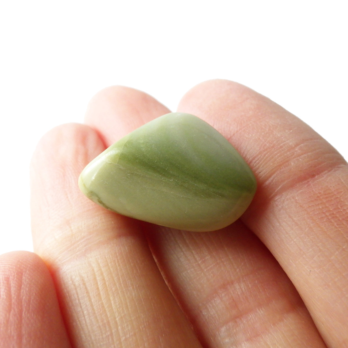 インド産のインフィナイト、タンブルです。インフィナイトはケイ酸マグネシウム鉱物で、クリソタイルとサーペンティンの組み合わせといわれています。通常、黄色、クリーム、緑、などの優しい色味をしており、縞模様が特徴的です。サーペンティンの一種で南アフリカで見つかるものを特別視し、インフィナイトと名づけられました。現在、インフィナイトは南アフリカとインドでしか見られない組み合わせとのことです。インフィナイトストーン、インフィナイトサーペンティンとも呼ばれています。