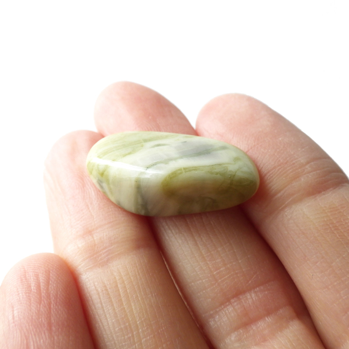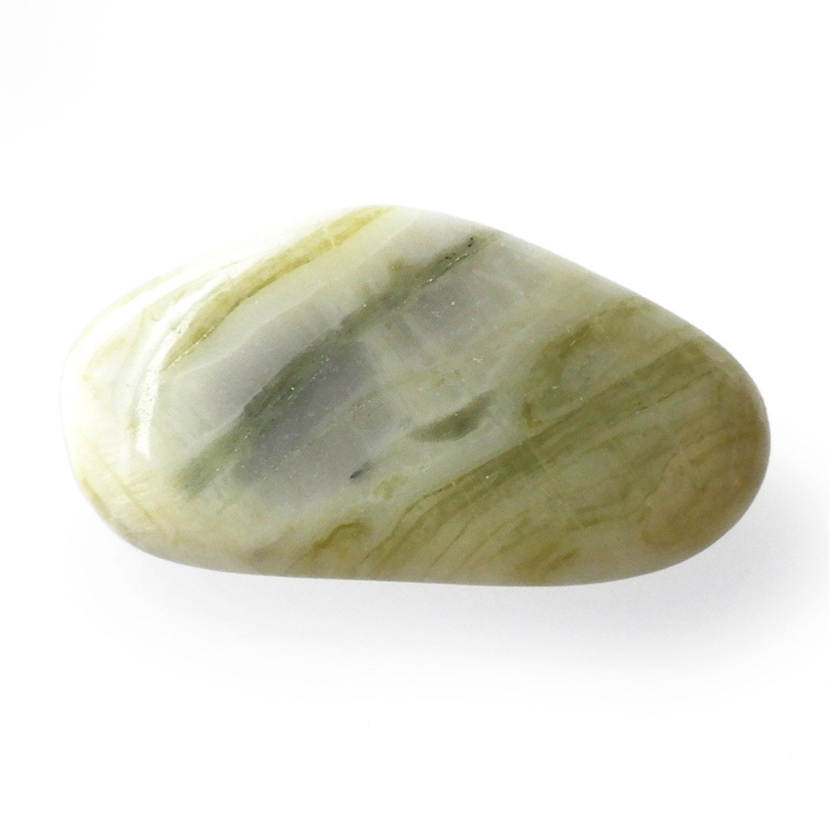 インド産のインフィナイト、タンブルです。インフィナイトはケイ酸マグネシウム鉱物で、クリソタイルとサーペンティンの組み合わせといわれています。通常、黄色、クリーム、緑、などの優しい色味をしており、縞模様が特徴的です。サーペンティンの一種で南アフリカで見つかるものを特別視し、インフィナイトと名づけられました。現在、インフィナイトは南アフリカとインドでしか見られない組み合わせとのことです。インフィナイトストーン、インフィナイトサーペンティンとも呼ばれています。