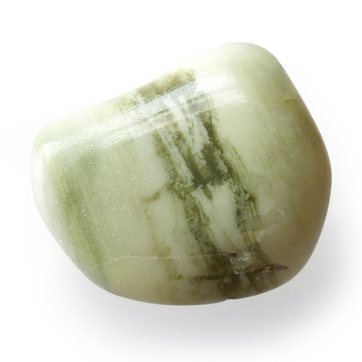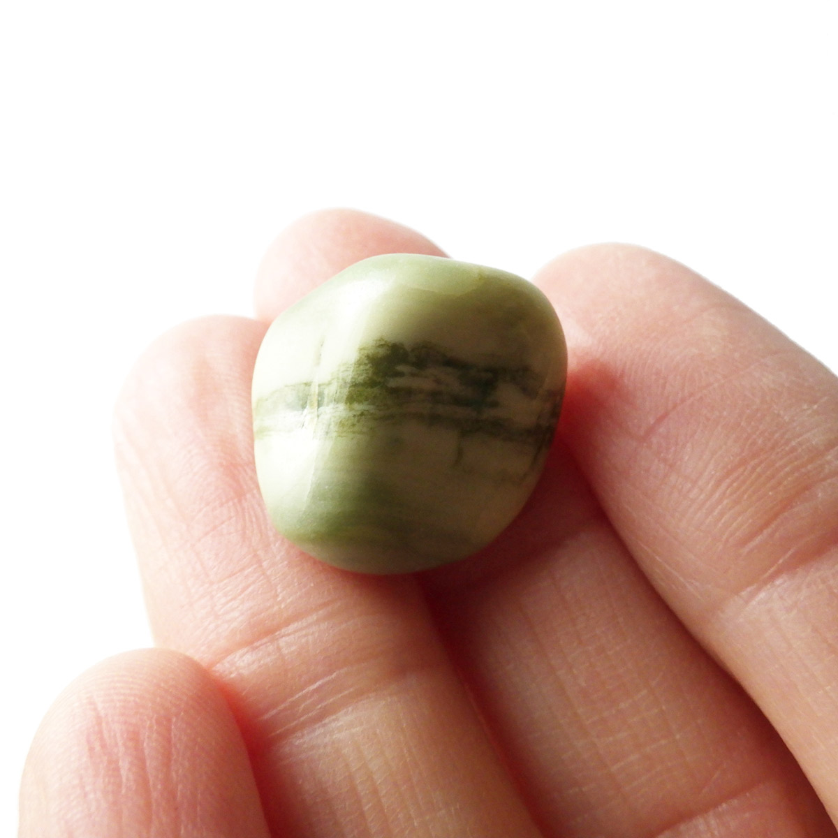 インド産のインフィナイト、タンブルです。インフィナイトはケイ酸マグネシウム鉱物で、クリソタイルとサーペンティンの組み合わせといわれています。通常、黄色、クリーム、緑、などの優しい色味をしており、縞模様が特徴的です。サーペンティンの一種で南アフリカで見つかるものを特別視し、インフィナイトと名づけられました。現在、インフィナイトは南アフリカとインドでしか見られない組み合わせとのことです。インフィナイトストーン、インフィナイトサーペンティンとも呼ばれています。