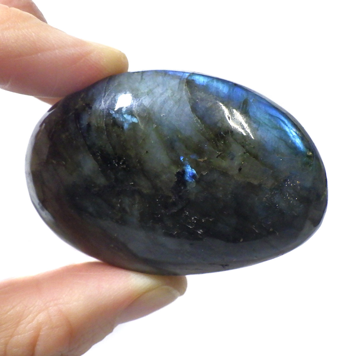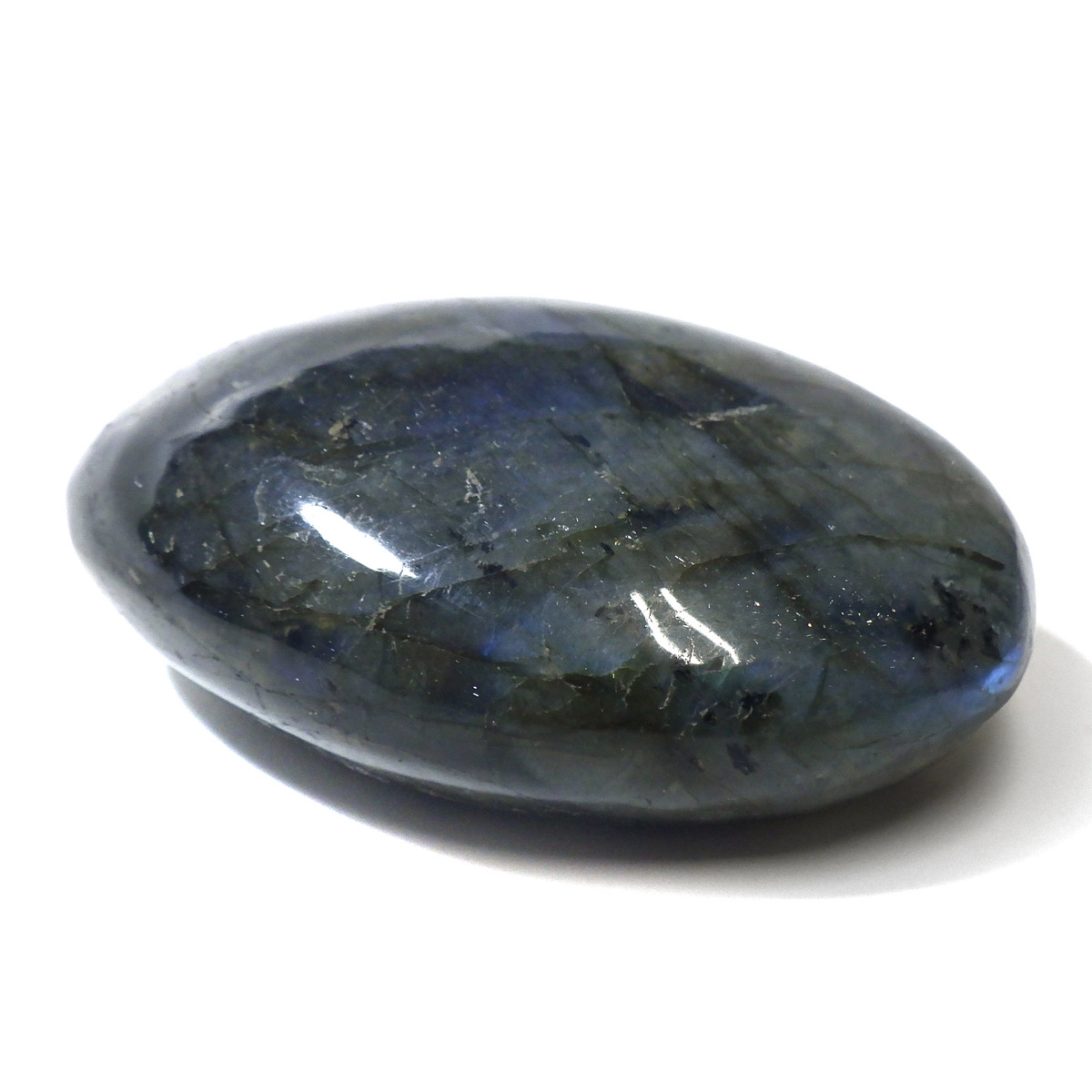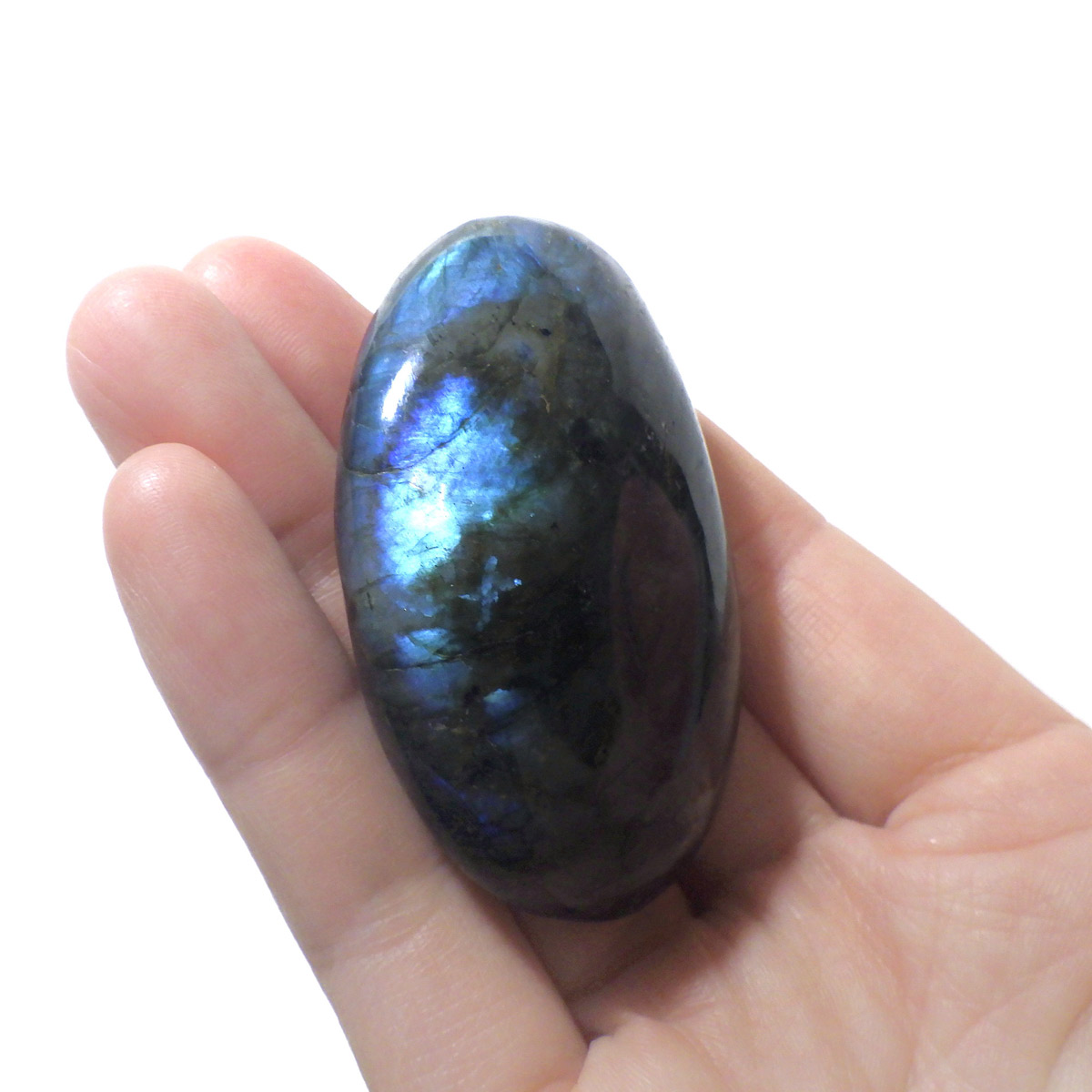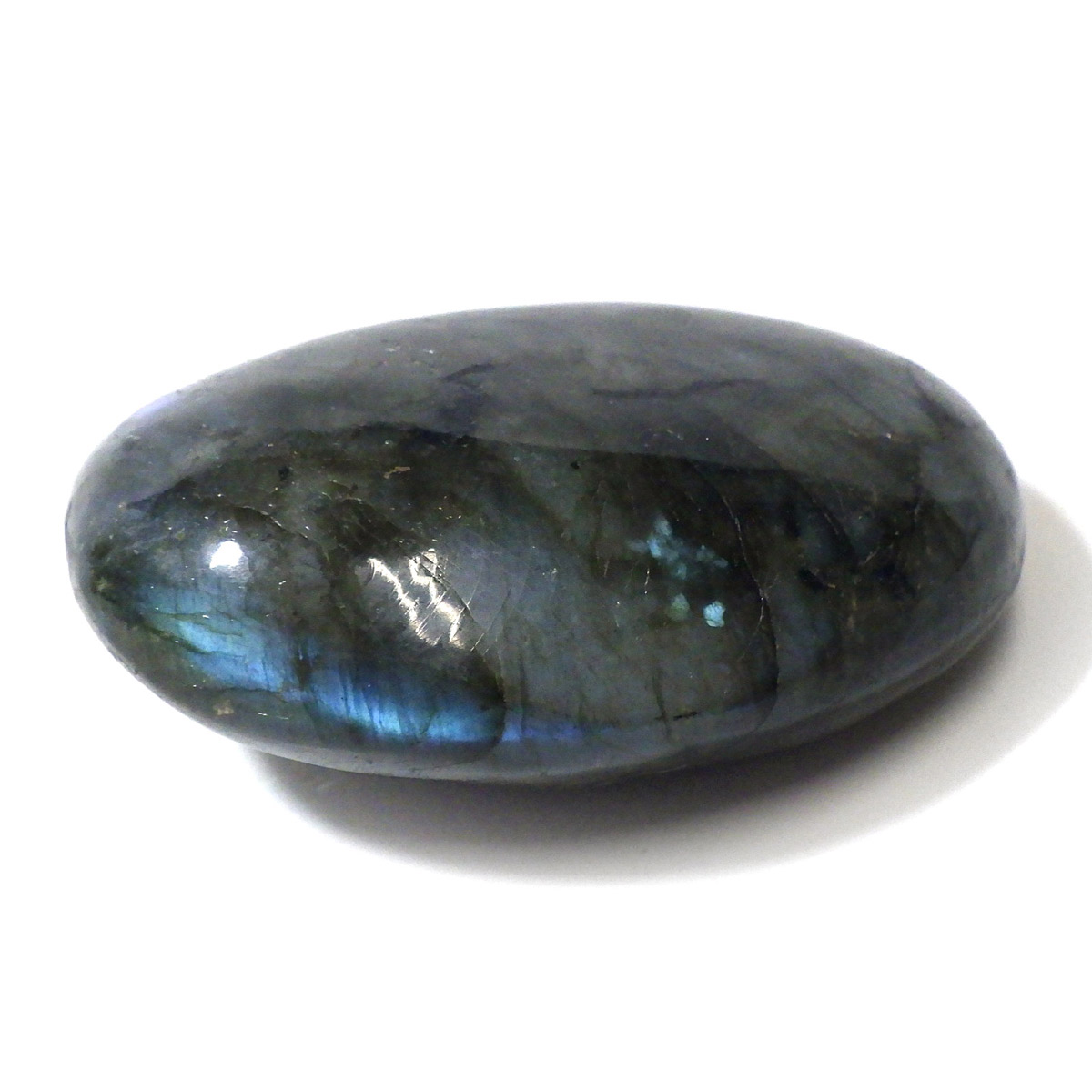 マダガスカル産のラブラドライト磨きペブルです。 見る角度によってオーロラのような色彩を変える美しい光を持つのが特徴です。 石自体はグレーなどの地味めな色合いをしていますが、そこに鮮やかな輝きが浮かび上がるところから「アゲハ蝶の羽」に例えられる事もある美しい石です。 ラブラドライトは、月・太陽を象徴するといわれています。根気強い実行力を養い、信念を貫けるよう導く力があるとされます。そして、直感力・洞察力・創造性を高めてくれるでしょう。自信を失いかけた時に、生まれた意味・生きる意味を気づかせるサポートをしてくれ、生きる力を引き出してくれるといわれています。