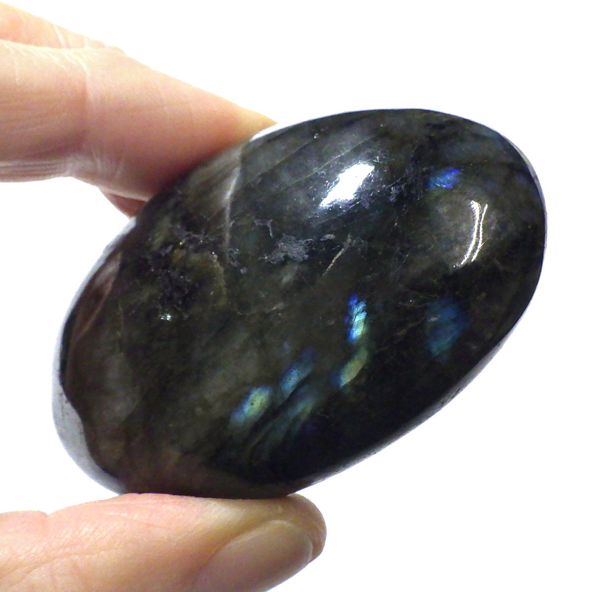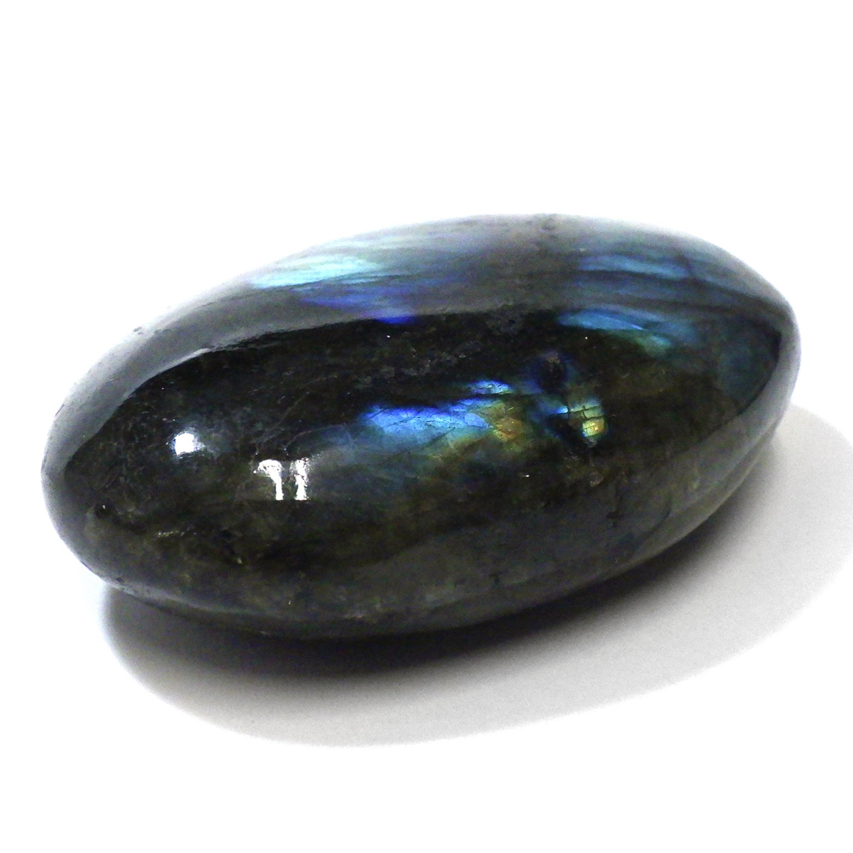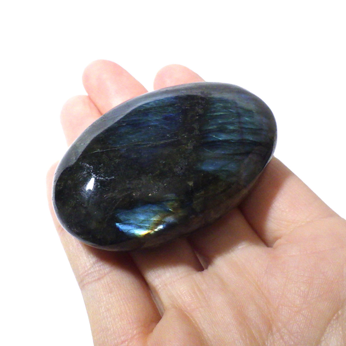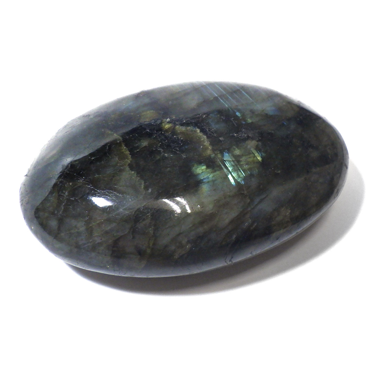 マダガスカル産のラブラドライト磨きペブルです。 見る角度によってオーロラのような色彩を変える美しい光を持つのが特徴です。 石自体はグレーなどの地味めな色合いをしていますが、そこに鮮やかな輝きが浮かび上がるところから「アゲハ蝶の羽」に例えられる事もある美しい石です。 ラブラドライトは、月・太陽を象徴するといわれています。根気強い実行力を養い、信念を貫けるよう導く力があるとされます。そして、直感力・洞察力・創造性を高めてくれるでしょう。自信を失いかけた時に、生まれた意味・生きる意味を気づかせるサポートをしてくれ、生きる力を引き出してくれるといわれています。