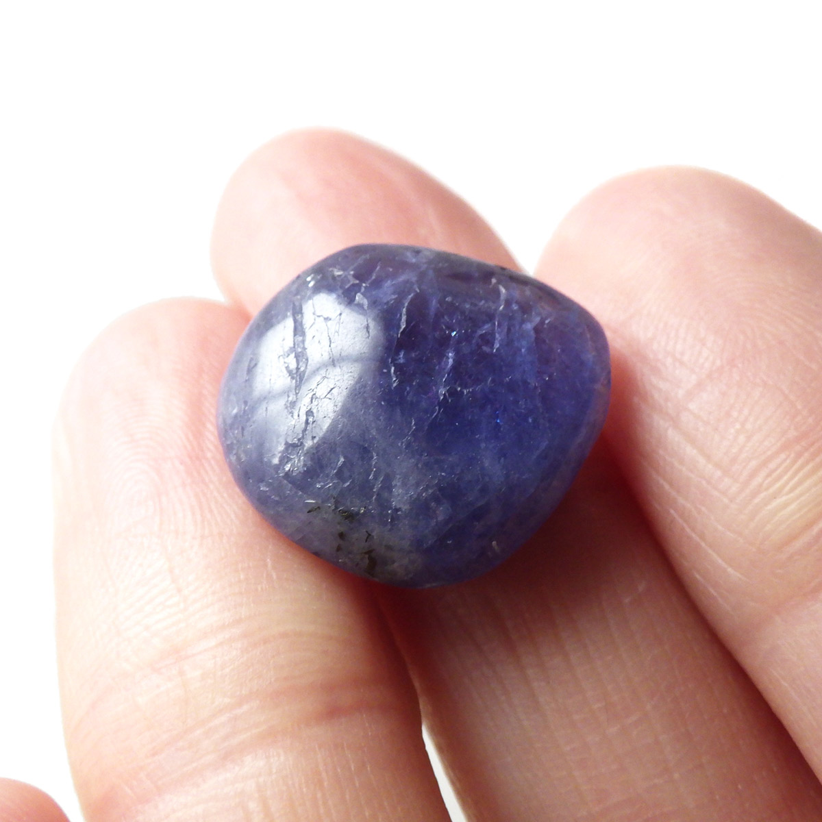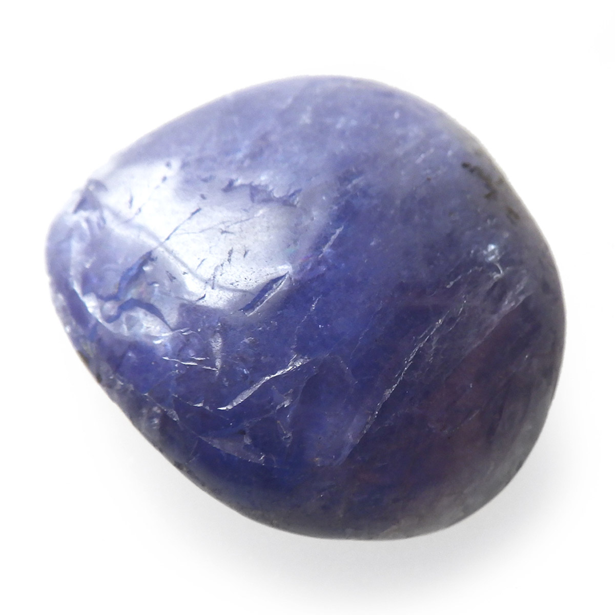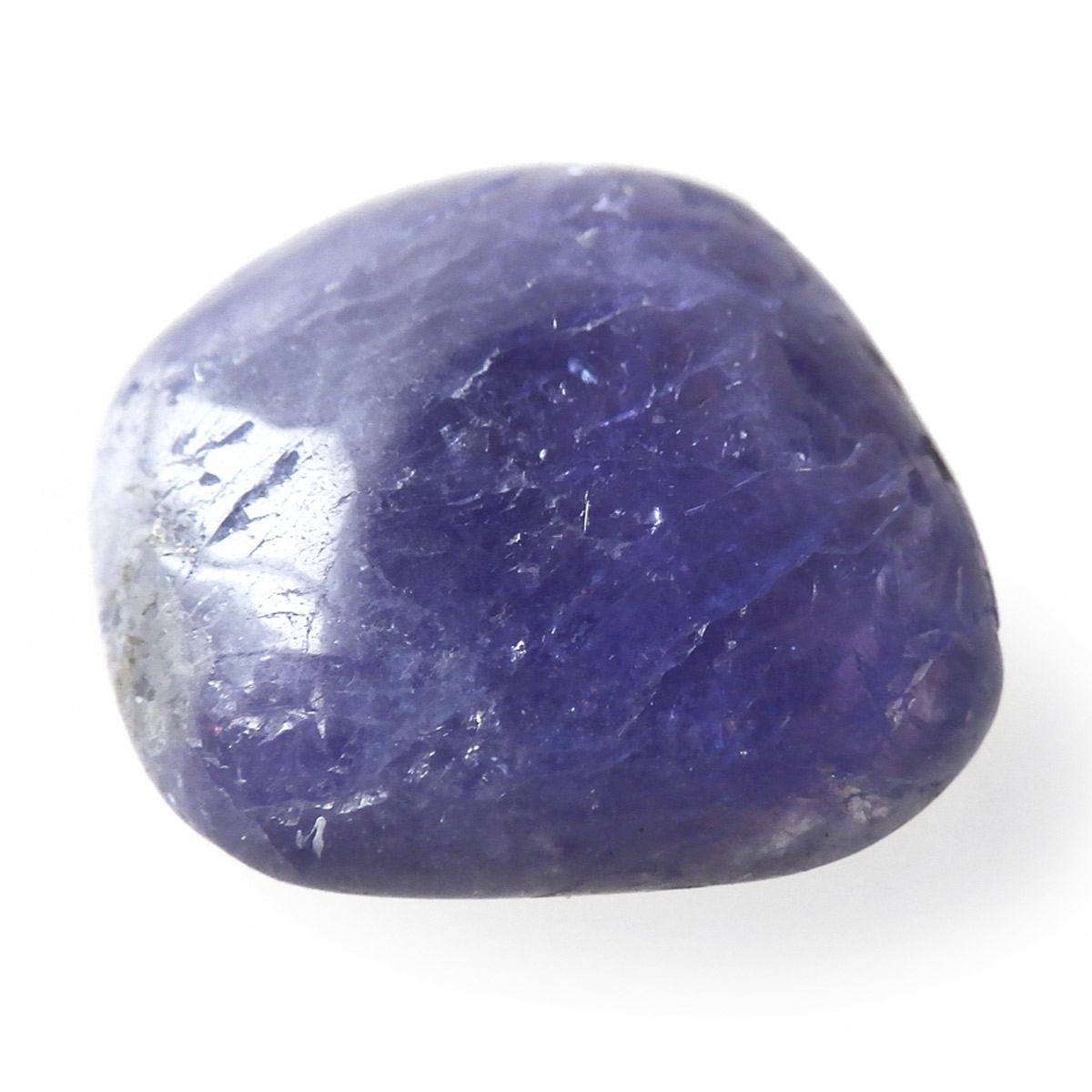 タンザニア産のタンザナイト、タンブルです。タンザナイトの和名は灰簾石。ゾイサイトグループのバリエーションの一つで、ピンク~赤色をしているものは「チューライト」、緑色をしているものは「アニョライト」、青色をしているものは「タンザナイト」と分類されます。タンザナイトは多色性という性質を持っており、見る角度によって青色や紫色が強くなるように表情が見られます。色は青から青紫でタンザナイトならではの魅力的な色彩。他にはないカラーが人気の天然石で、12月の誕生石とされています。