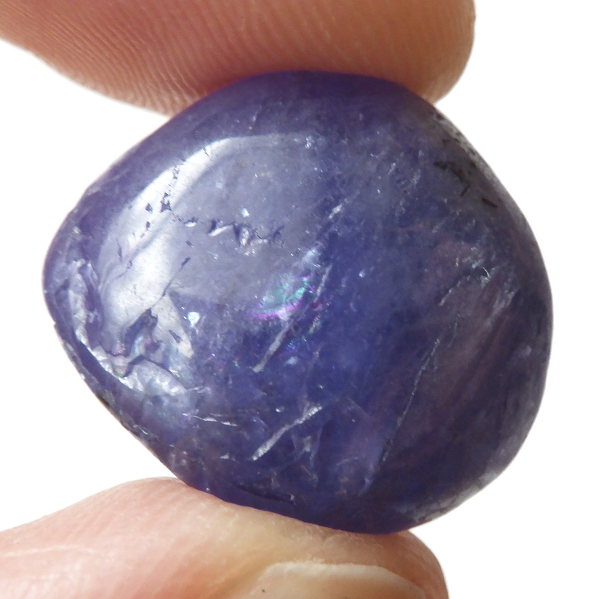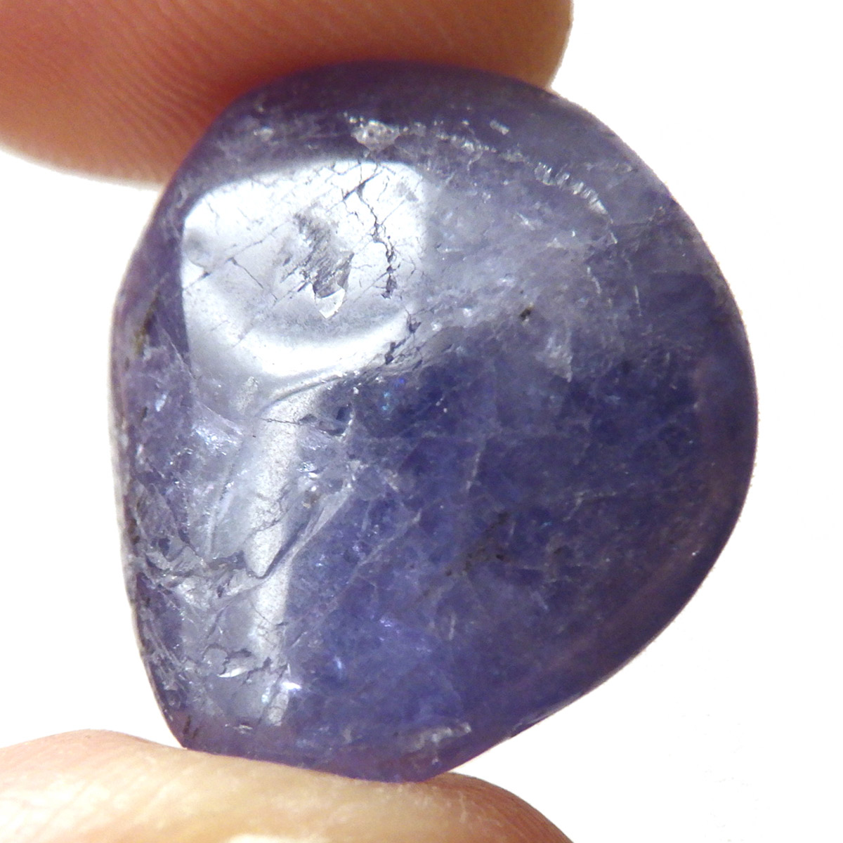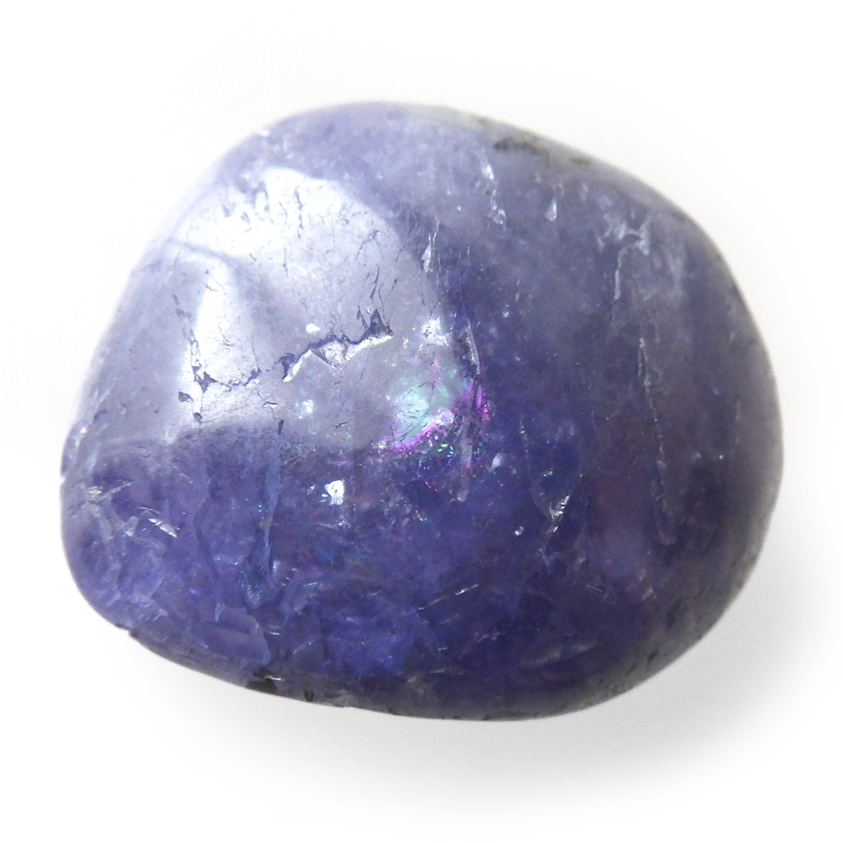 タンザニア産のタンザナイト、タンブルです。タンザナイトの和名は灰簾石。ゾイサイトグループのバリエーションの一つで、ピンク~赤色をしているものは「チューライト」、緑色をしているものは「アニョライト」、青色をしているものは「タンザナイト」と分類されます。タンザナイトは多色性という性質を持っており、見る角度によって青色や紫色が強くなるように表情が見られます。色は青から青紫でタンザナイトならではの魅力的な色彩。他にはないカラーが人気の天然石で、12月の誕生石とされています。