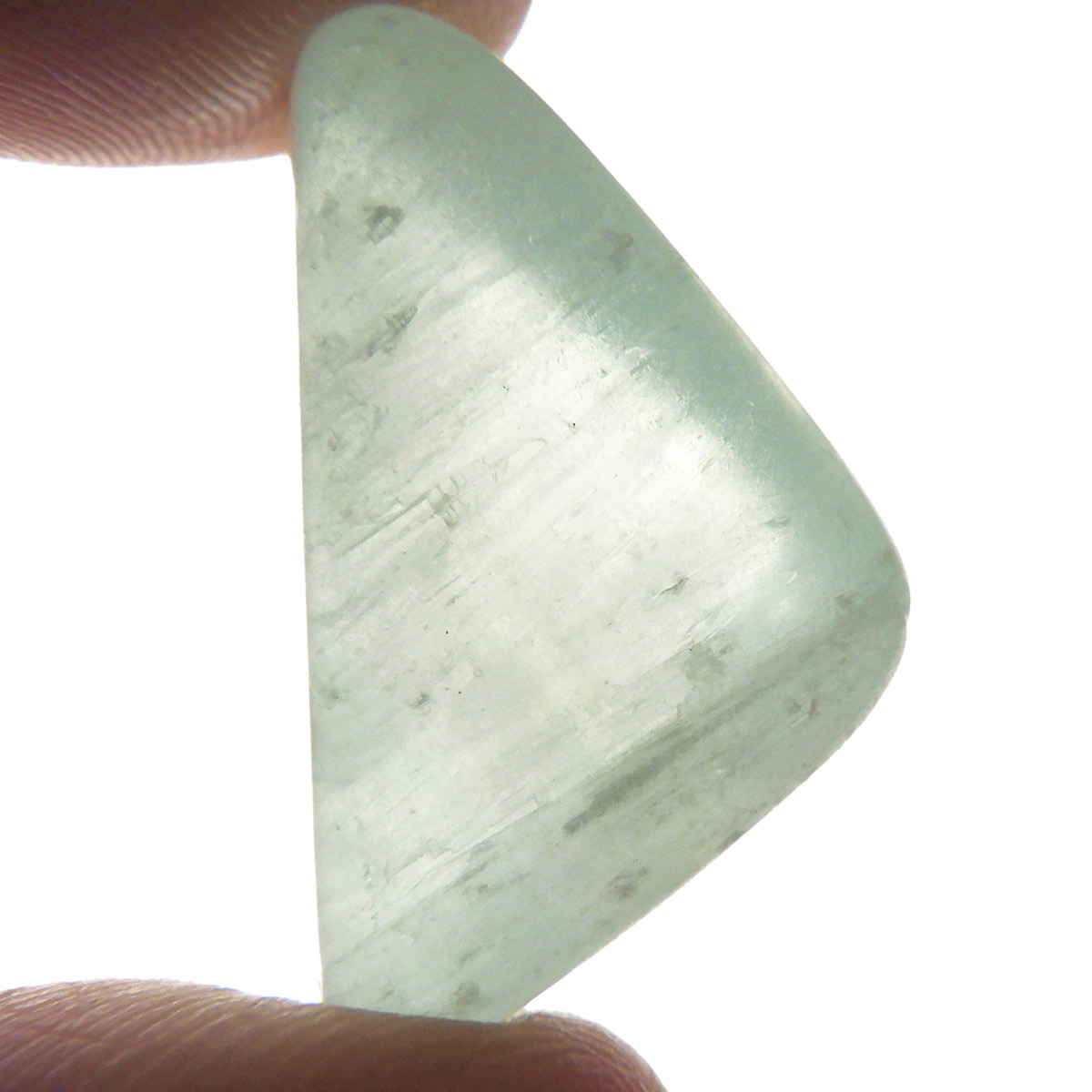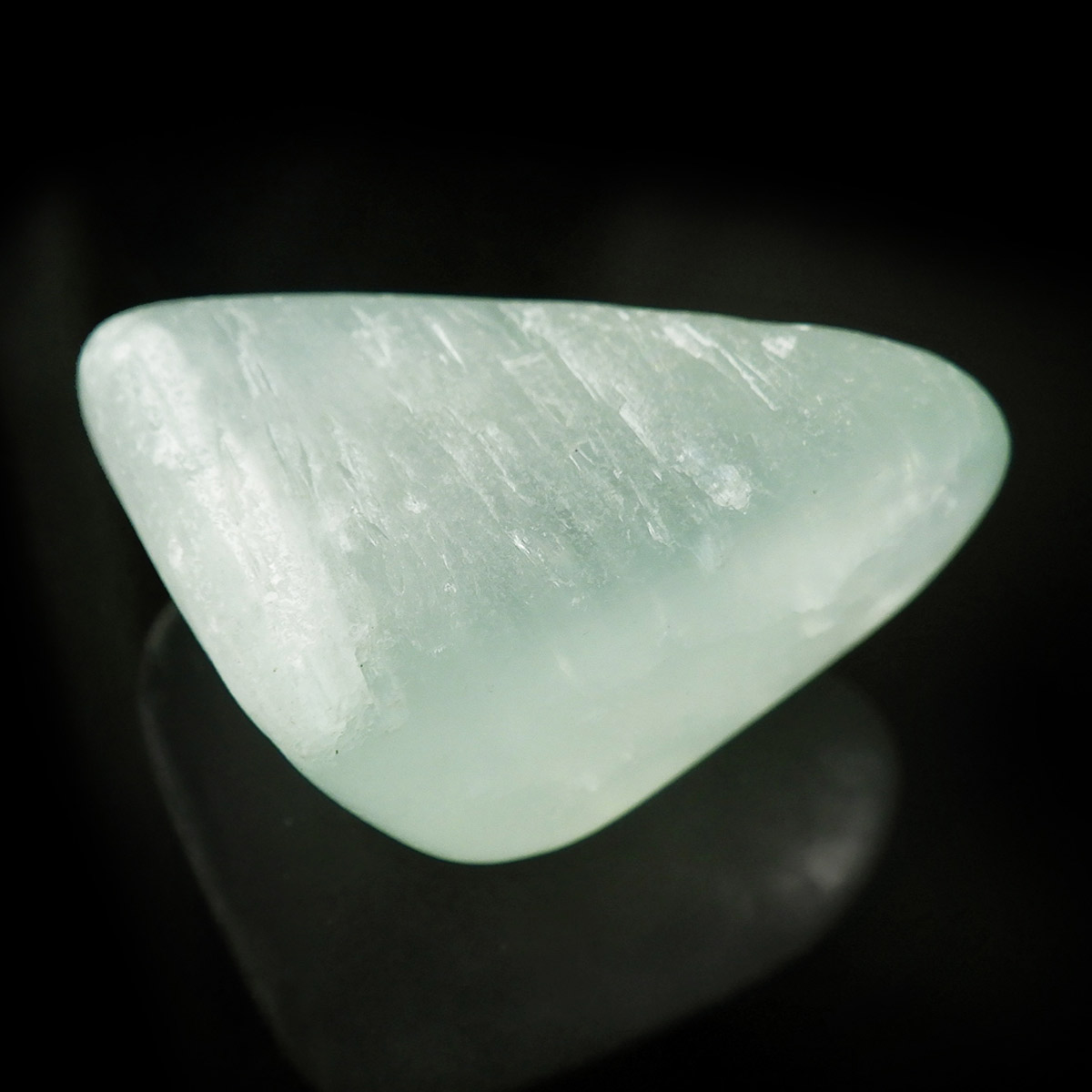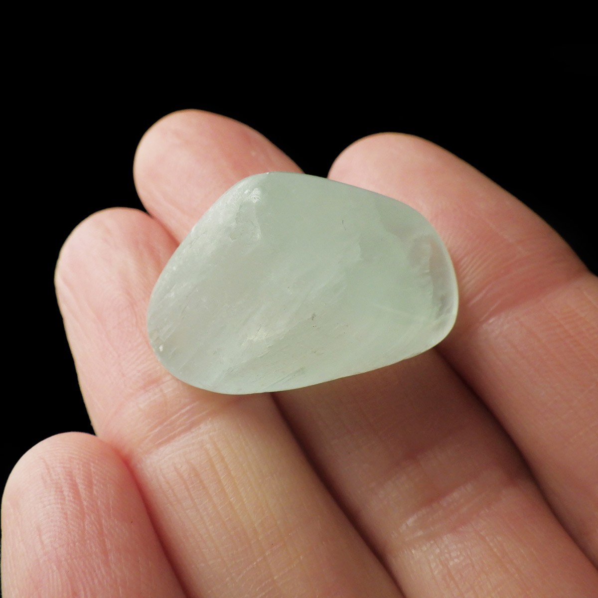 アフガニスタン産のピスタチオカルサイト(グリーンカルサイト)タンブルです。アフガニスタンでは、淡いピンクやブルー、グリーンなどの多彩なカルサイトが産出します。淡いグリーンのカルサイトは、その色調や濃淡などによって、様々なニックネームがあるようです。同じグリーンカルサイトでも、色が薄く縞目模様が確認出来るものなどは、海に浮かぶ泡に倣って シーフォームカルサイトなどと呼ばれる事もあるようです。このピスタチオカルサイトも、ニックネームで鉱物名ではありませんが、殻を剥いたあとのピスタチオのように、鮮やかでかわいらしいカルサイトです。