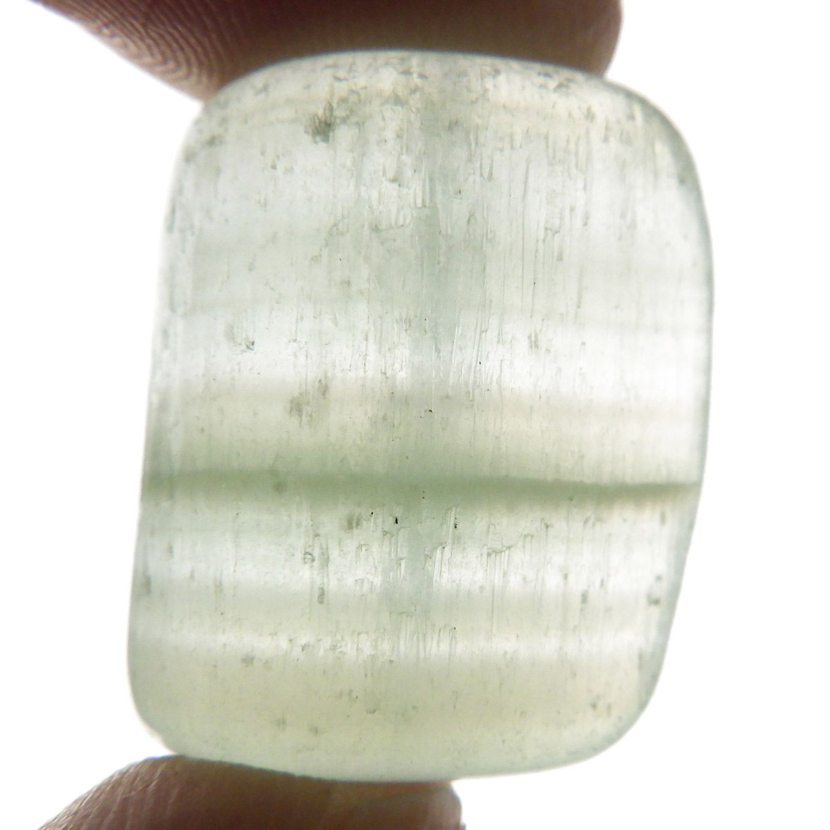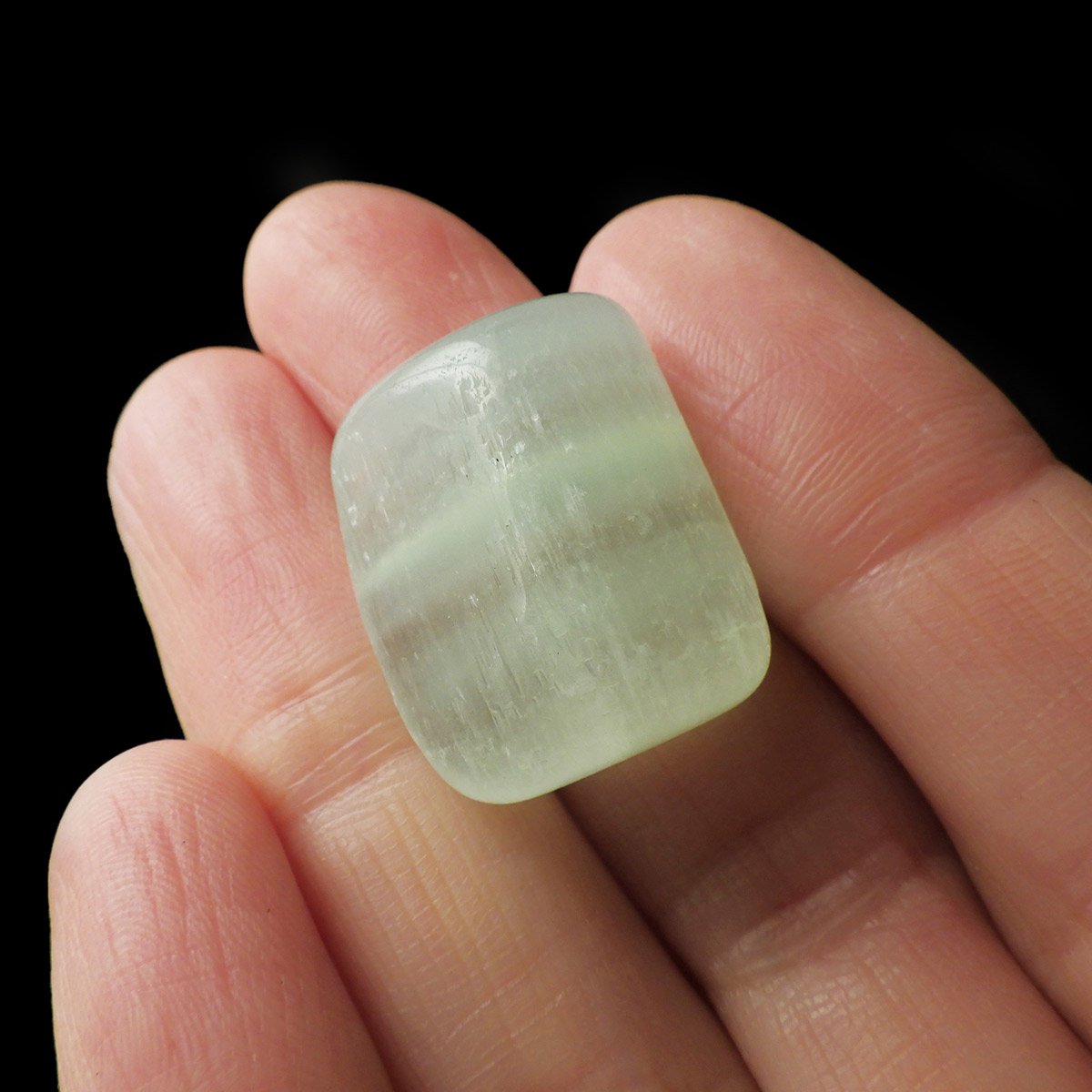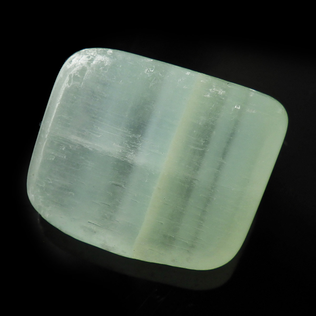 アフガニスタン産のピスタチオカルサイト(グリーンカルサイト)タンブルです。アフガニスタンでは、淡いピンクやブルー、グリーンなどの多彩なカルサイトが産出します。淡いグリーンのカルサイトは、その色調や濃淡などによって、様々なニックネームがあるようです。同じグリーンカルサイトでも、色が薄く縞目模様が確認出来るものなどは、海に浮かぶ泡に倣って シーフォームカルサイトなどと呼ばれる事もあるようです。このピスタチオカルサイトも、ニックネームで鉱物名ではありませんが、殻を剥いたあとのピスタチオのように、鮮やかでかわいらしいカルサイトです。