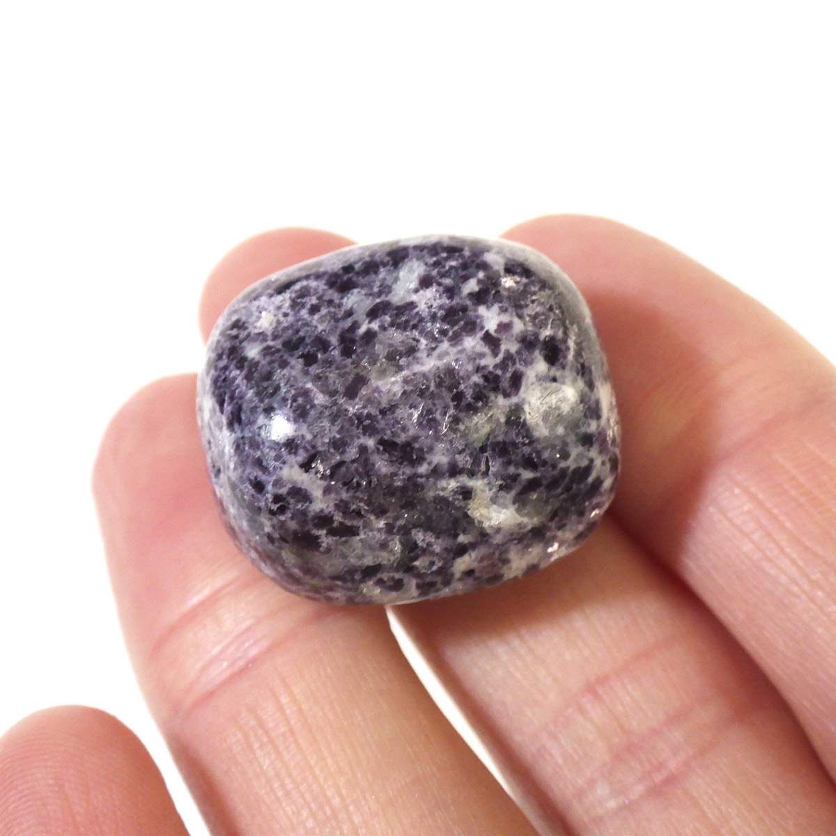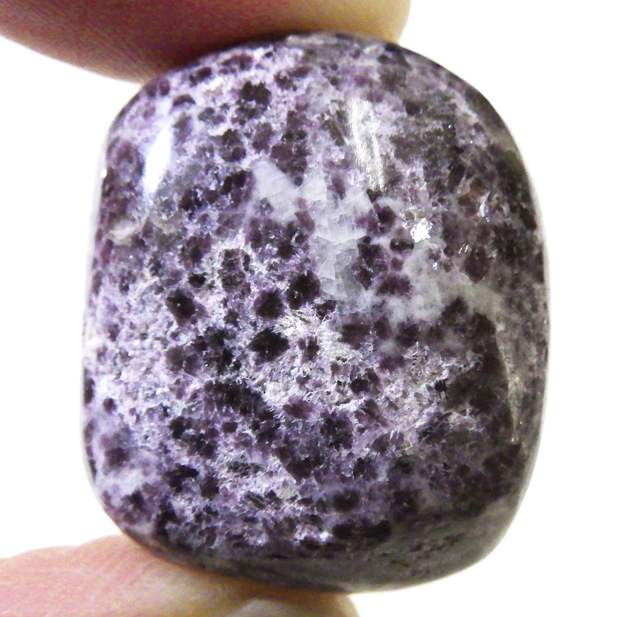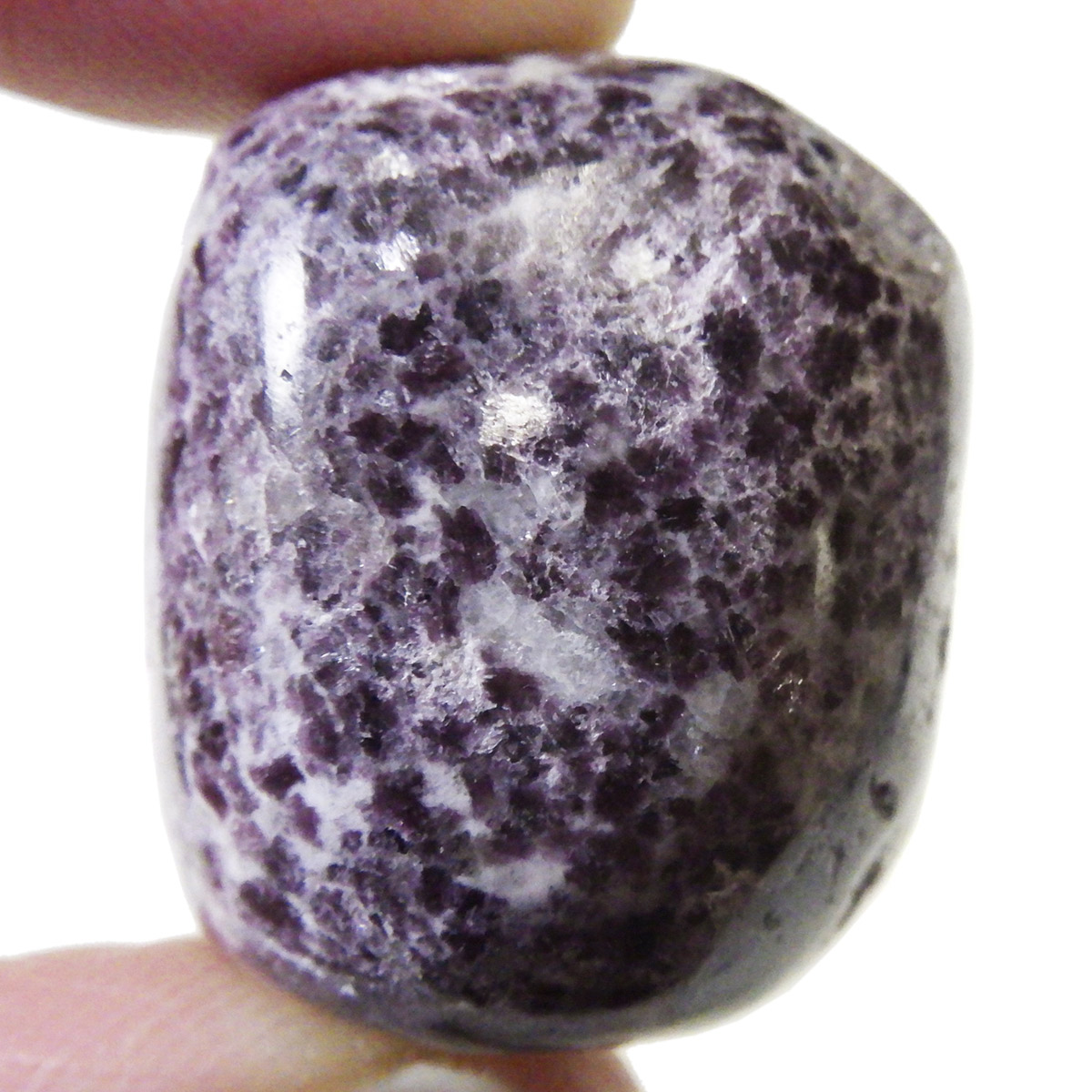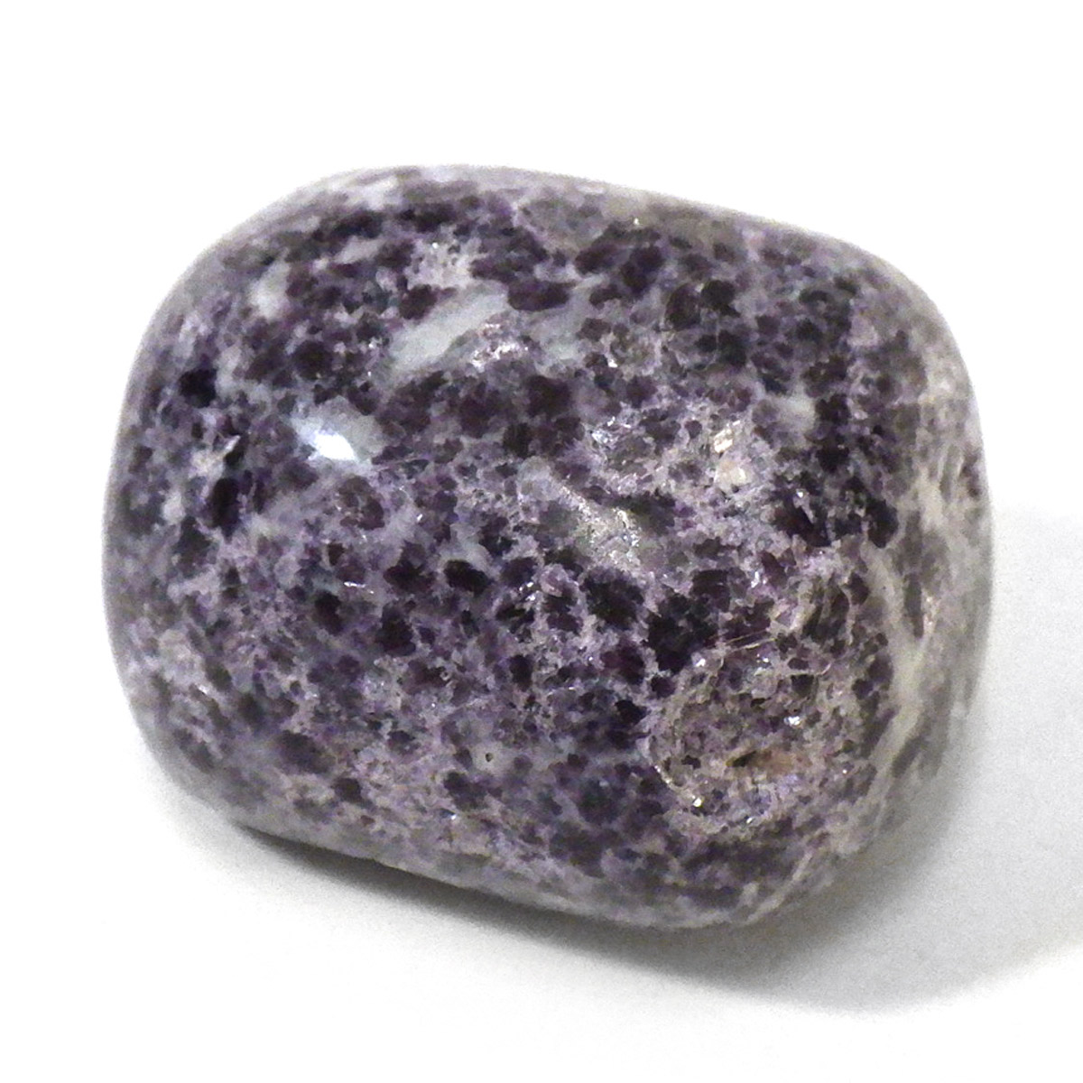 ペルー産のレピドライト、タンブルです。レピドライトの最大の特徴は、落ち着いたダークパープルの色合いと、光の当たる角度によって見られる、キラキラとした美しい輝きです。雲母の一種で、リチウムを多く含んでいるため、和名を「リチア雲母」と言います。このキラキラとした輝きは、雲母によるものです。