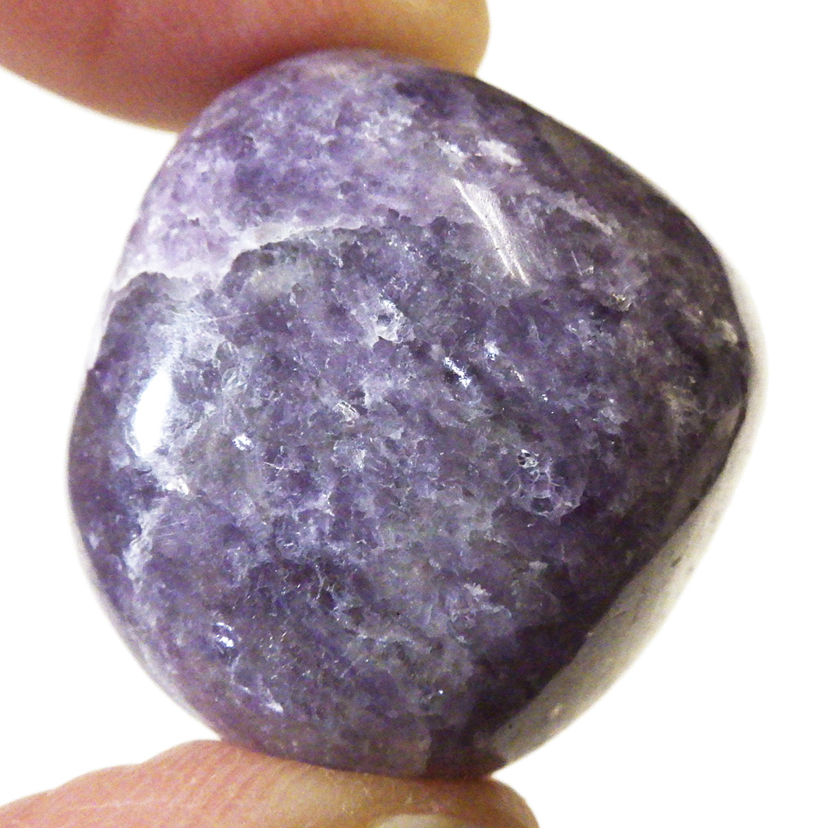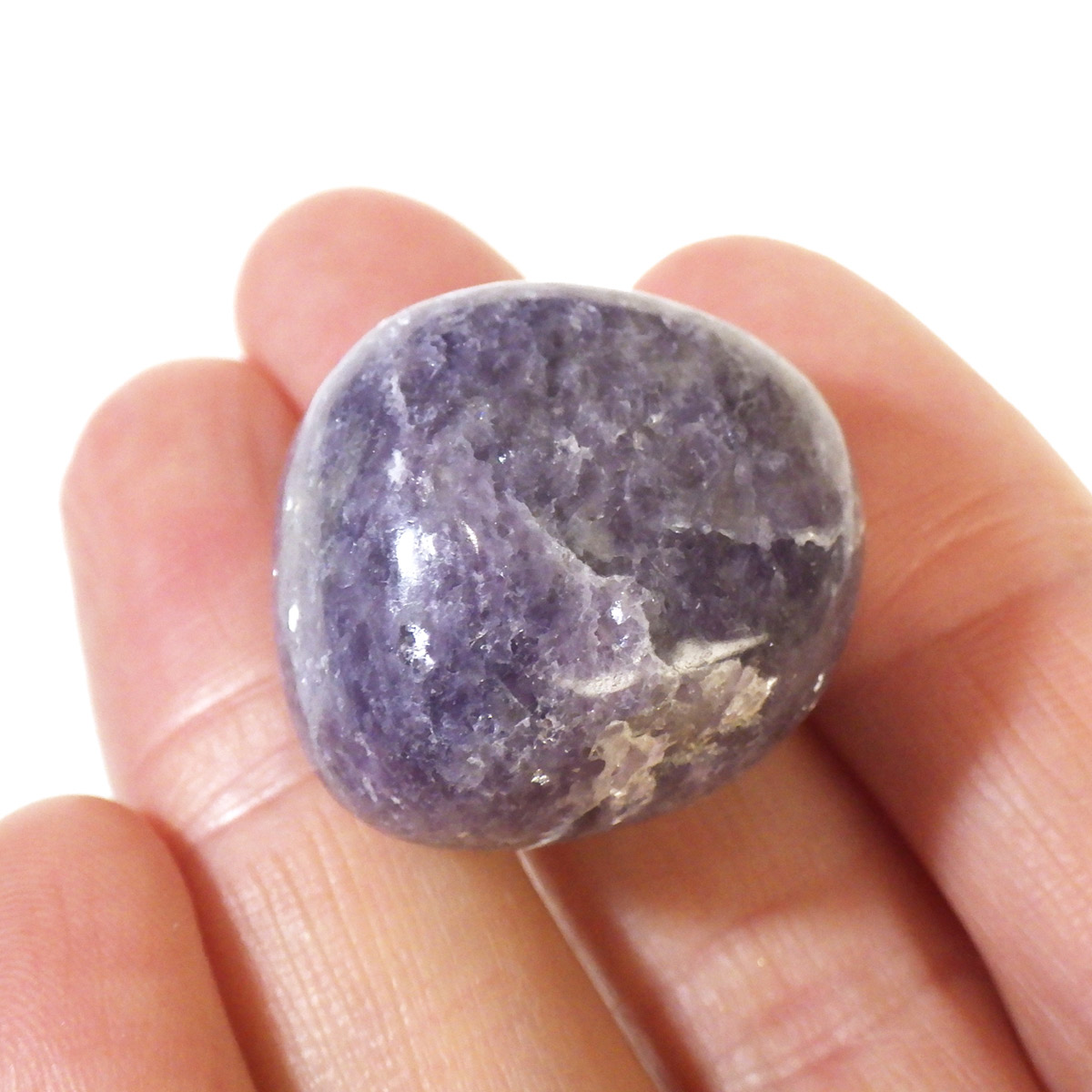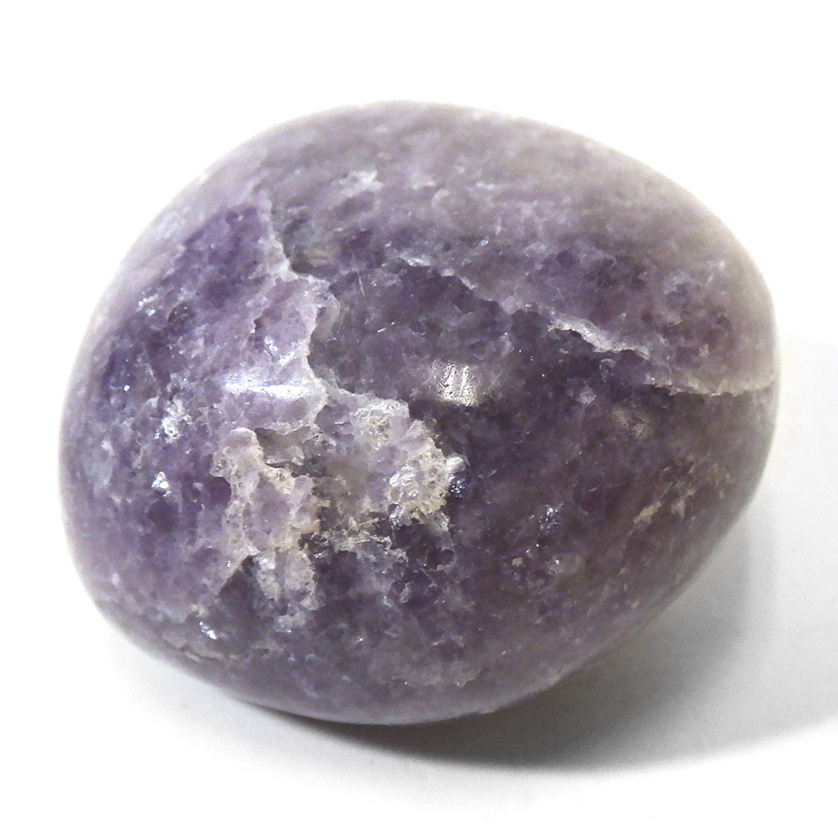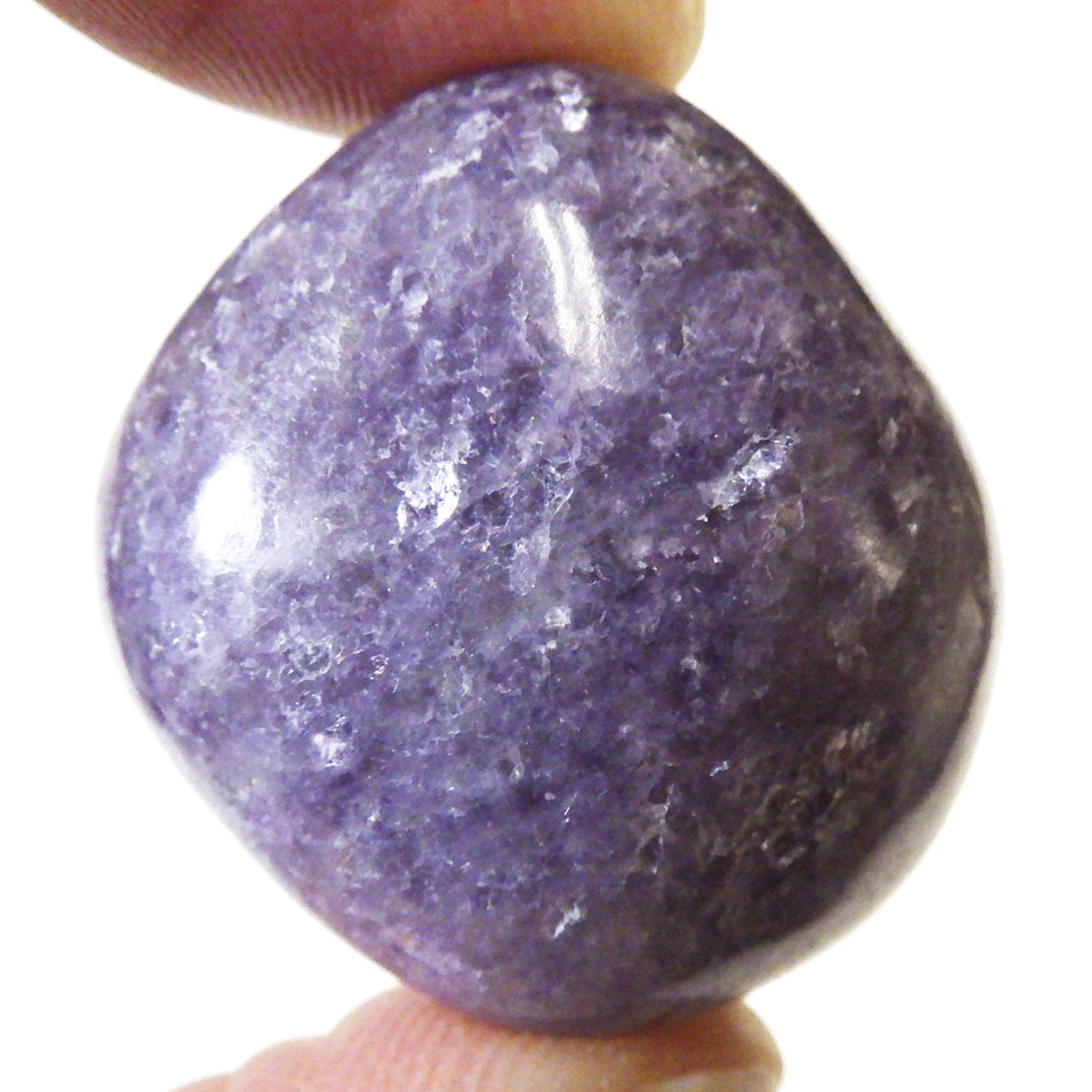 ペルー産のレピドライト、タンブルです。レピドライトの最大の特徴は、落ち着いたダークパープルの色合いと、光の当たる角度によって見られる、キラキラとした美しい輝きです。雲母の一種で、リチウムを多く含んでいるため、和名を「リチア雲母」と言います。このキラキラとした輝きは、雲母によるものです。