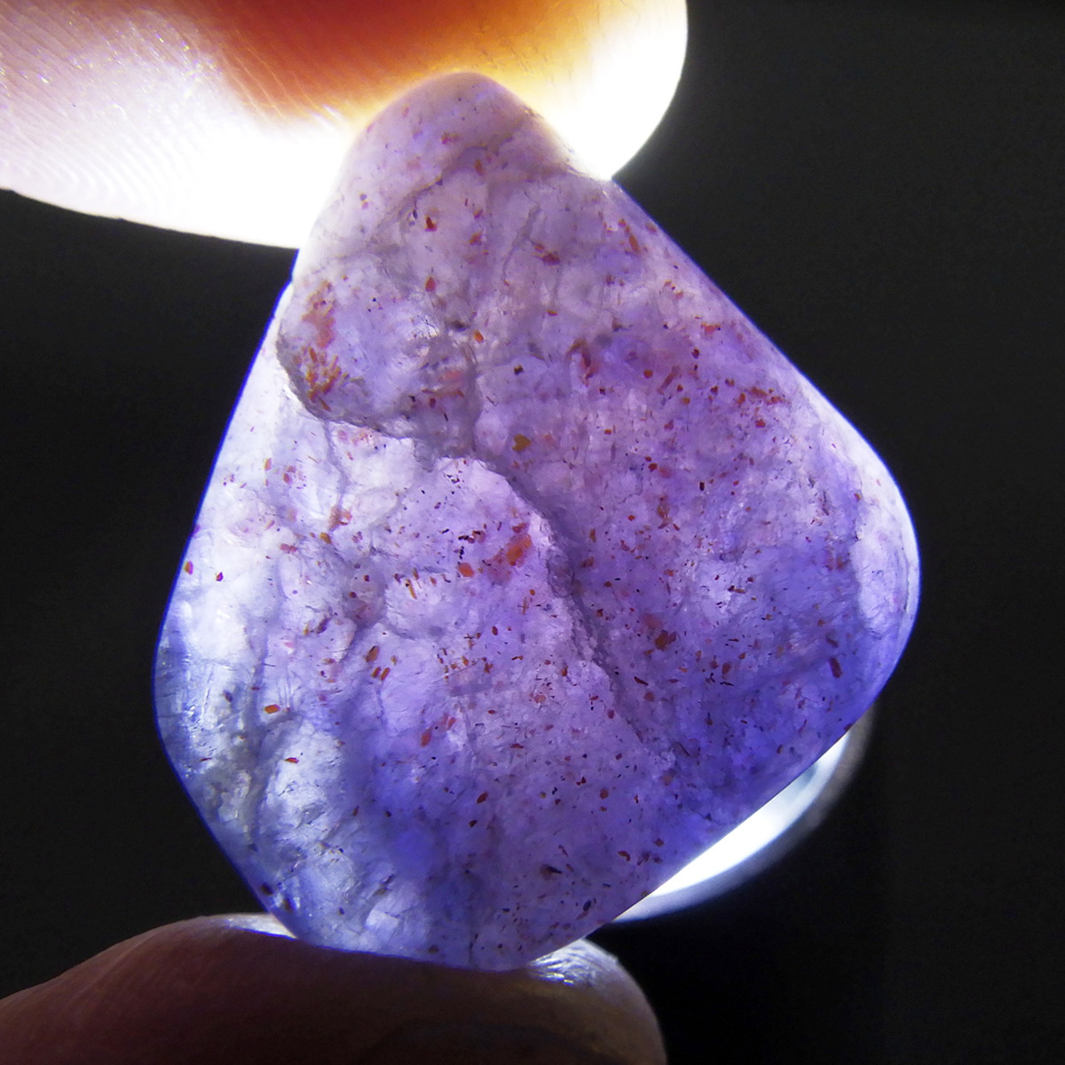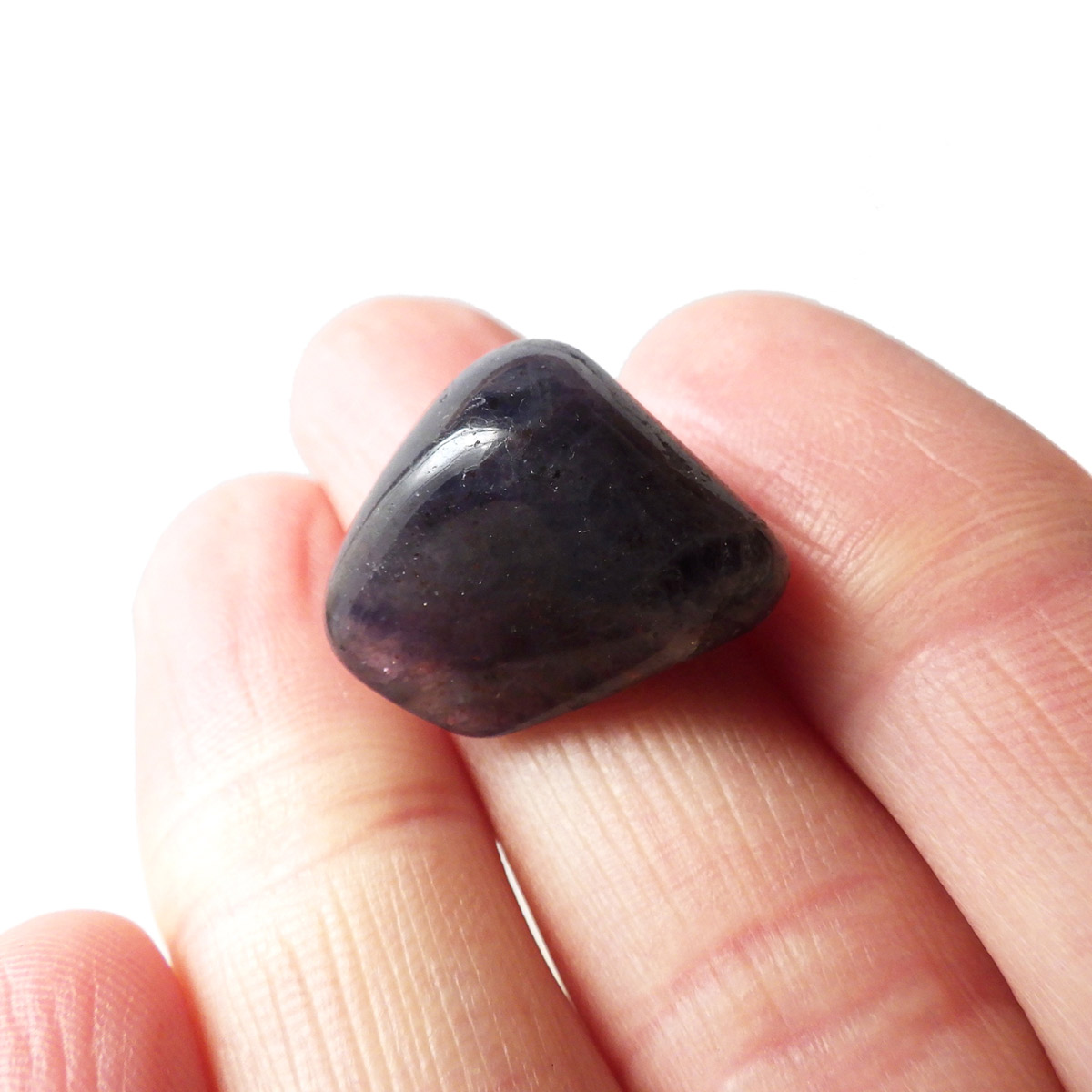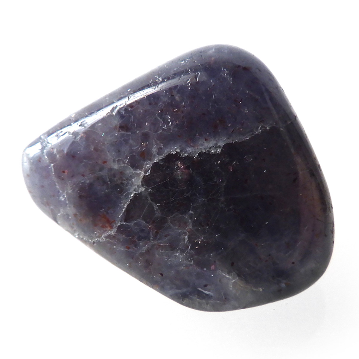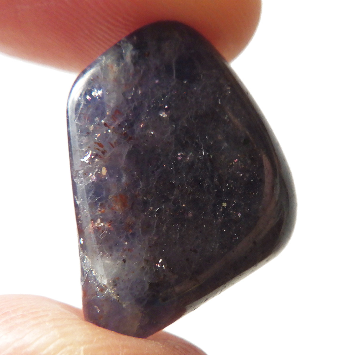 インド産のアイオライト、タンブルです。アイオライトは見る角度によって色が変化するという神秘的な鉱石です。広域変成岩や接触変成岩などで発見されるケイ酸塩鉱物の一種で、多色性が強く、見る角度によって群青色から淡い枯れ草色に変化します。透明度こそ高くはありませんが、光に透かすとブラッドショットと呼ばれる赤い斑点が見られるブラッドショットアイオライトとも呼ばれています。またサンストーンのようなキラキラとしたアベンチュレッセンスも見られます。