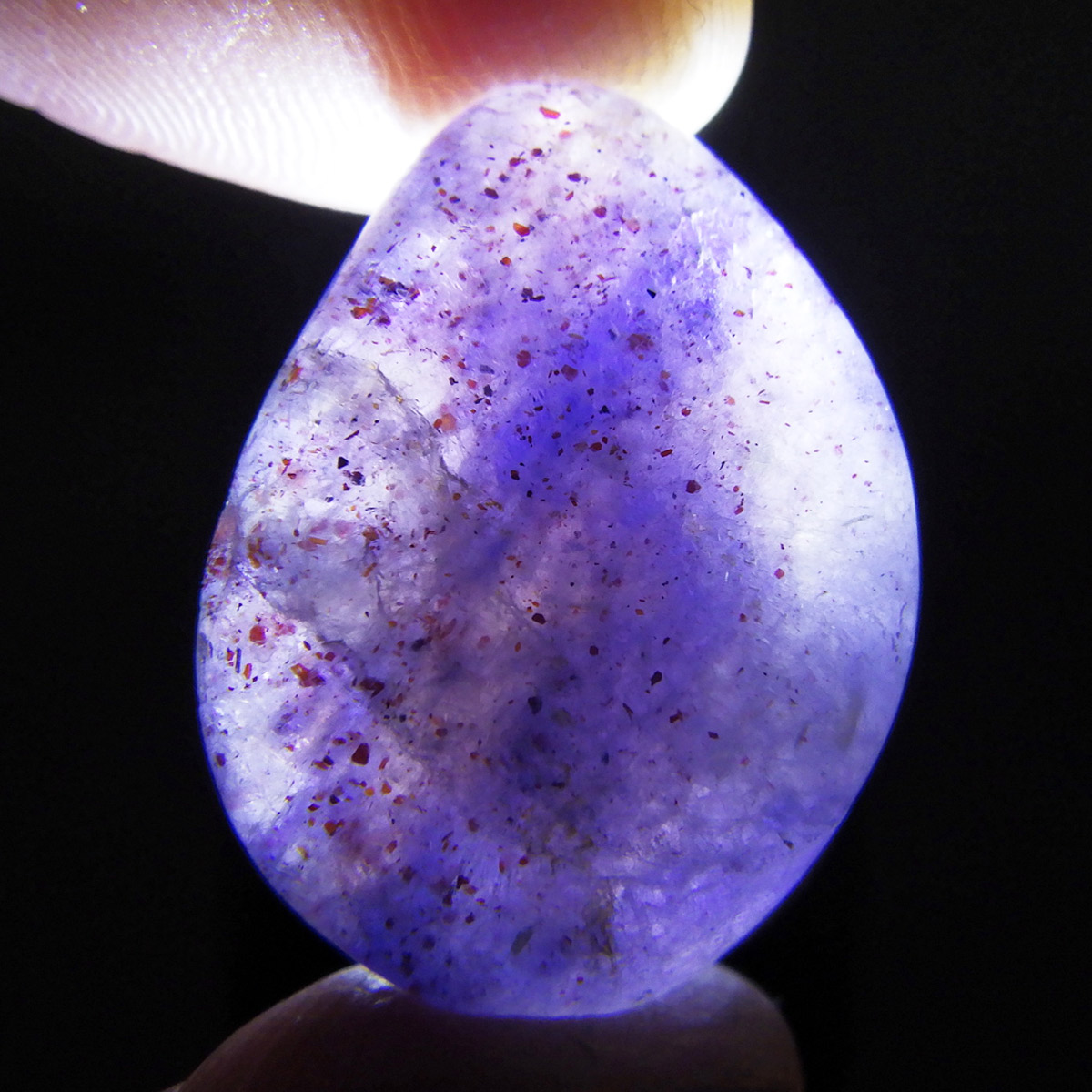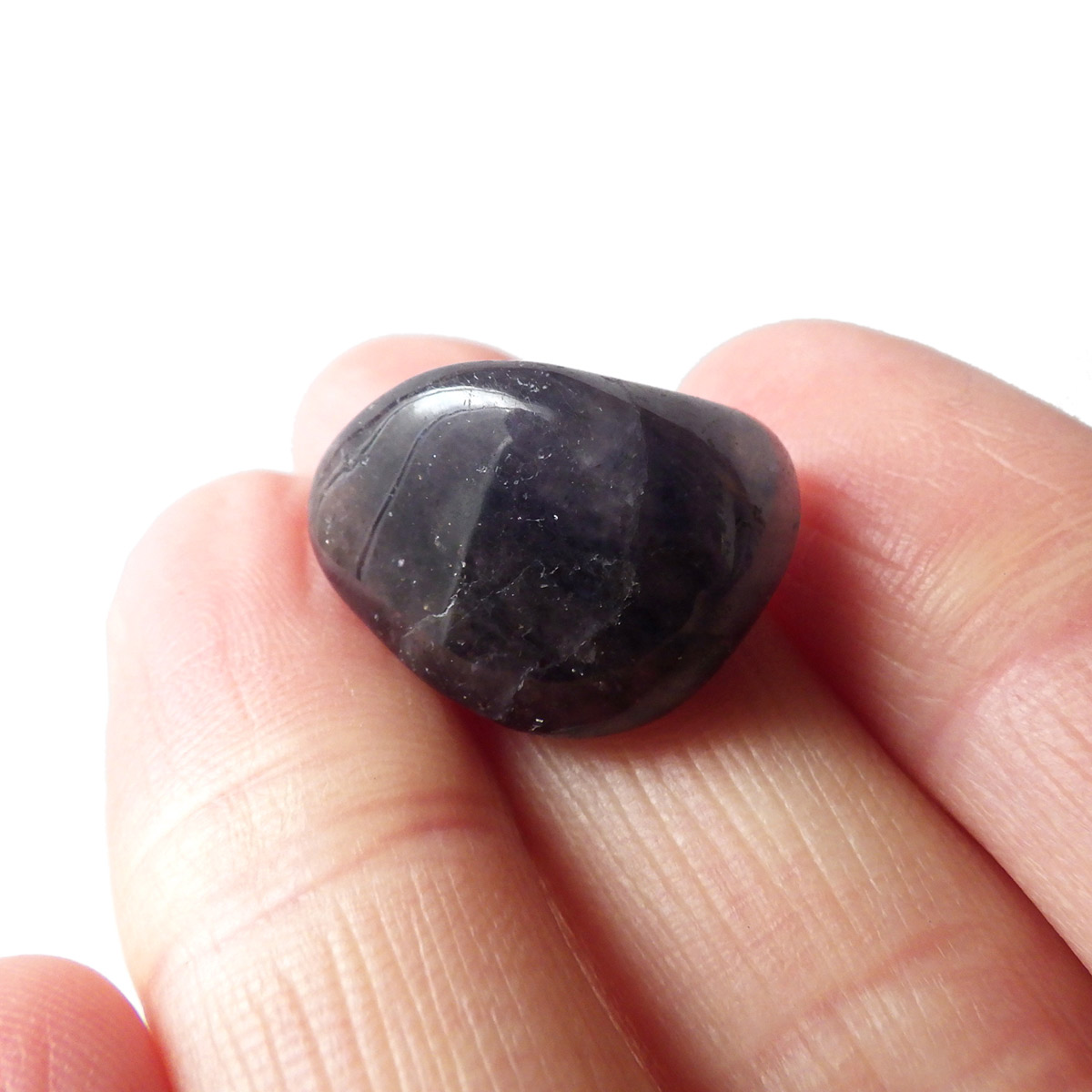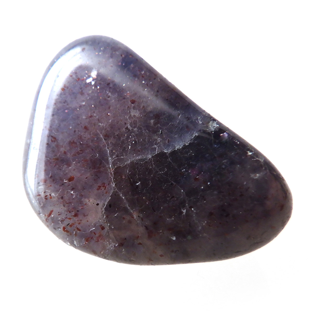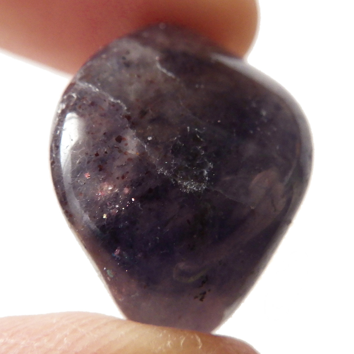 インド産のアイオライト、タンブルです。アイオライトは見る角度によって色が変化するという神秘的な鉱石です。広域変成岩や接触変成岩などで発見されるケイ酸塩鉱物の一種で、多色性が強く、見る角度によって群青色から淡い枯れ草色に変化します。透明度こそ高くはありませんが、光に透かすとブラッドショットと呼ばれる赤い斑点が見られるブラッドショットアイオライトとも呼ばれています。またサンストーンのようなキラキラとしたアベンチュレッセンスも見られます。