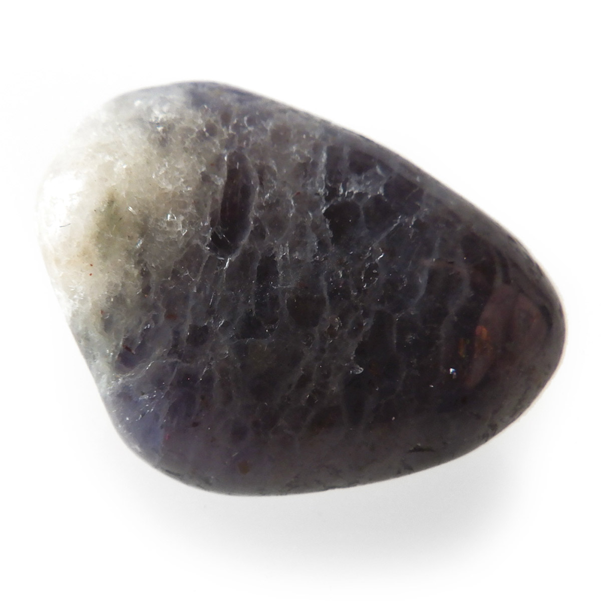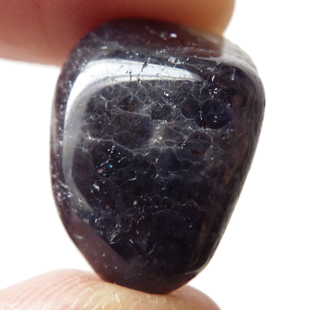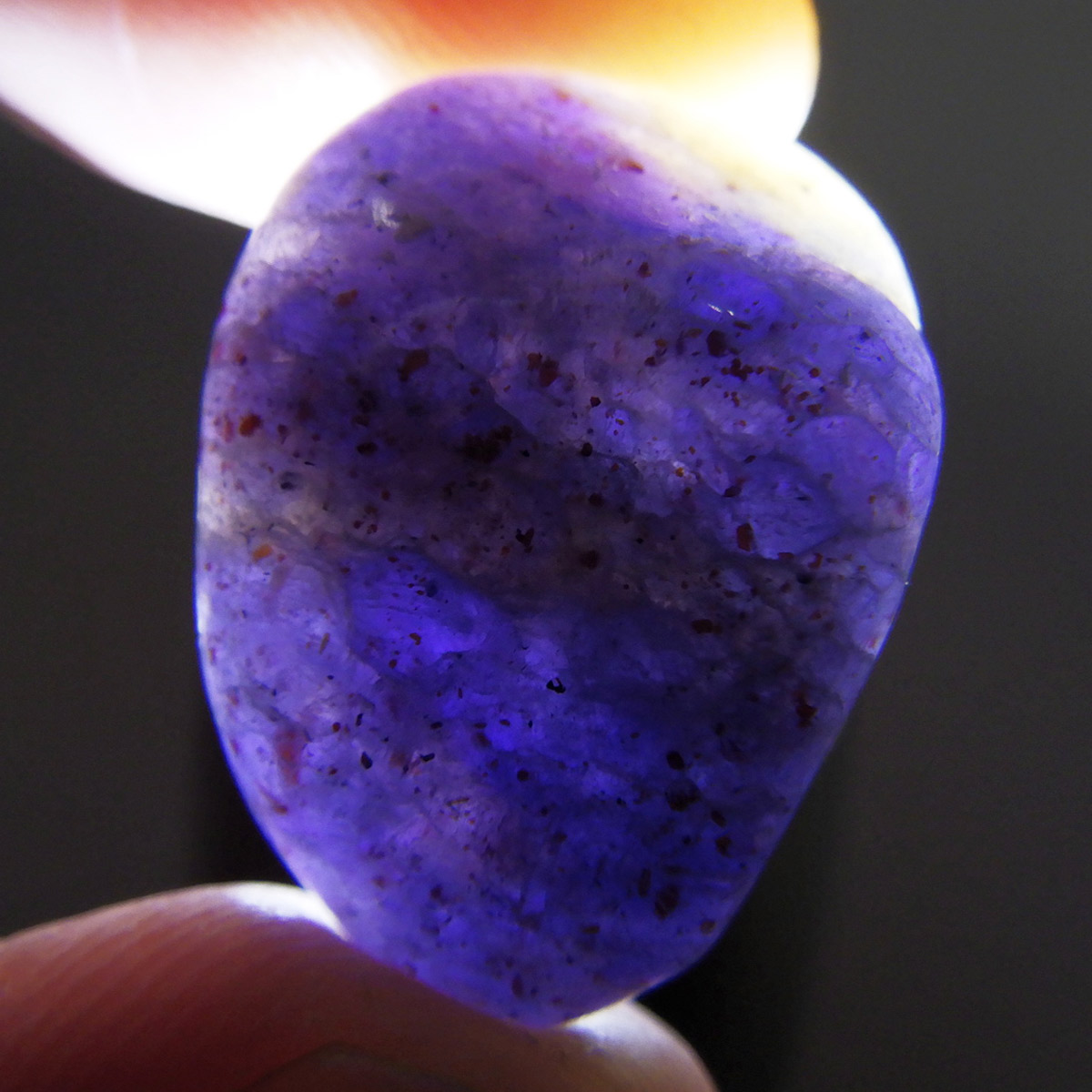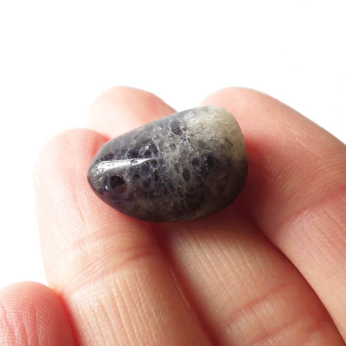 インド産のアイオライト、タンブルです。アイオライトは見る角度によって色が変化するという神秘的な鉱石です。広域変成岩や接触変成岩などで発見されるケイ酸塩鉱物の一種で、多色性が強く、見る角度によって群青色から淡い枯れ草色に変化します。透明度こそ高くはありませんが、光に透かすとブラッドショットと呼ばれる赤い斑点が見られるブラッドショットアイオライトとも呼ばれています。またサンストーンのようなキラキラとしたアベンチュレッセンスも見られます。