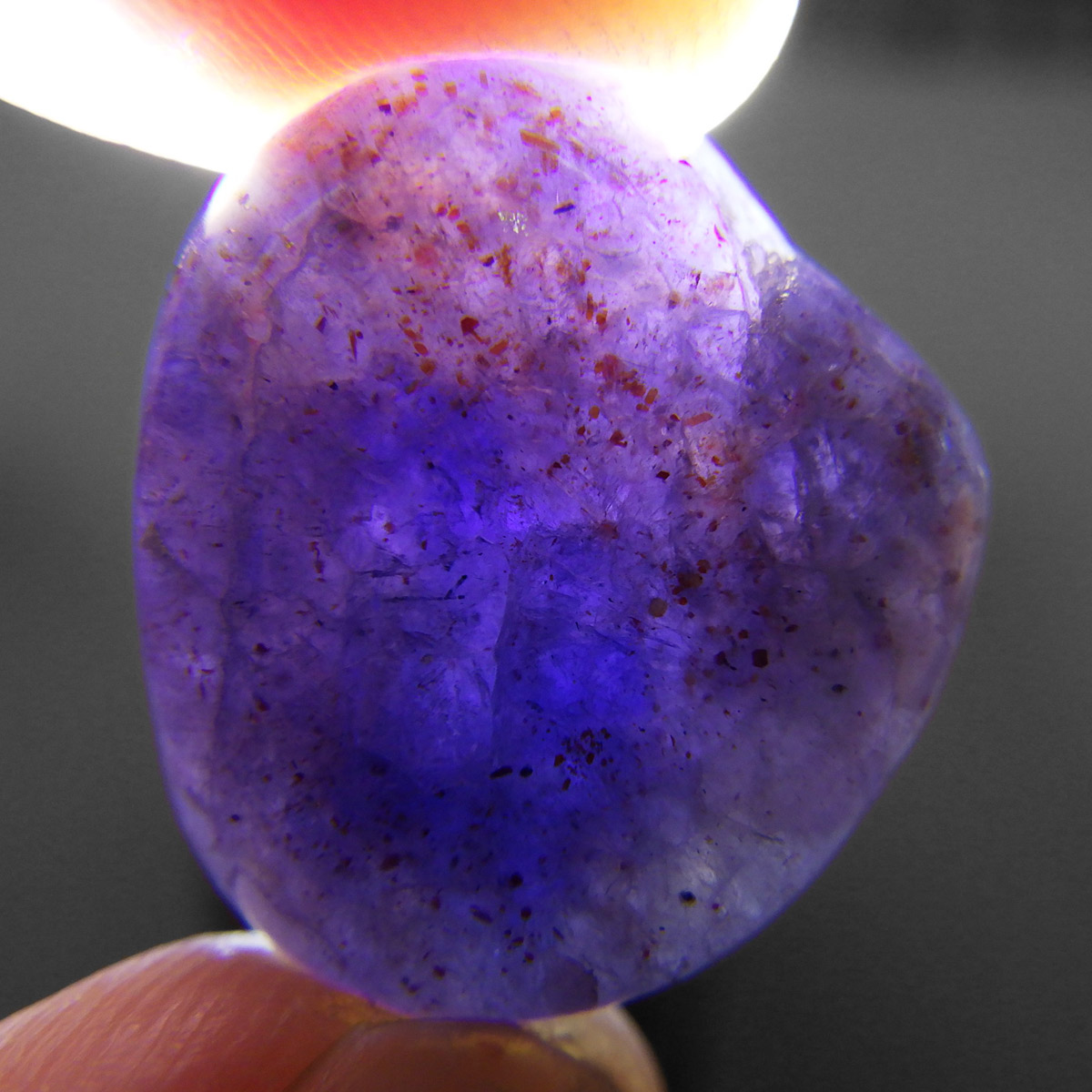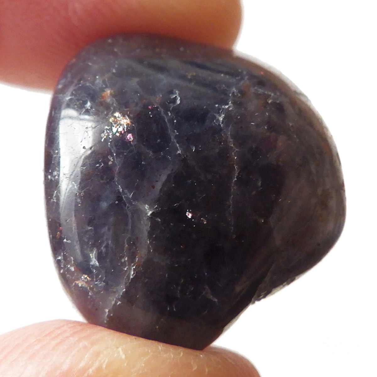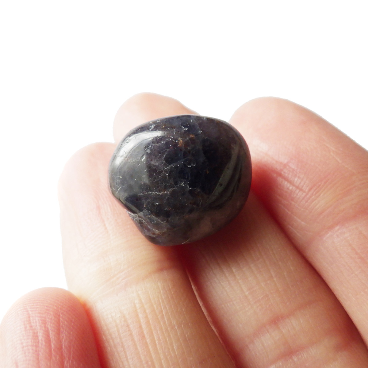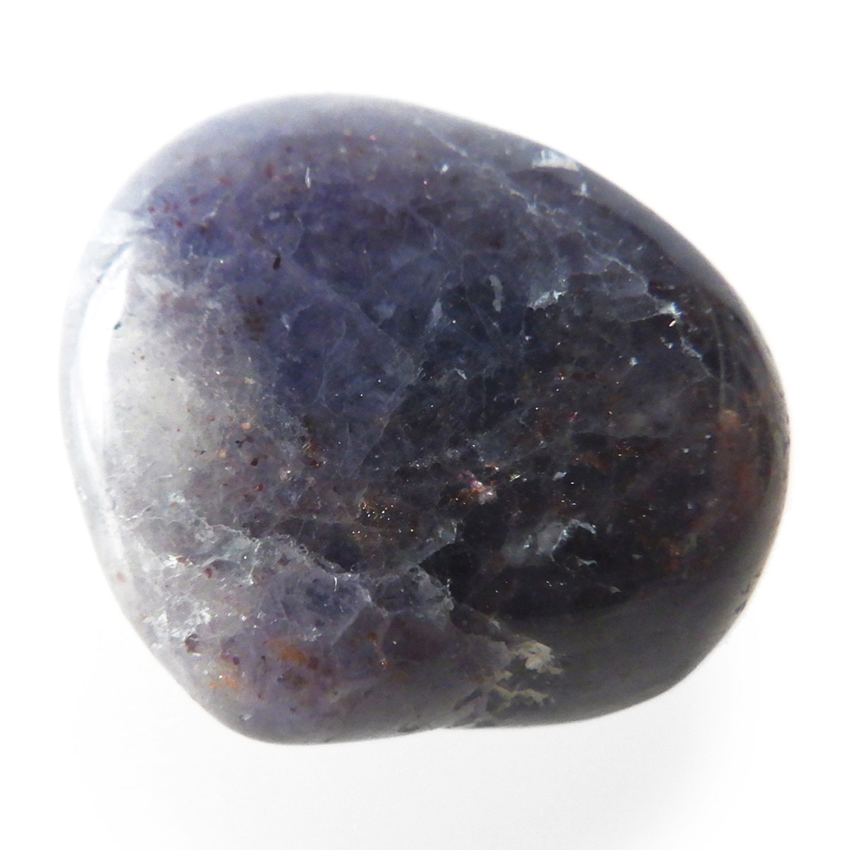 インド産のアイオライト、タンブルです。アイオライトは見る角度によって色が変化するという神秘的な鉱石です。広域変成岩や接触変成岩などで発見されるケイ酸塩鉱物の一種で、多色性が強く、見る角度によって群青色から淡い枯れ草色に変化します。透明度こそ高くはありませんが、光に透かすとブラッドショットと呼ばれる赤い斑点が見られるブラッドショットアイオライトとも呼ばれています。またサンストーンのようなキラキラとしたアベンチュレッセンスも見られます。