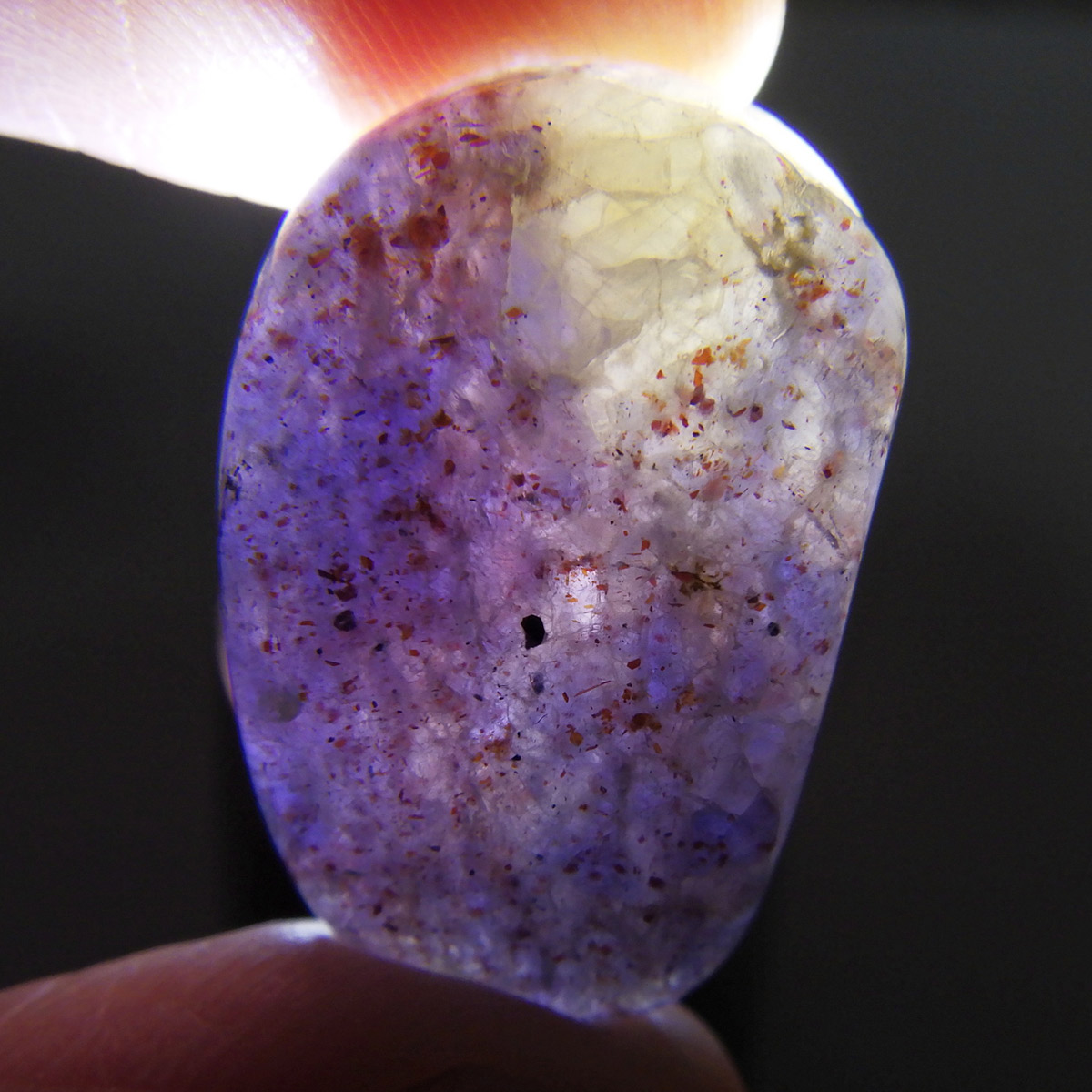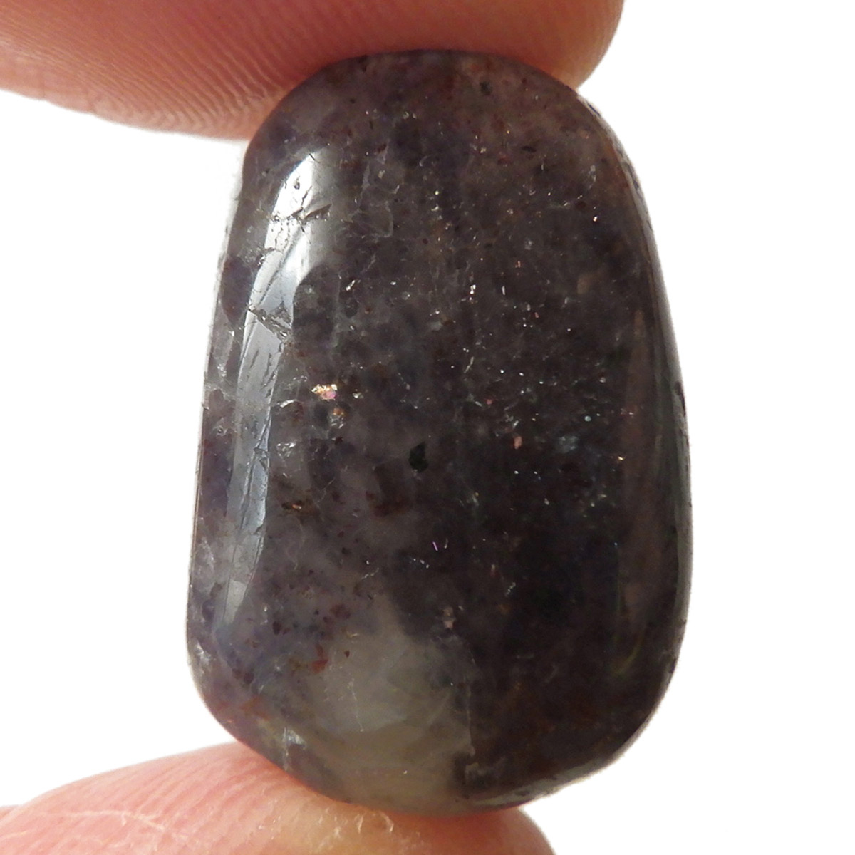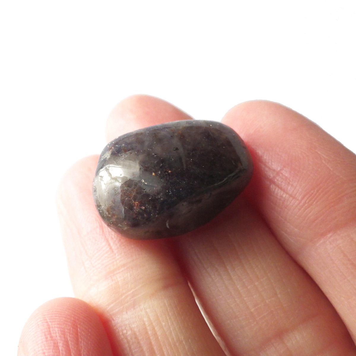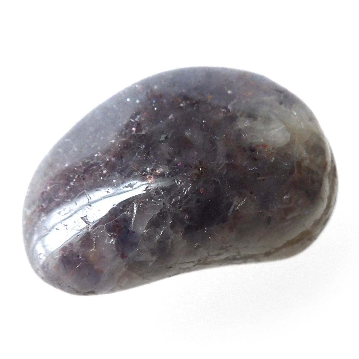インド産のアイオライト、タンブルです。アイオライトは見る角度によって色が変化するという神秘的な鉱石です。広域変成岩や接触変成岩などで発見されるケイ酸塩鉱物の一種で、多色性が強く、見る角度によって群青色から淡い枯れ草色に変化します。透明度こそ高くはありませんが、光に透かすとブラッドショットと呼ばれる赤い斑点が見られるブラッドショットアイオライトとも呼ばれています。またサンストーンのようなキラキラとしたアベンチュレッセンスも見られます。