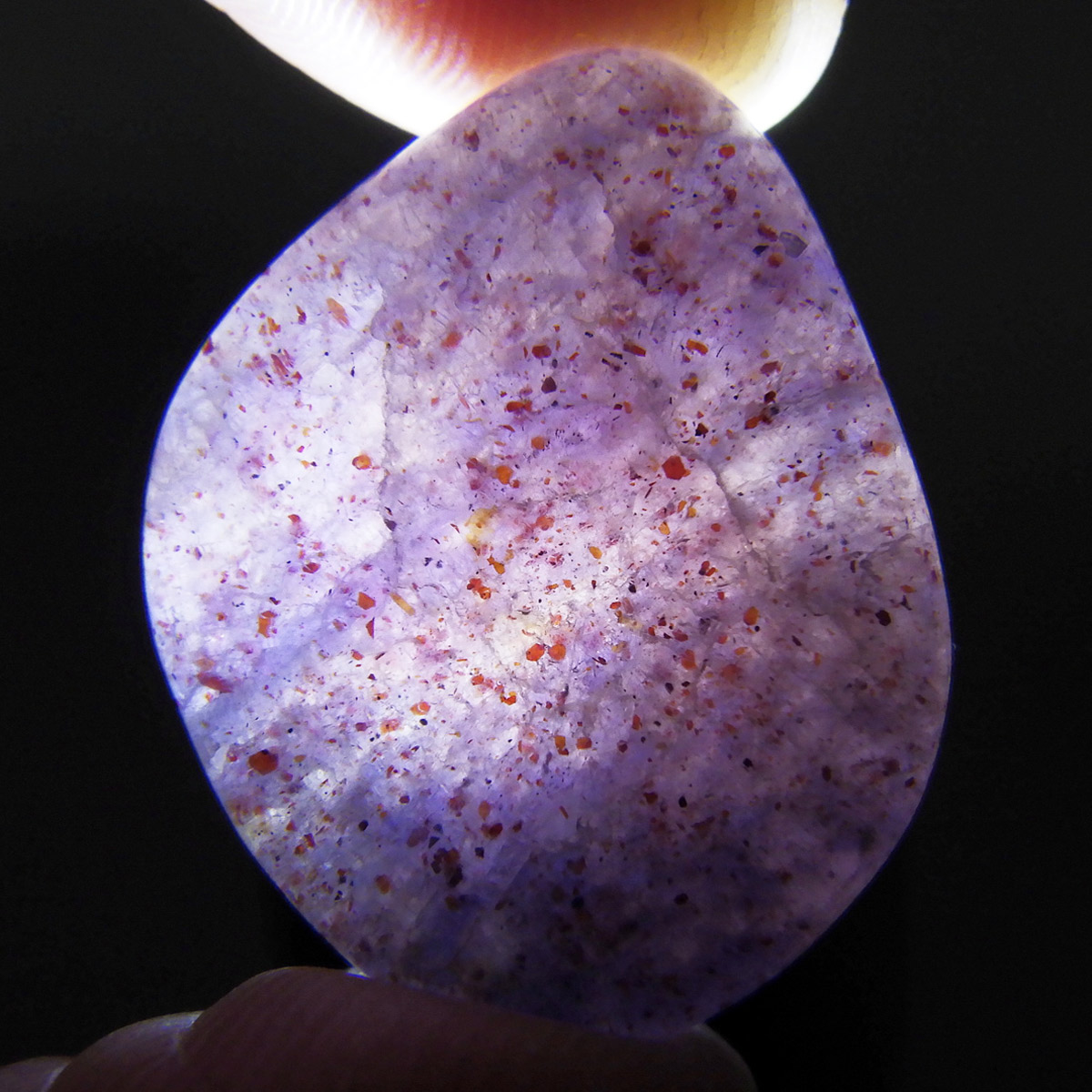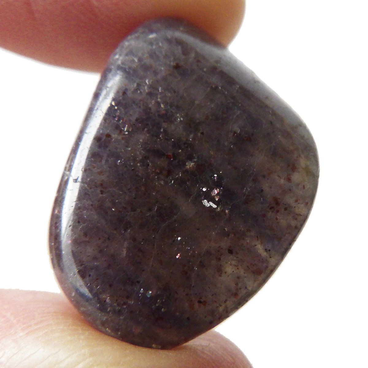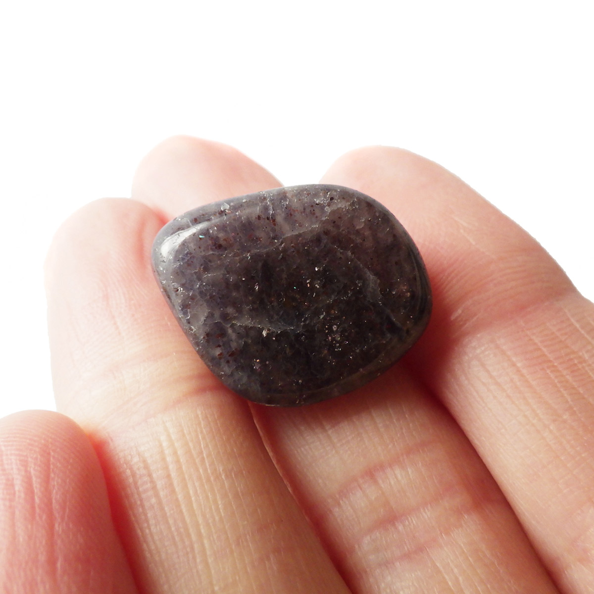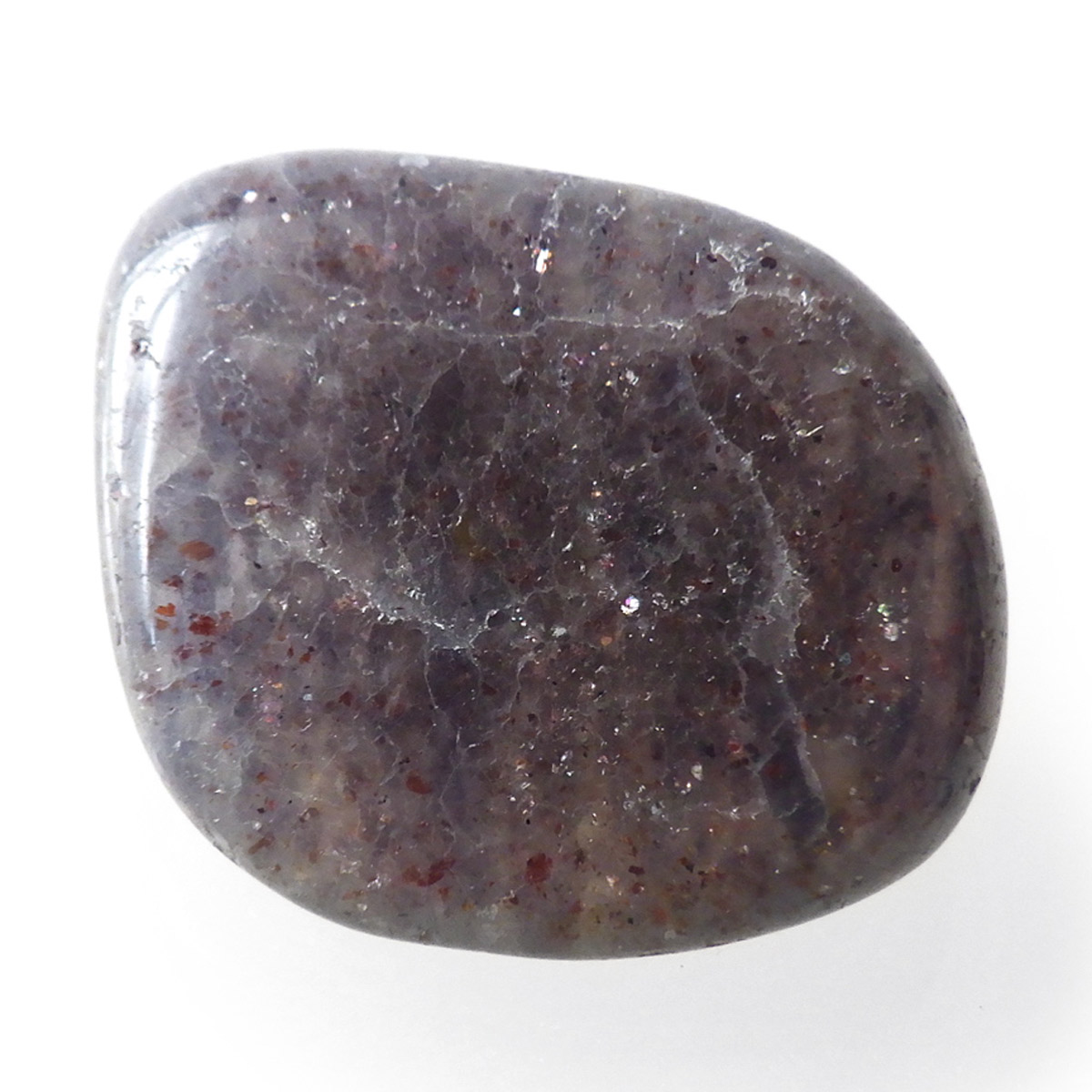 インド産のアイオライト、タンブルです。アイオライトは見る角度によって色が変化するという神秘的な鉱石です。広域変成岩や接触変成岩などで発見されるケイ酸塩鉱物の一種で、多色性が強く、見る角度によって群青色から淡い枯れ草色に変化します。透明度こそ高くはありませんが、光に透かすとブラッドショットと呼ばれる赤い斑点が見られるブラッドショットアイオライトとも呼ばれています。またサンストーンのようなキラキラとしたアベンチュレッセンスも見られます。