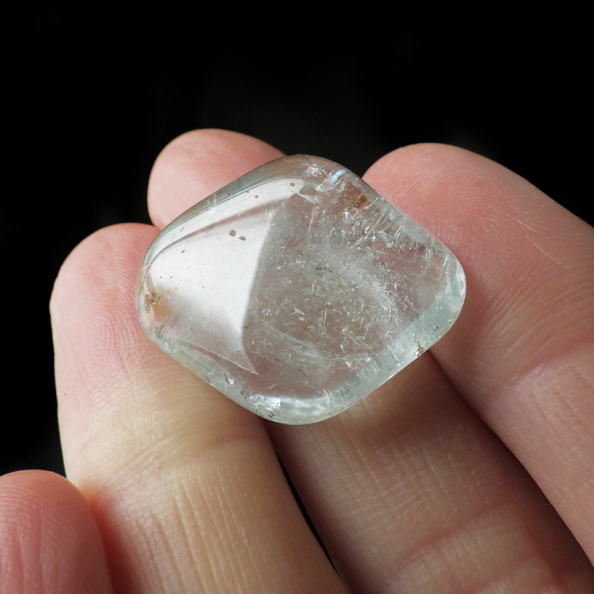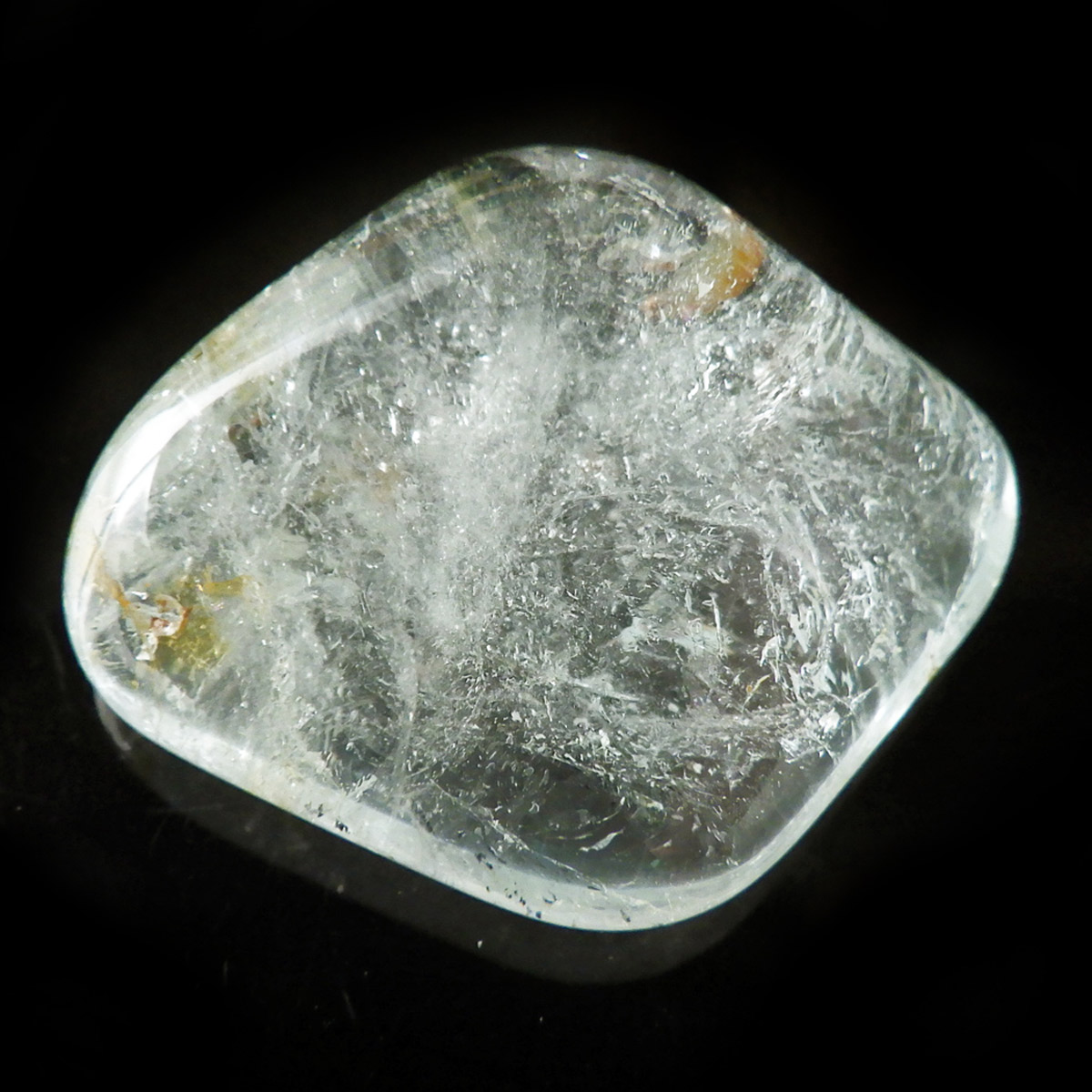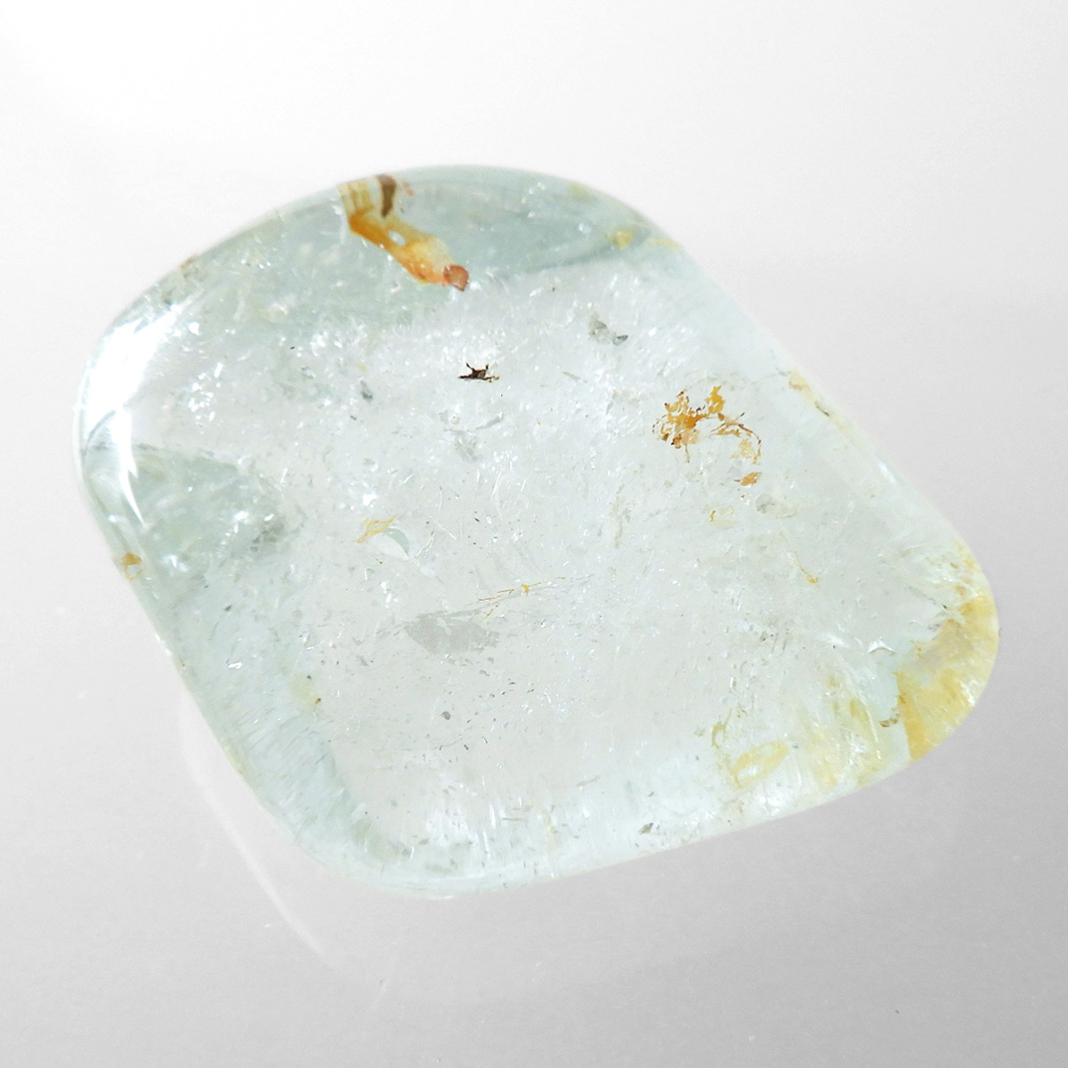 ブラジル産のブルートパーズ、タンブルです。トパーズは様々な色を持つ鉱物であり、和名を「黄玉(おうぎょく)」というように、本来は「黄色からオレンジ色」のトパーズがスタンダードなカラーとなっています。