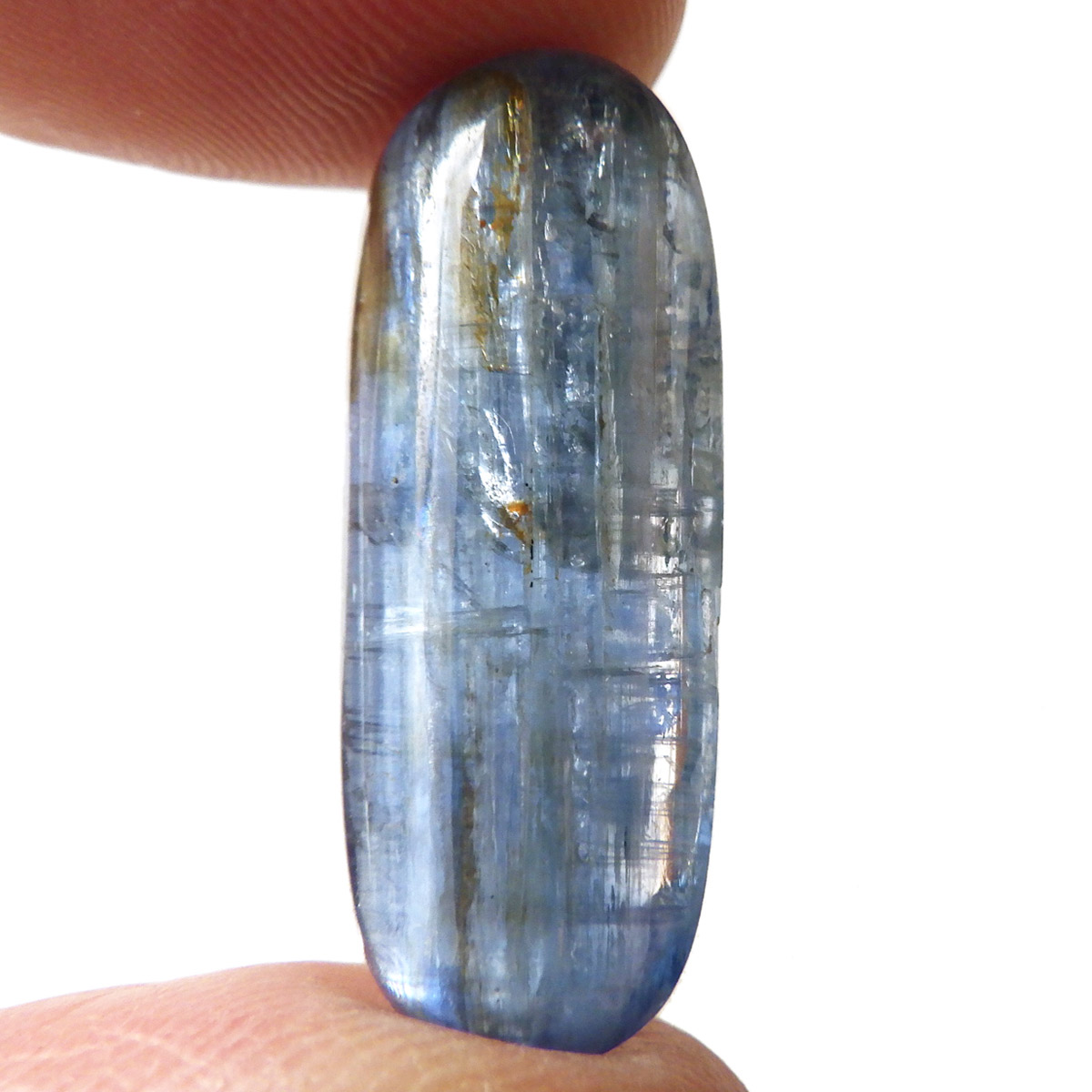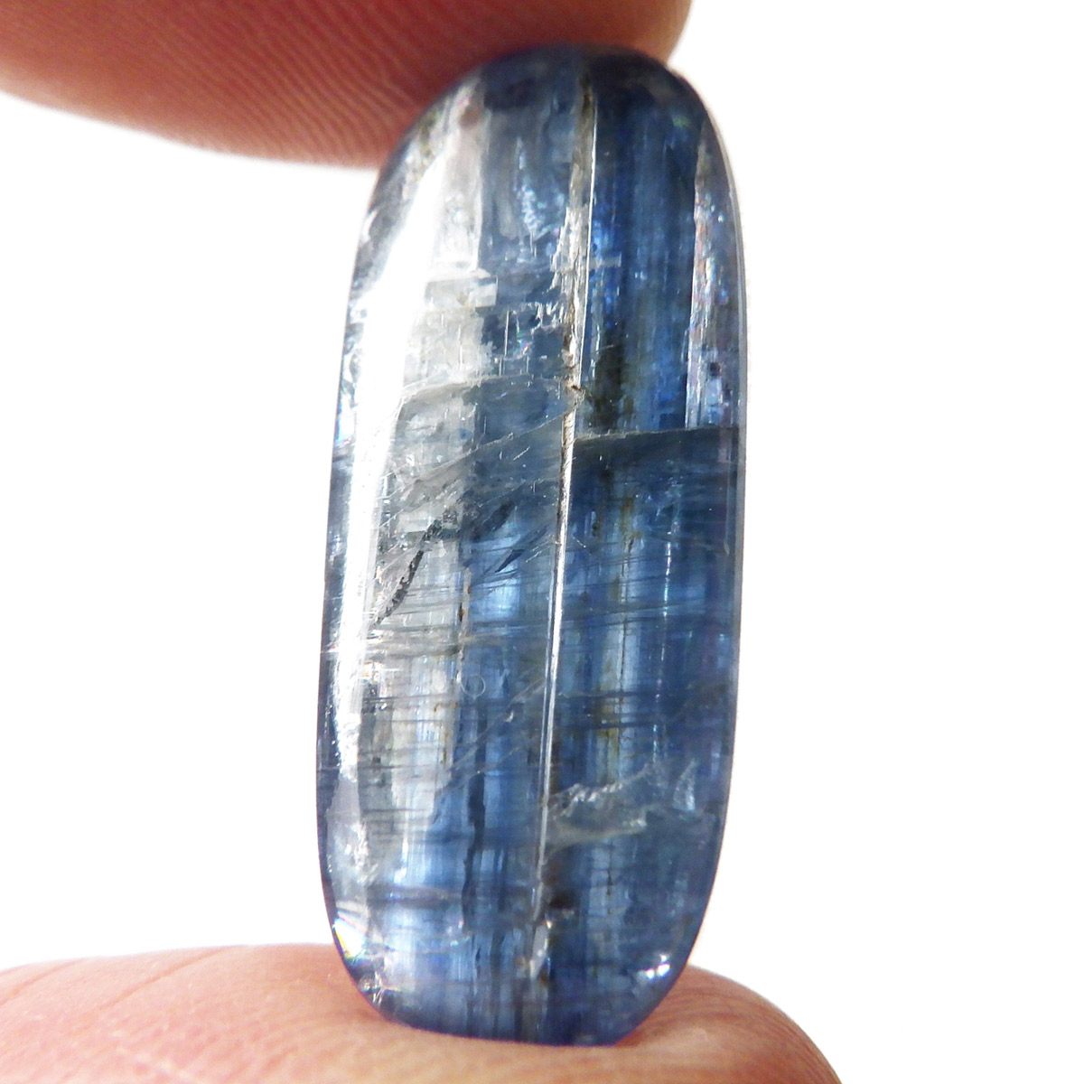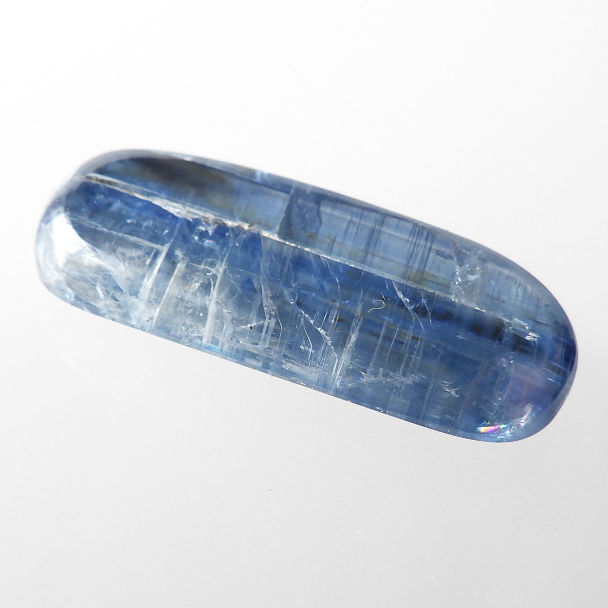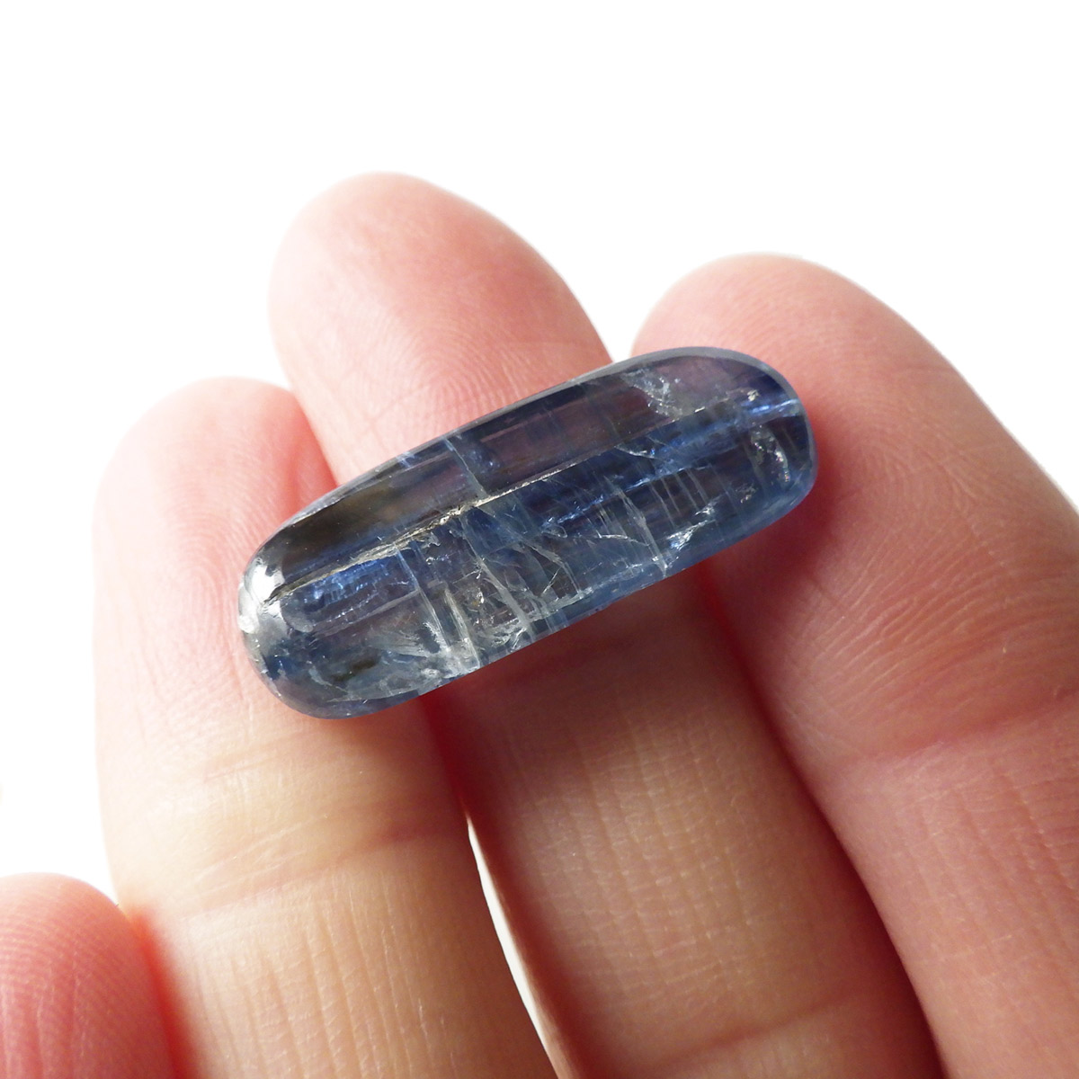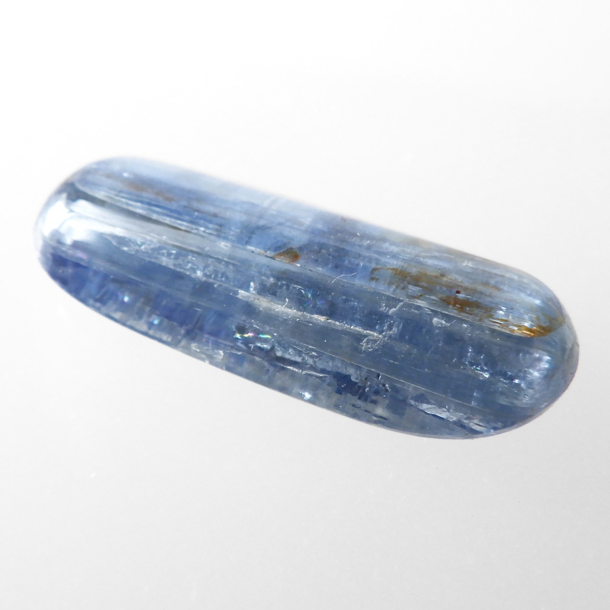 ネパール・ヒマラヤ産のカイヤナイト、タンブルです。カイヤナイトの独特のブルーは、サファイアと同じく、含まれる鉄とチタンが要因となっています。外見だけではブルーサファイアと見間違うこともあります。見た目にも一つの方向に繊維がはっきりと伸びている感じなのですが、カイヤナイトを磨いた玉等はまるで宇宙から見た地球を思わせるような、深く美しいブルーのグラデーションが美しい石です。