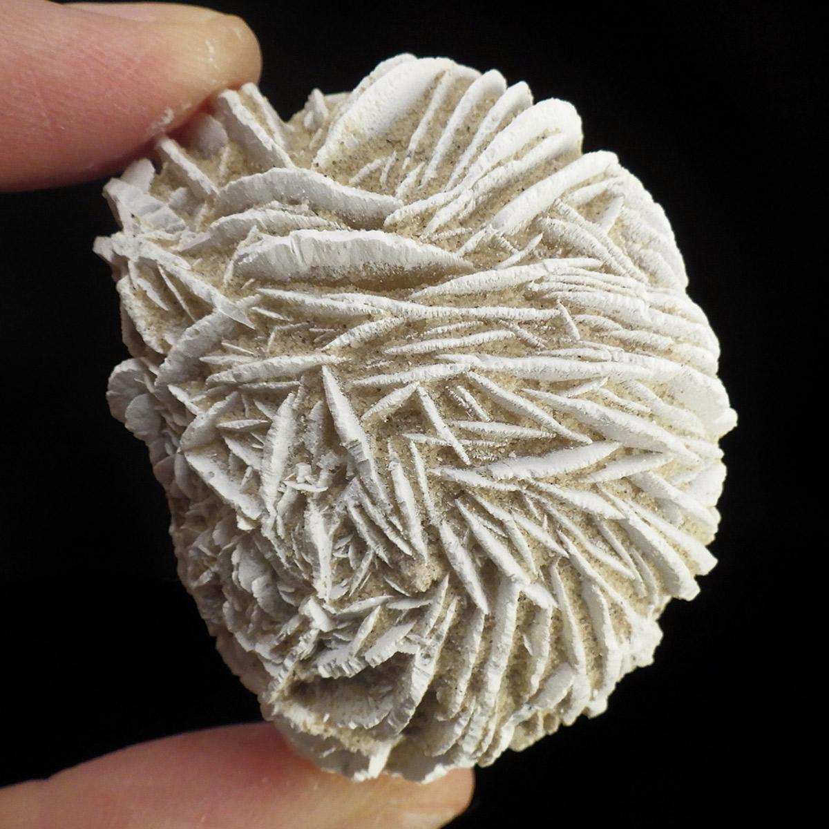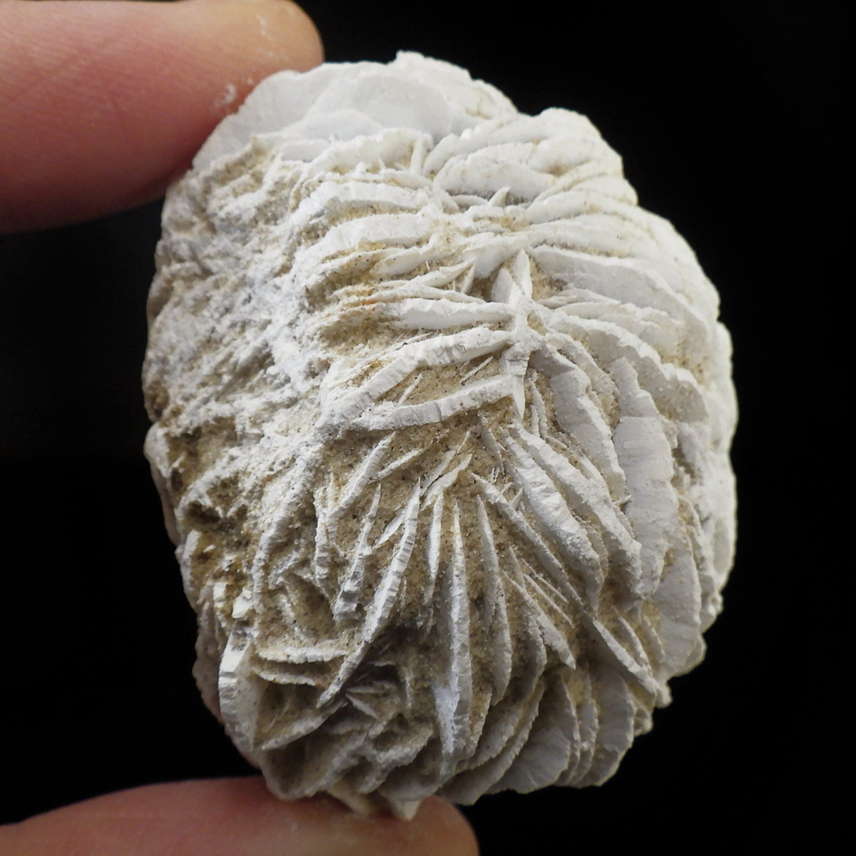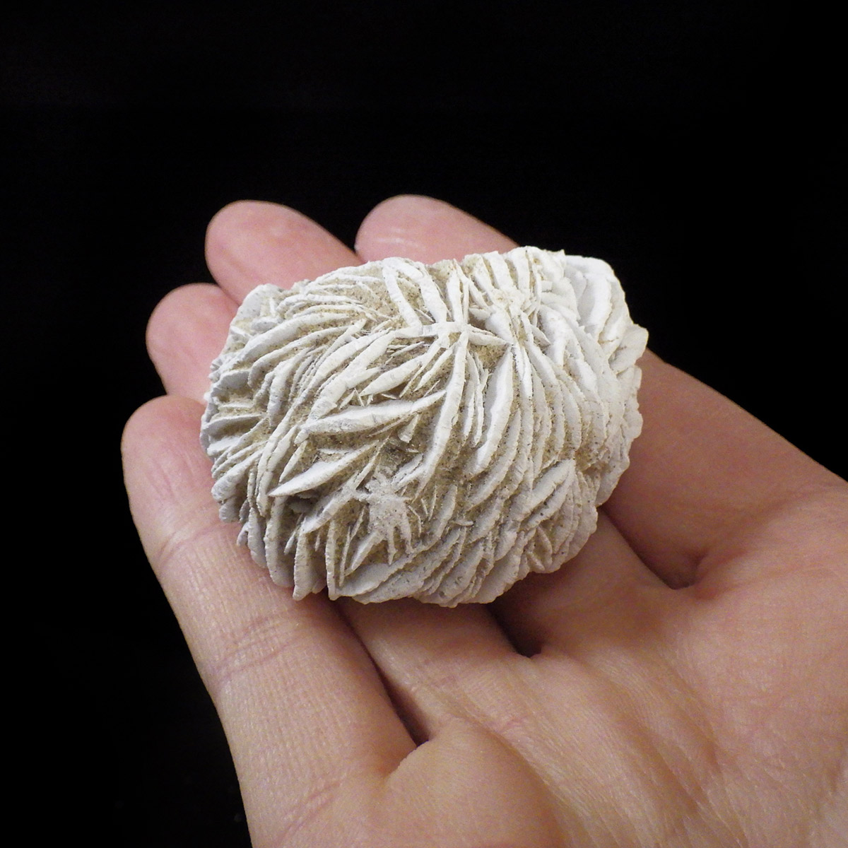 メキシコ産、デザートローズの原石です。手のひらに収まる大きさで形がかわいい結晶を厳選して集めました。デザートローズはジプサムを主成分とした砂漠で見つかる薔薇の花の形の結晶のことです。全体のフォルムとして見た目が丸っこく、細かいところまで織り成す結晶の美しさと神秘さが素敵です。