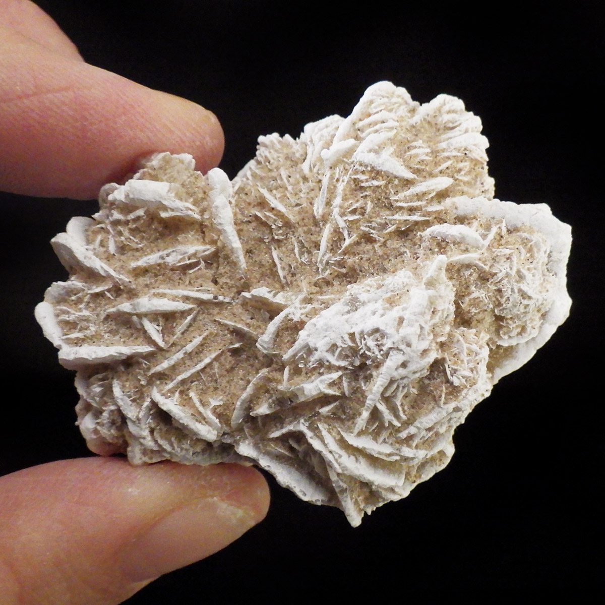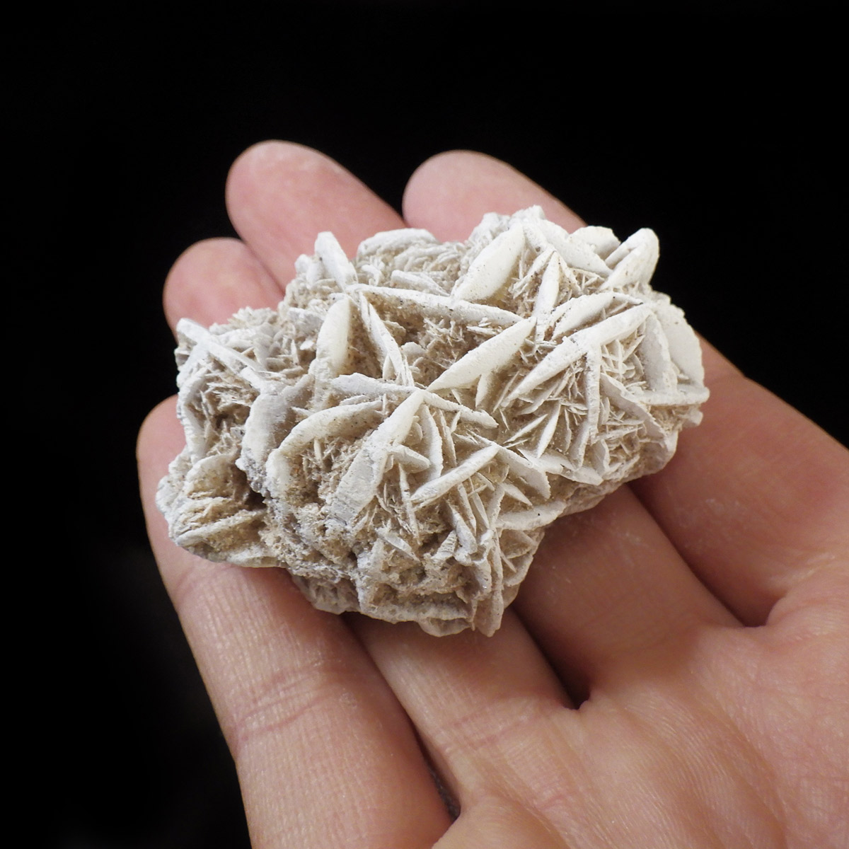 メキシコ産、デザートローズの原石です。手のひらに収まる大きさで形がかわいい結晶を厳選して集めました。デザートローズはジプサムを主成分とした砂漠で見つかる薔薇の花の形の結晶のことです。全体のフォルムとして見た目が丸っこく、細かいところまで織り成す結晶の美しさと神秘さが素敵です。
