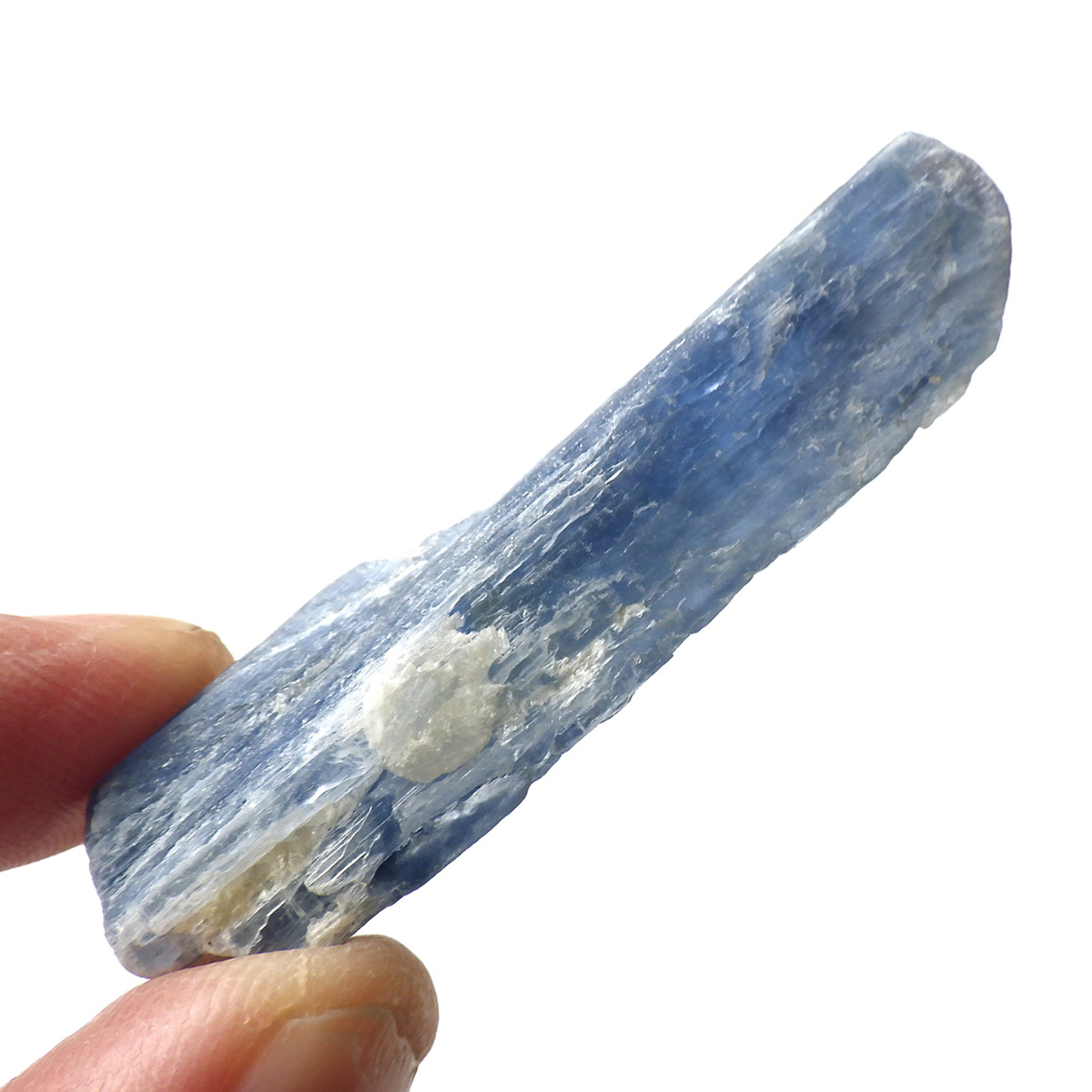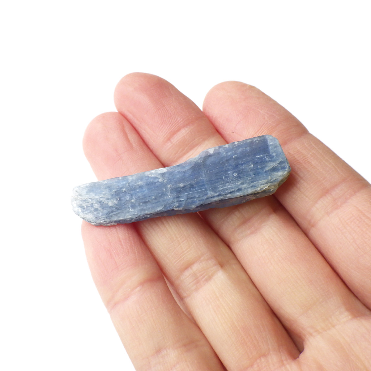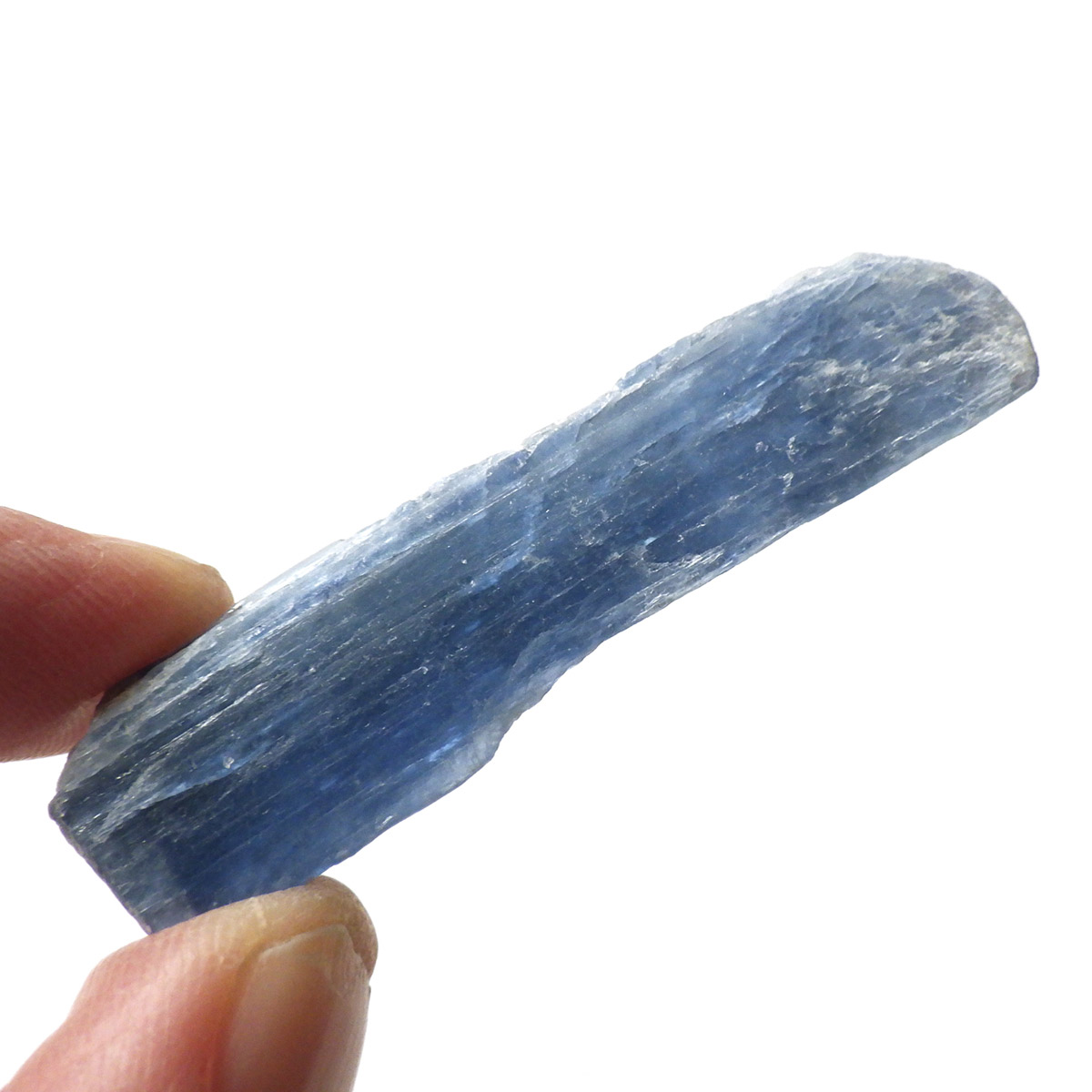 ブラジル産のカイヤナイト原石です。カイヤナイトはブルーと光沢がきれいな人気の鉱物です。柱状に伸びる結晶がうっとりする美しさを持っています。角度を変えると光を反射し、キラキラとした輝きが、これまた美しいです。