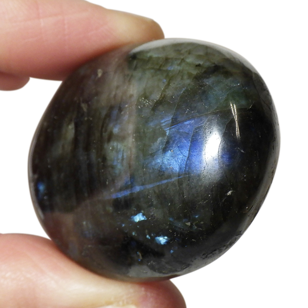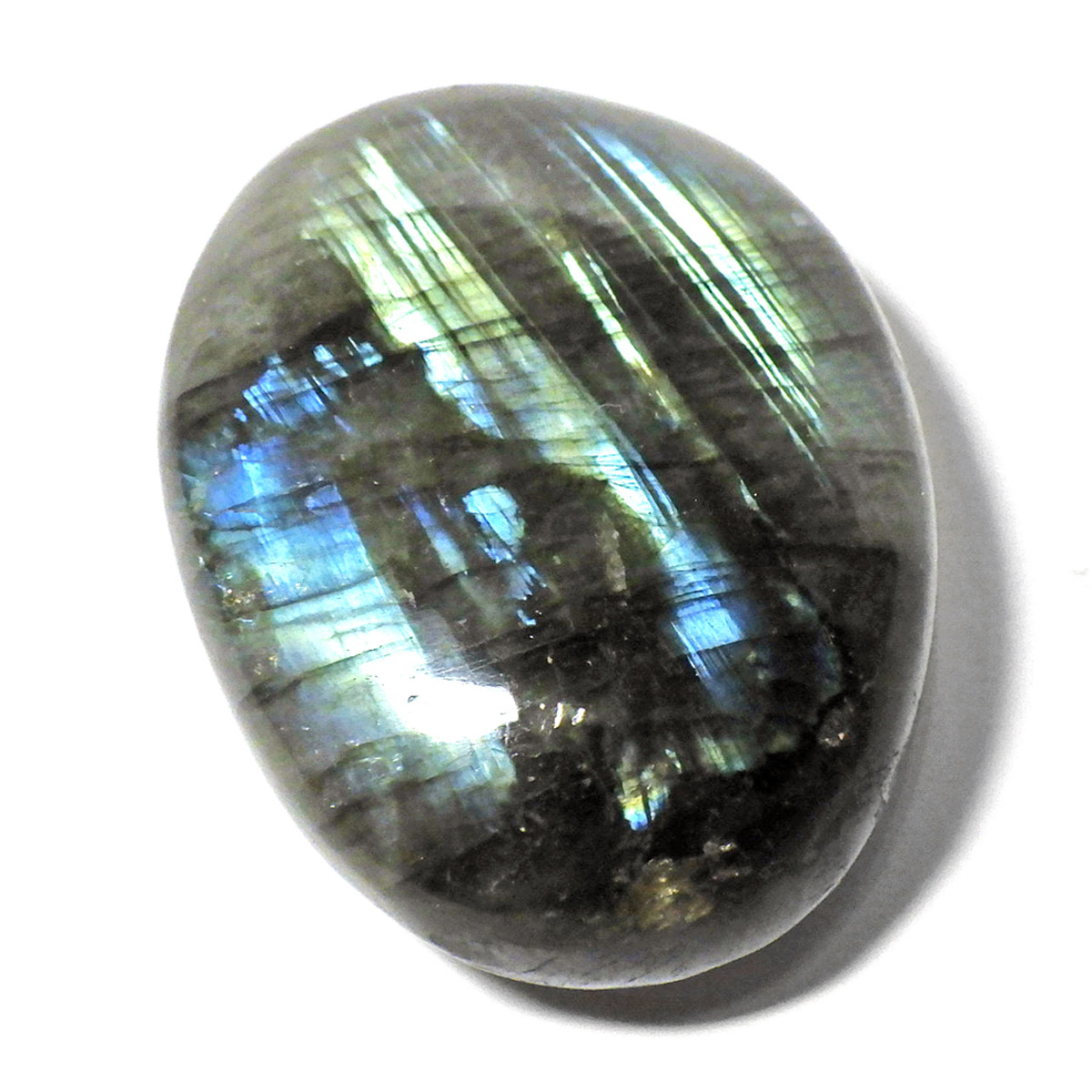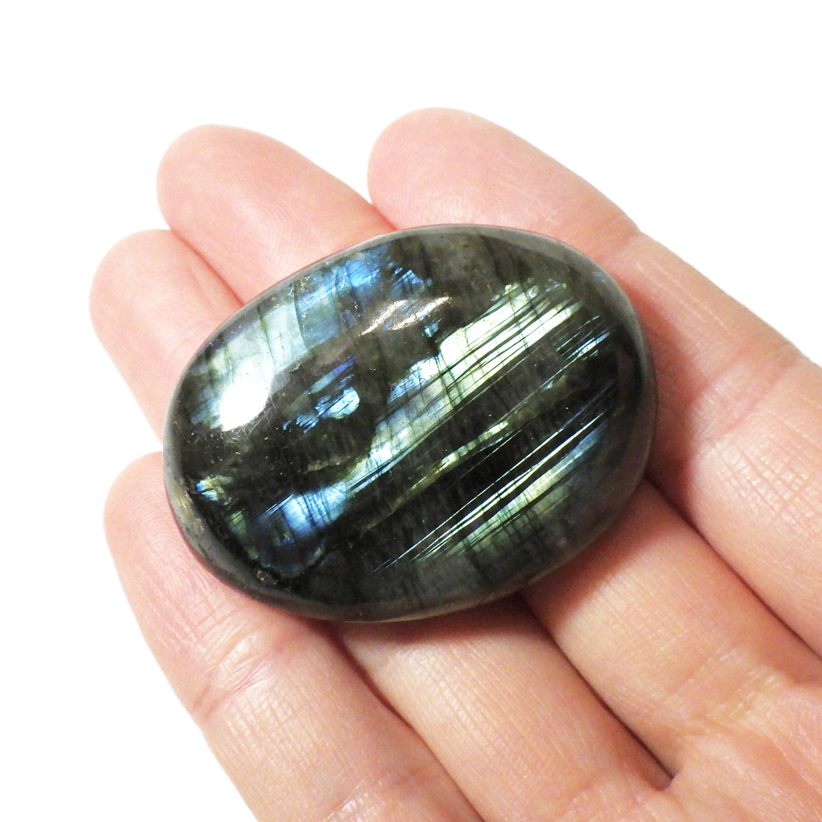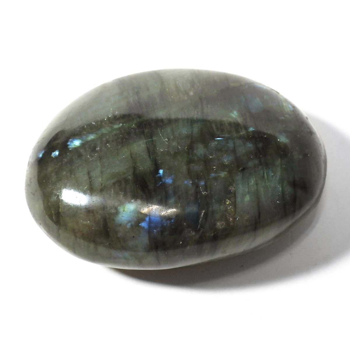 マダガスカル産のラブラドライト磨きペブルです。 見る角度によってオーロラのような色彩を変える美しい光を持つのが特徴です。 石自体はグレーなどの地味めな色合いをしていますが、そこに鮮やかな輝きが浮かび上がるところから「アゲハ蝶の羽」に例えられる事もある美しい石です。 ラブラドライトは、月・太陽を象徴するといわれています。根気強い実行力を養い、信念を貫けるよう導く力があるとされます。そして、直感力・洞察力・創造性を高めてくれるでしょう。自信を失いかけた時に、生まれた意味・生きる意味を気づかせるサポートをしてくれ、生きる力を引き出してくれるといわれています。