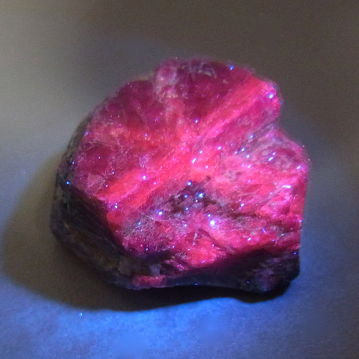 マダガスカル産サファイア、原石です。 サファイアといえば、深く美しいブルーが宝飾品として世界中で古くから愛されている石です。サファイアの中でも赤いものだけルビーと呼ばれます。こちらはサファイアですがルビーのような蛍光性がある珍しいものです(写真の波長は365nm)。質の良いサファイアは通常宝石に加工されますが、透明感のないものはタンブルやビーズ、あるいは光学ガラスや金属の研磨剤などに加工されます。ダイヤモンドに次ぐ硬さの鉱物であるサファイアの原石、コレクションにいかがでしょうか。