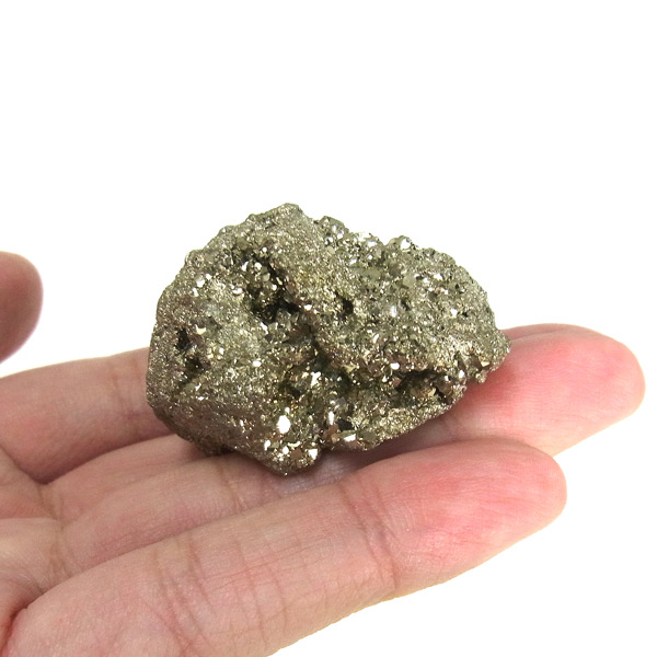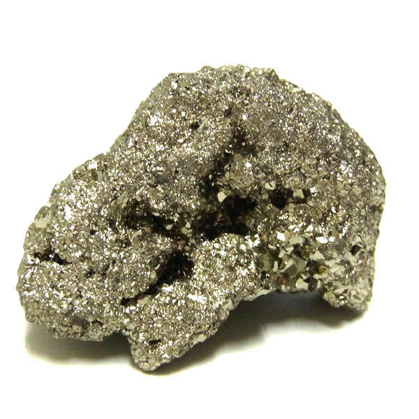 ペルー産のパイライト原石です。コロッとかわいらしいサイズでキラキラが信じられないほどまぶしい原石。パイライトは、火山活動の活発な場所で生成されます。結晶は大変整った六面体や八面体です。金と間違えるほどのゴールドで、硫黄と鉄で構成された鉱物の一種です。