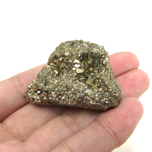ペルー産のパイライト原石です。コロッとかわいらしいサイズでキラキラが信じられないほどまぶしい原石。パイライトは、火山活動の活発な場所で生成されます。結晶は大変整った六面体や八面体です。金と間違えるほどのゴールドで、硫黄と鉄で構成された鉱物の一種です。