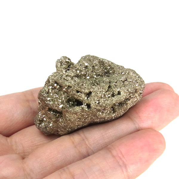 ペルー産のパイライト原石です。コロッとかわいらしいサイズでキラキラが信じられないほどまぶしい原石。パイライトは、火山活動の活発な場所で生成されます。結晶は大変整った六面体や八面体です。金と間違えるほどのゴールドで、硫黄と鉄で構成された鉱物の一種です。