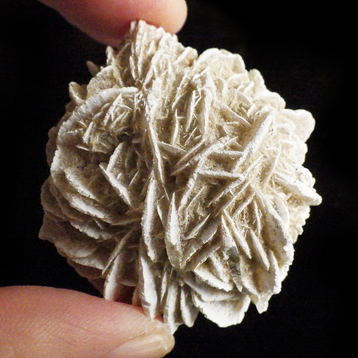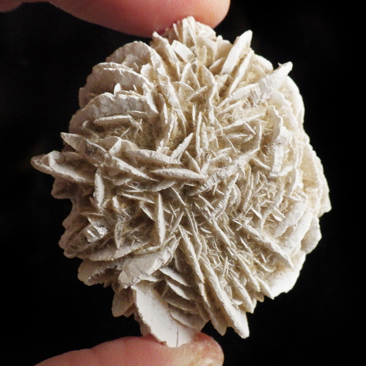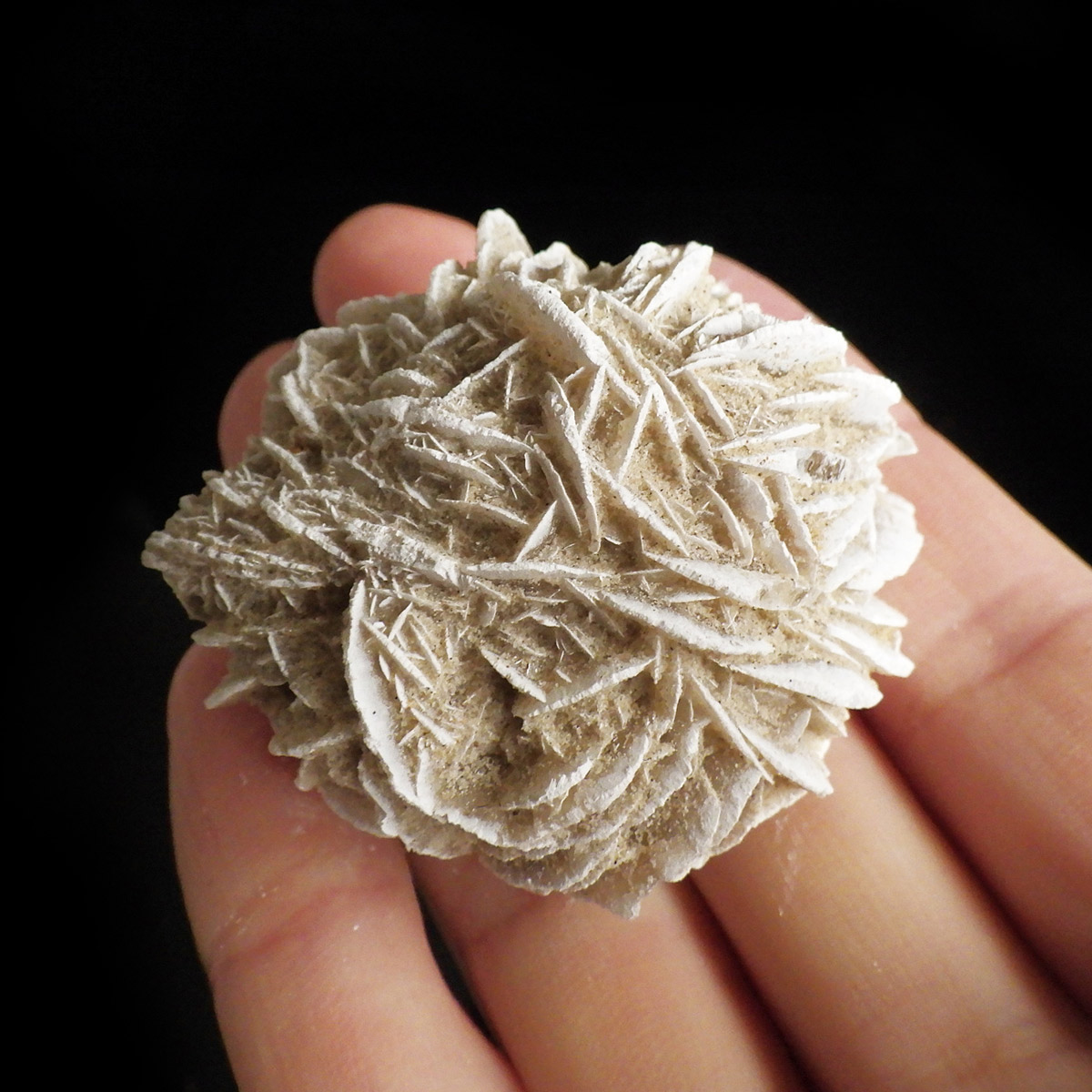 メキシコ産、デザートローズの原石です。手のひらに収まる大きさで形がかわいい結晶を厳選して集めました。デザートローズはジプサムを主成分とした砂漠で見つかる薔薇の花の形の結晶のことです。全体のフォルムとして見た目が丸っこく、細かいところまで織り成す結晶の美しさと神秘さが素敵です。