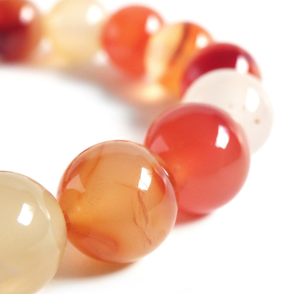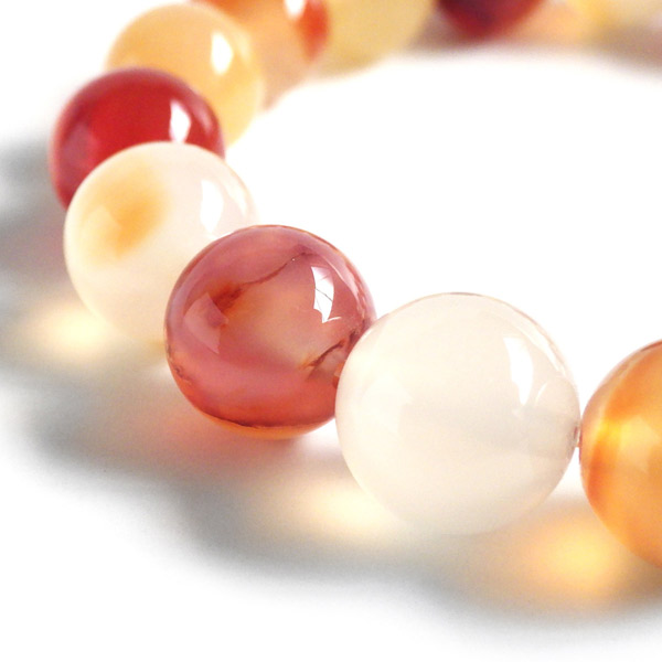 カーネリアンの10mm玉を使用した天然石ブレスレットです。カルセドニーの中で赤みが強く、オレンジ色のものをカーネリアンと呼びます。明るいカラーで透明感があり、とてもかわいいブレスレットに仕上がっていますよ。天然石ならではのマルチなカラーもワンポイントです。