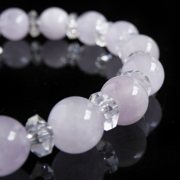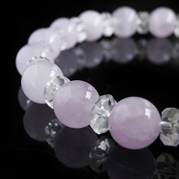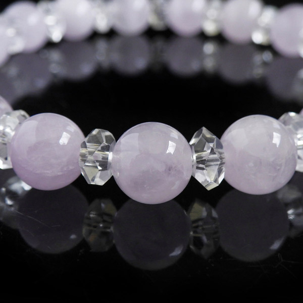 ラベンダーアメジストの8mm玉と水晶のボタンカットを使用した天然石ブレスレットです。アメジストは和名で紫水晶というように、鉄イオンの影響により紫に色付いた水晶のことです。ラベンダーアメジストは色味が淡いパープルのアメジストのことで、優しいパープルがかわいらいいブレスレットに仕上がっていますよ。