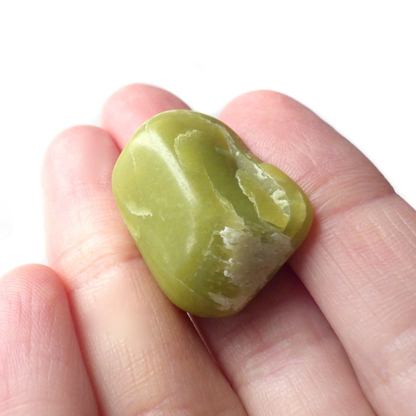 アメリカ・ワシントン州産のワシントンサーペンティン(ヒーラーライト)、タンブルです。 ワシントンサーペンティン(ヒーラーライト)は、明るいライムグリーン色をしており、やわらかな感触があります。 パッと見た感じは黄色の印象が強いと思いますが、良く見てみると黄色ではなくもっと複雑で独特の色合いをしていることが分かります。 アメリカの北西部で新しく発見されたケイ酸マグネシウムで、マグネサイト鉱脈から、マグネサイトと一緒に発掘されます。
