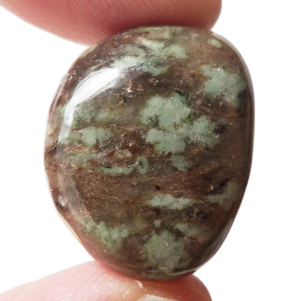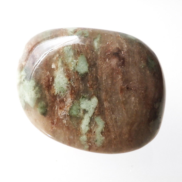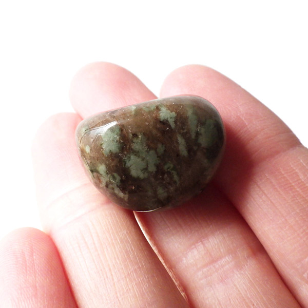 オーストラリア産のナンドライト、タンブルです。ナンドライトはオーストラリア・ニューサウスウェールズ州の小さな町ナンドルが産地である、希少であまり知られていない岩石です。ナンドライトという名前は、この産地に由来しています。ナンドライトの本質的な分類はエジリン閃長岩(エジリン・サイアナイト)にあたります。茶色やベージュ系のサイアナイト母岩の中に、深いグリーンのエジリンがドット状に散りばめられており、その独特な模様と色合いが非常に魅力的です。